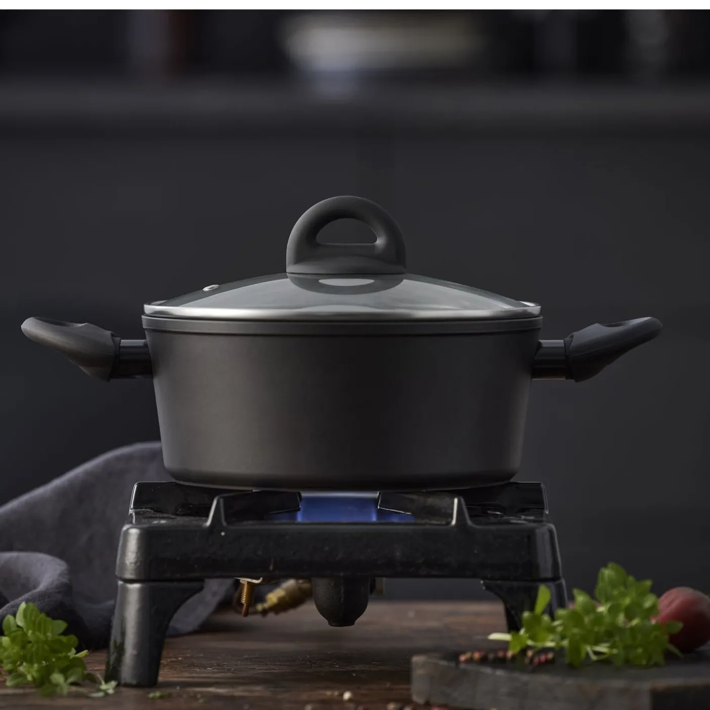 Ceramica hedder denne her gryde med låg – en tyk-bundet gryde med gode og kraftige håndtaget fremstillet i bakelit.