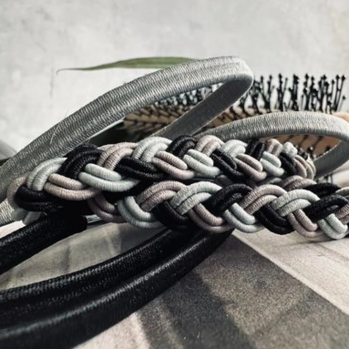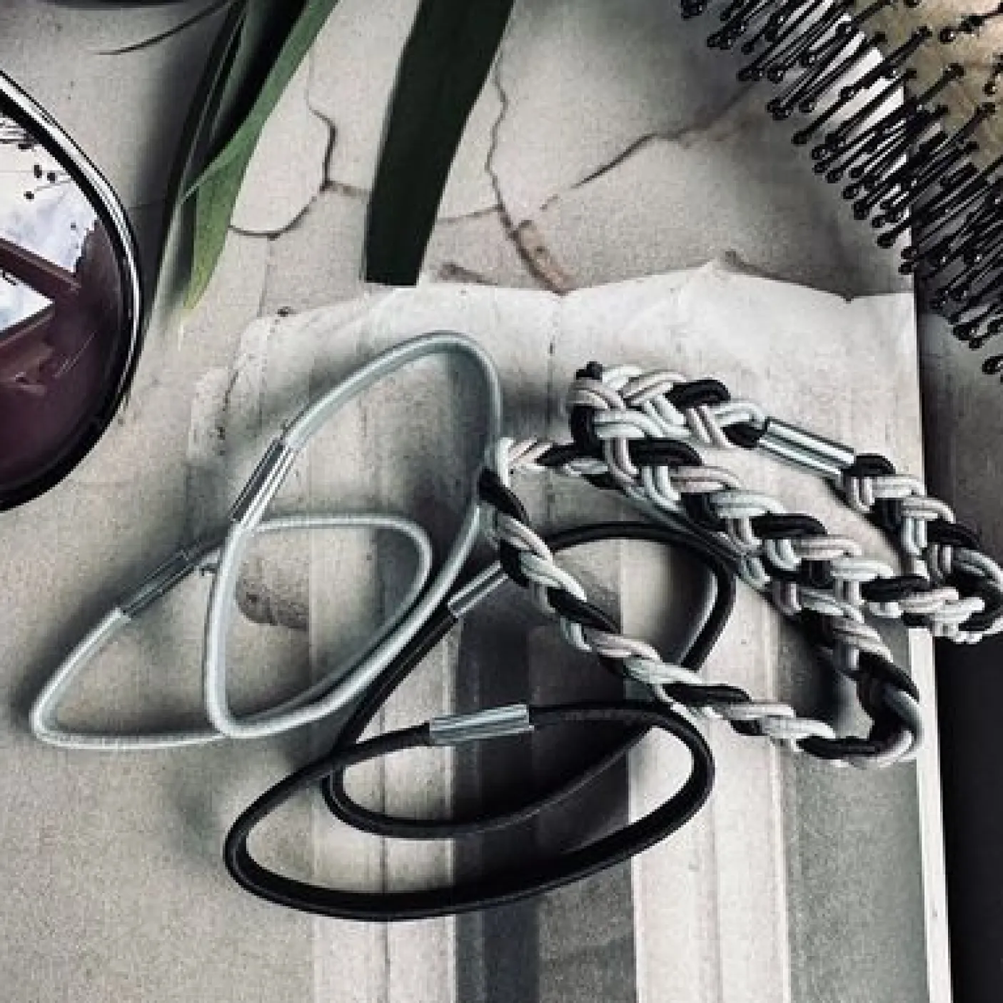 Hårelastikkerne er lavet i polyester og har et struktur/vævet mønster, der giver dem et mere tekstilt udtryk end helt glatte elastikker. Farverne holdes i sort og grå for et klassisk, roligt helhedsindtryk.