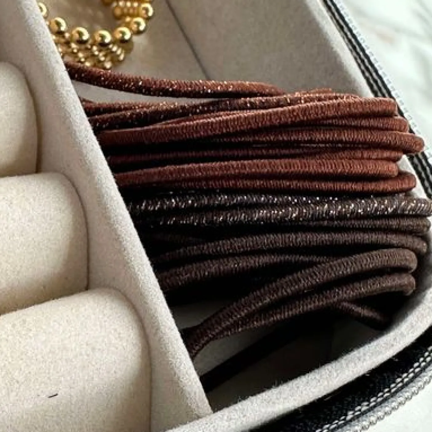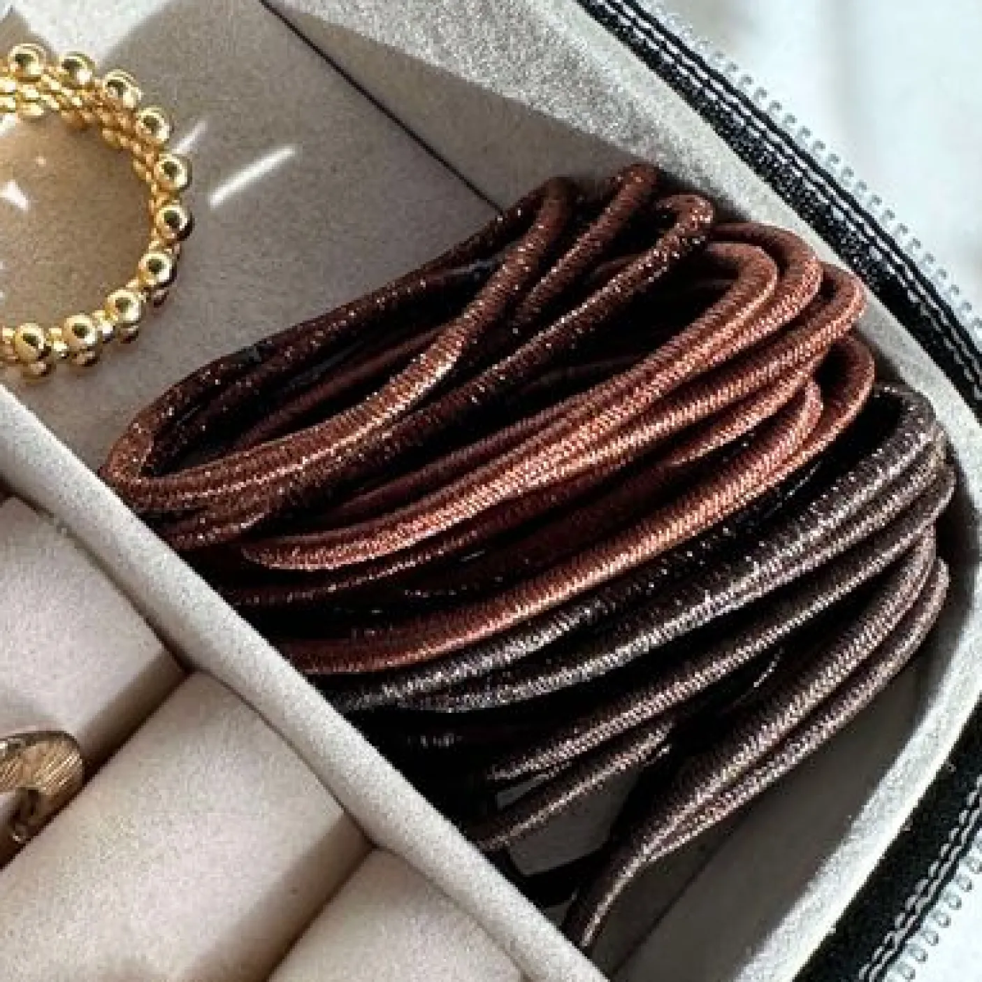 Hårelastikker Brown Glitter Mini – 4 mix er et sæt med mini hårelastikker i brune nuancer. De tynde elastikker har et ensfarvet udtryk med glitterlook, som giver et fint, diskret spil i håret. Elastikkerne er uden metalspænder.
