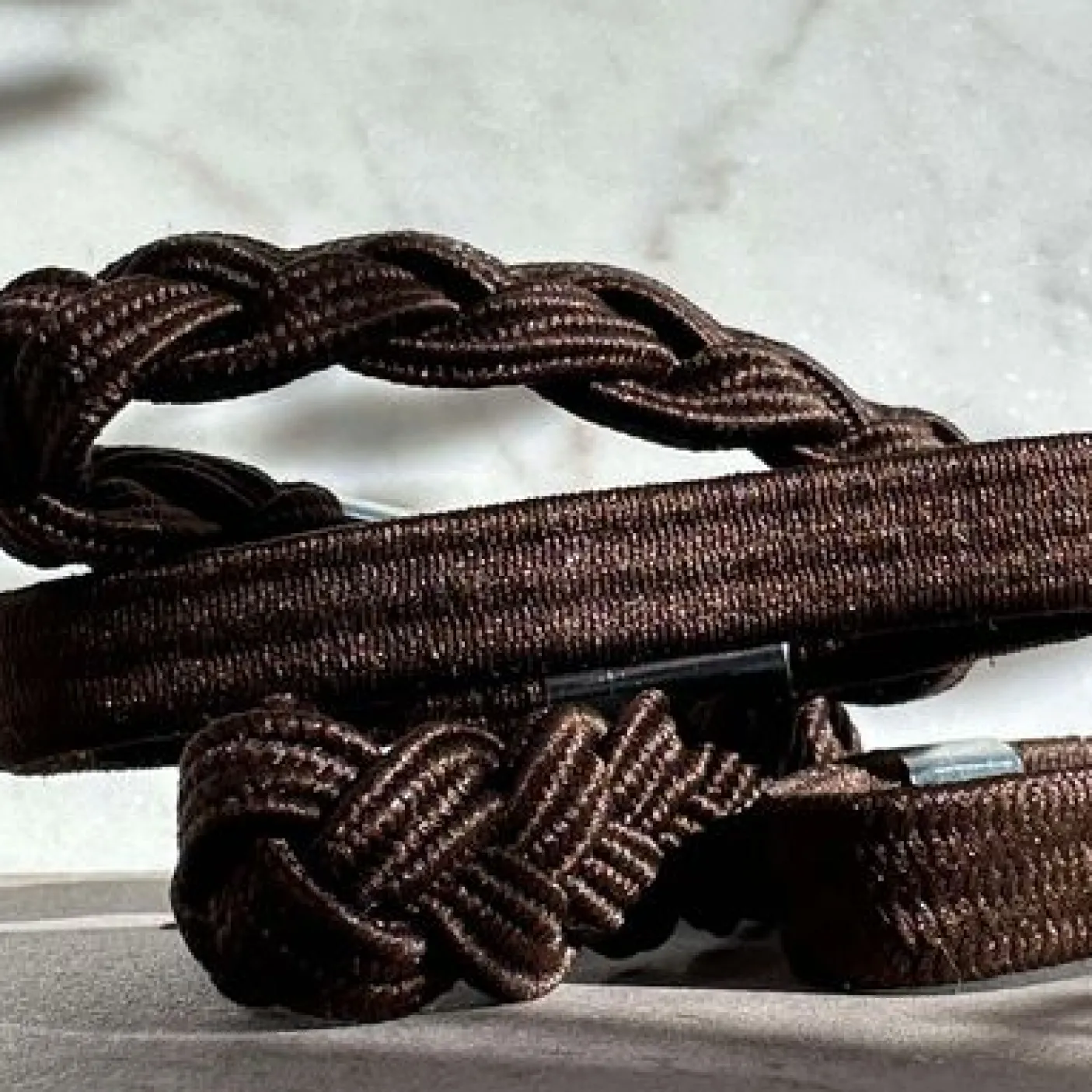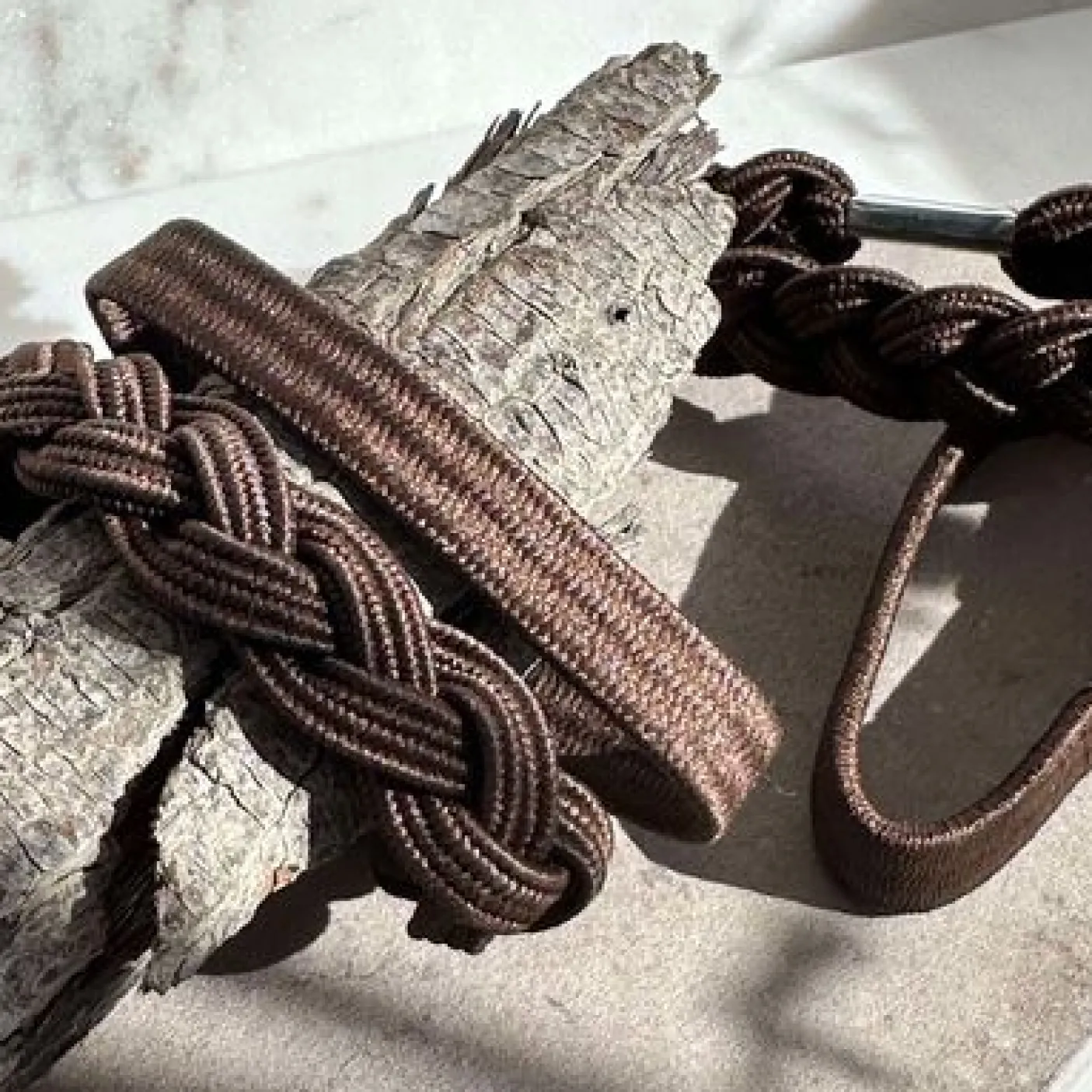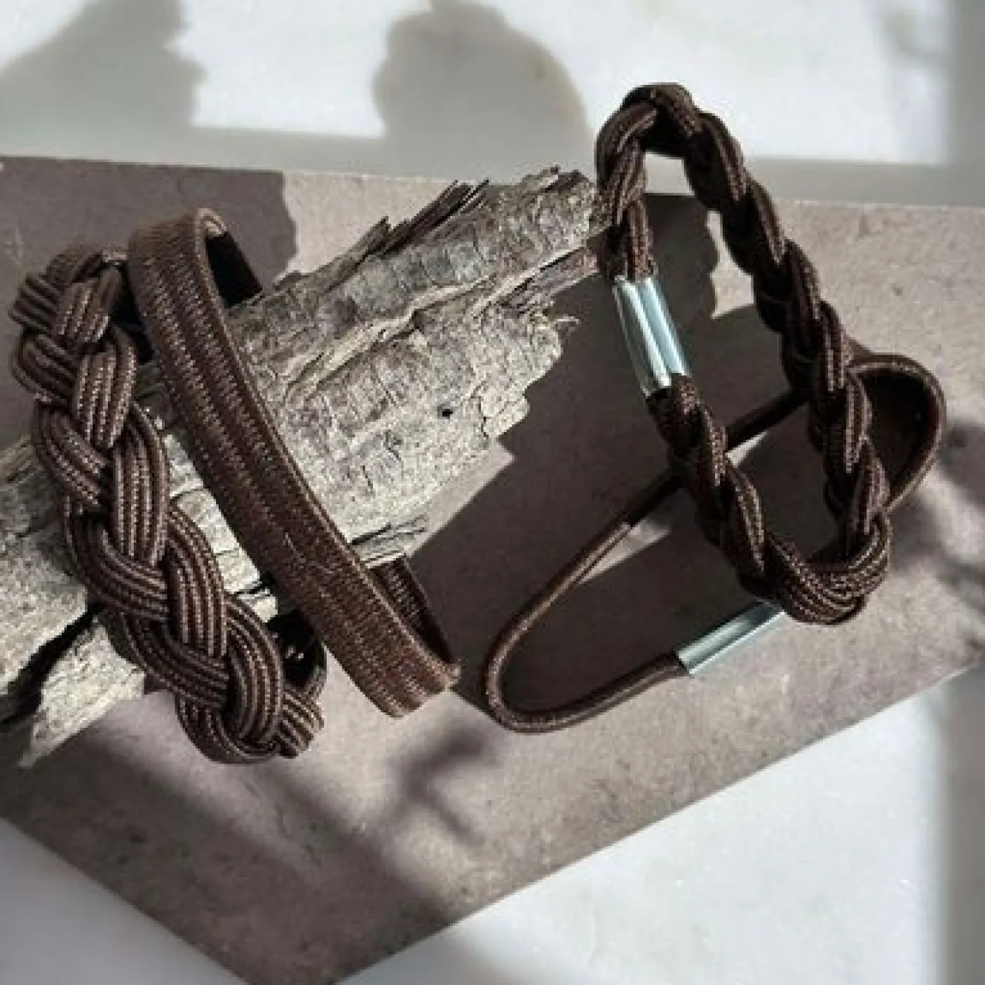 Hårelastikkerne er udført i metal og har et struktur/vævet mønster i fletdesign. Den brune farve gør dem nemme at matche med både neutrale og varme toner.