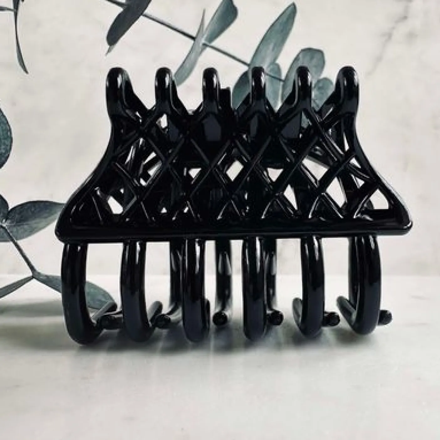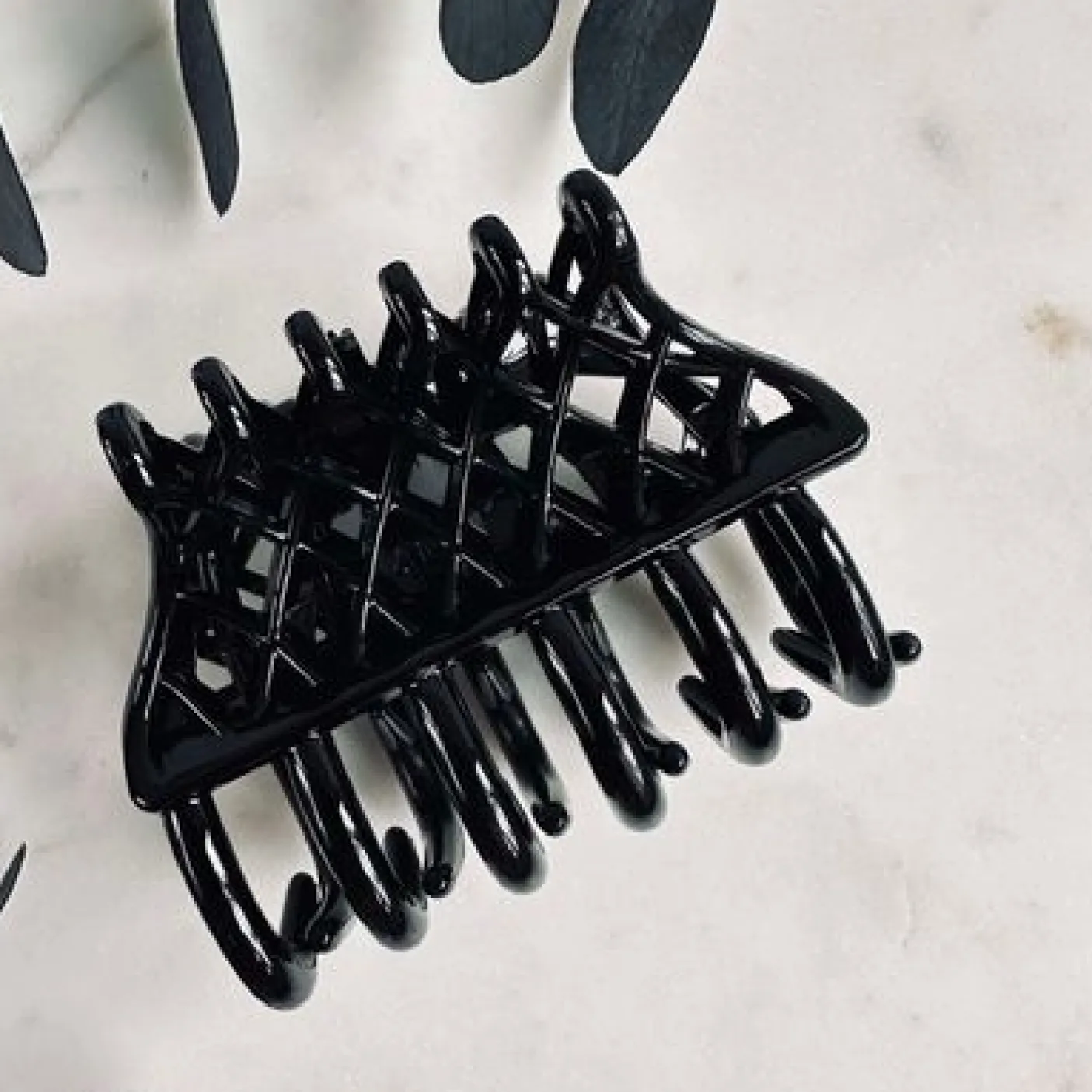 Klemmen er fremstillet i plast og har en blank finish, som fremhæver den sorte farve på en diskret, men iøjnefaldende måde. En fin detalje, når du vil samle håret hurtigt og stadig holde et gennemført udtryk.