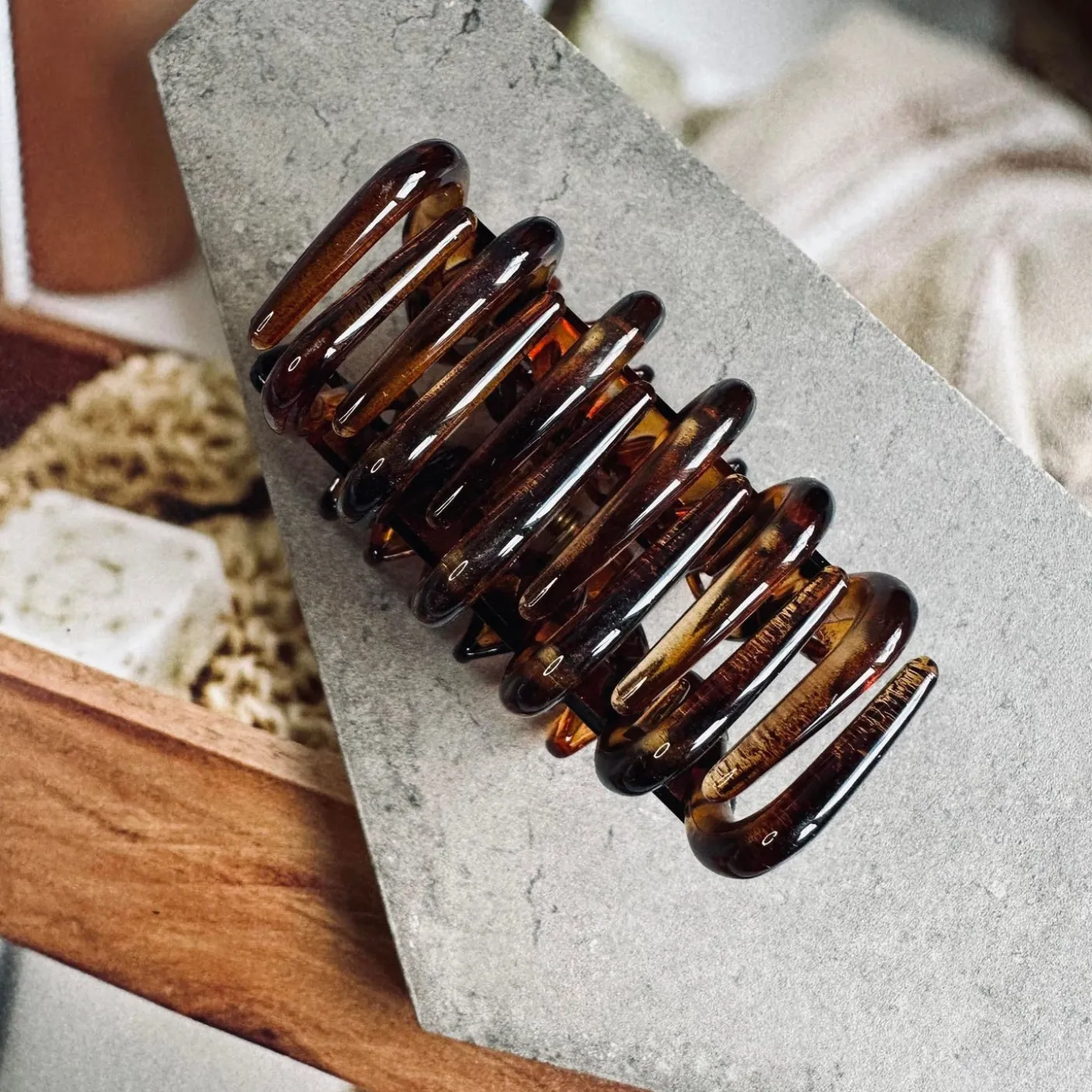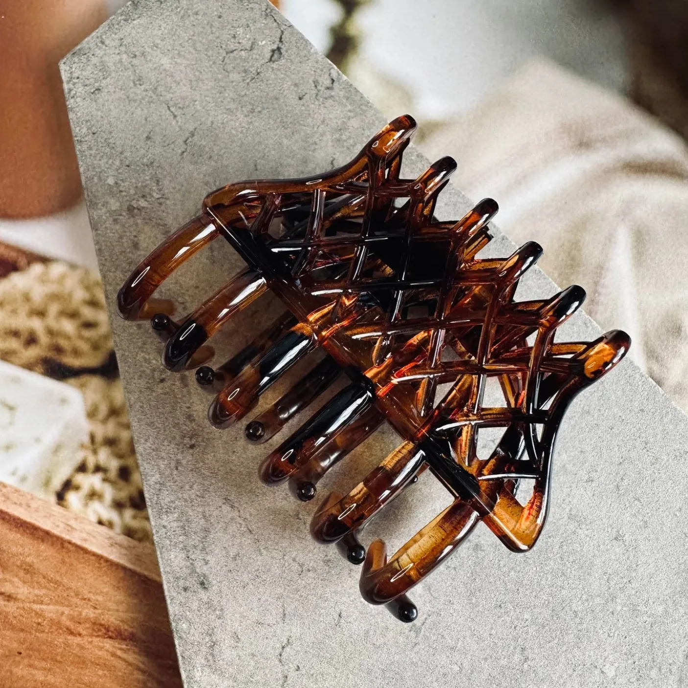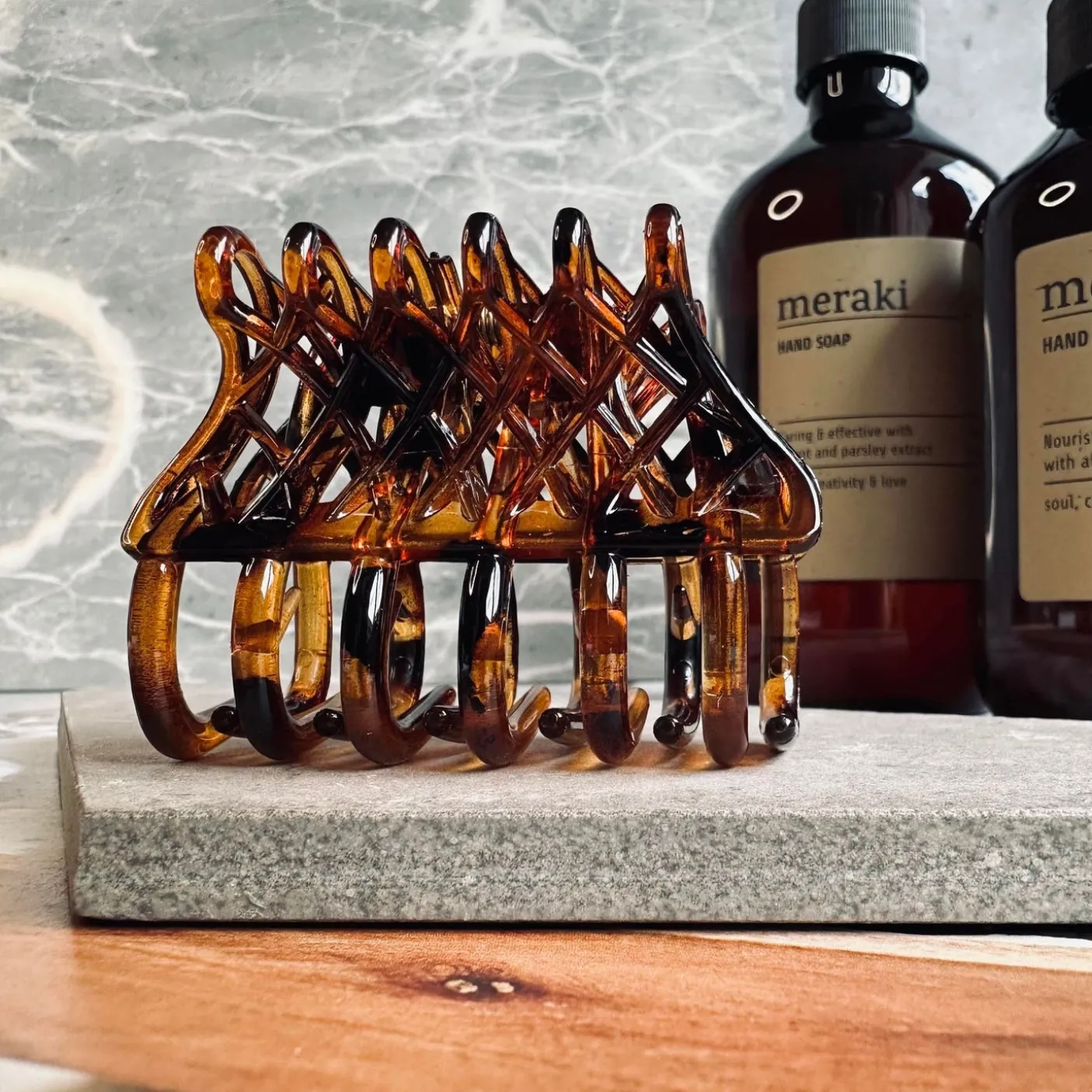 Hårklemme Gaisa brown er en enkel hårklemme i varme brune nuancer med et roligt, ensfarvet udtryk. Den er fremstillet i plast og har en størrelse, der gør den nem at have med i tasken til hurtig styling i hverdagen.