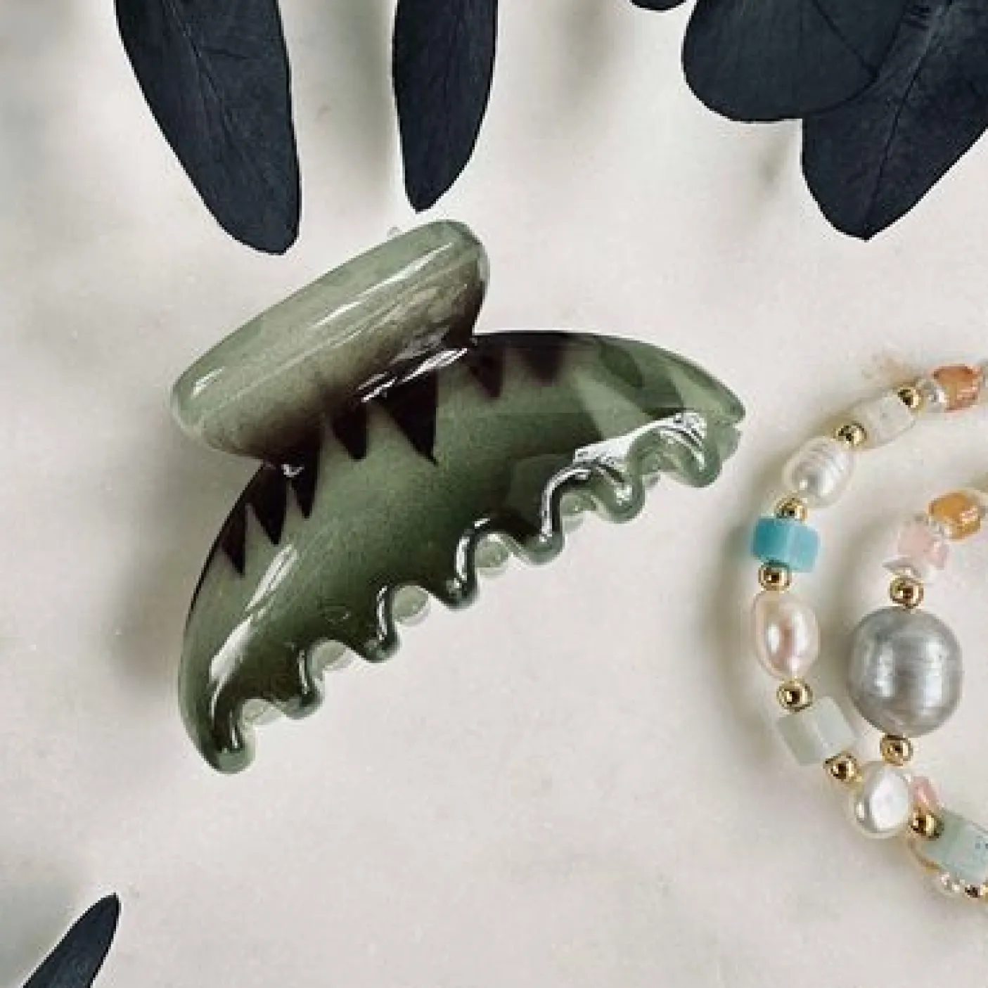 Hårklemme Ivy – Green er en dekorativ hårklemme i grønne nuancer, der giver et enkelt, men iøjnefaldende udtryk i håret. Det grafiske/geometriske mønster gør den nem at style, uanset om du går efter et roligt look eller vil tilføje lidt ekstra til din frisure.