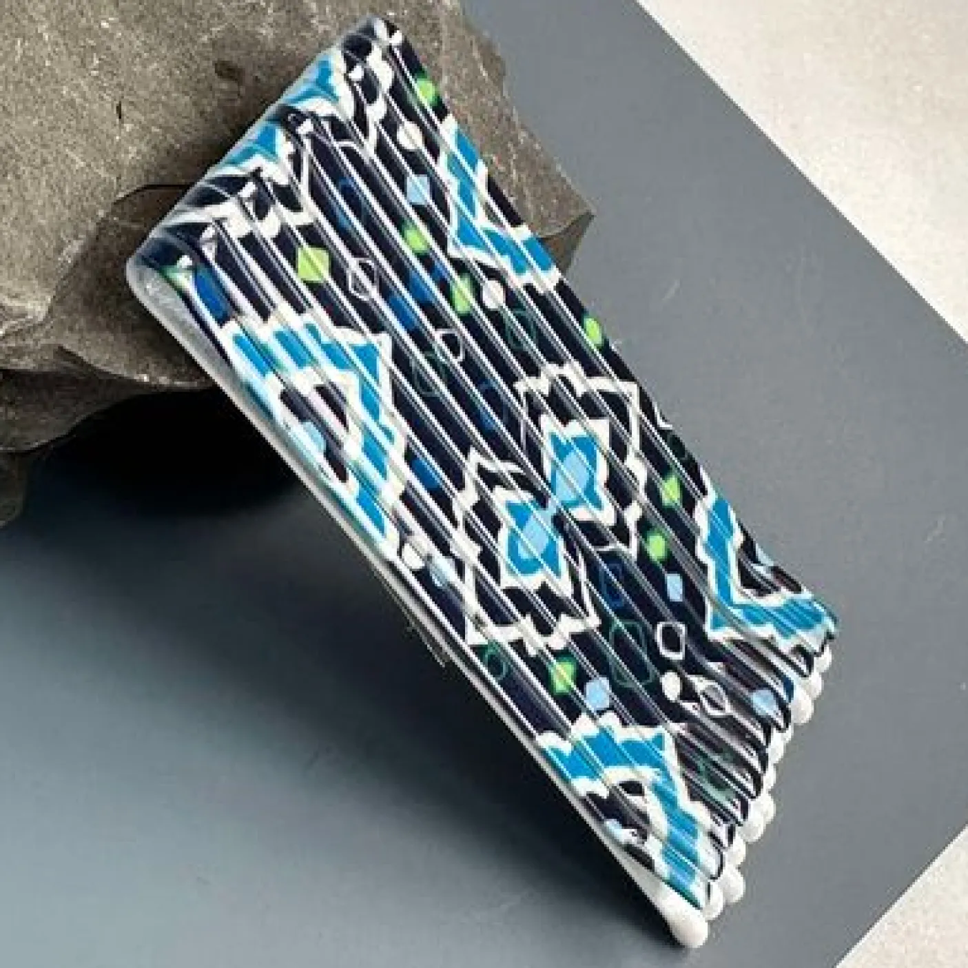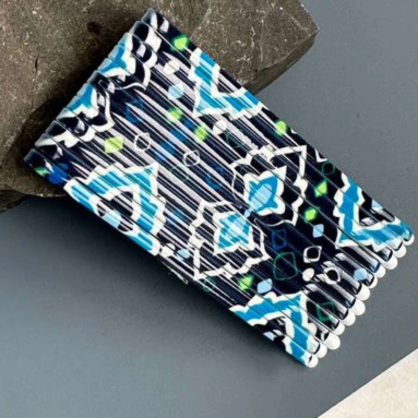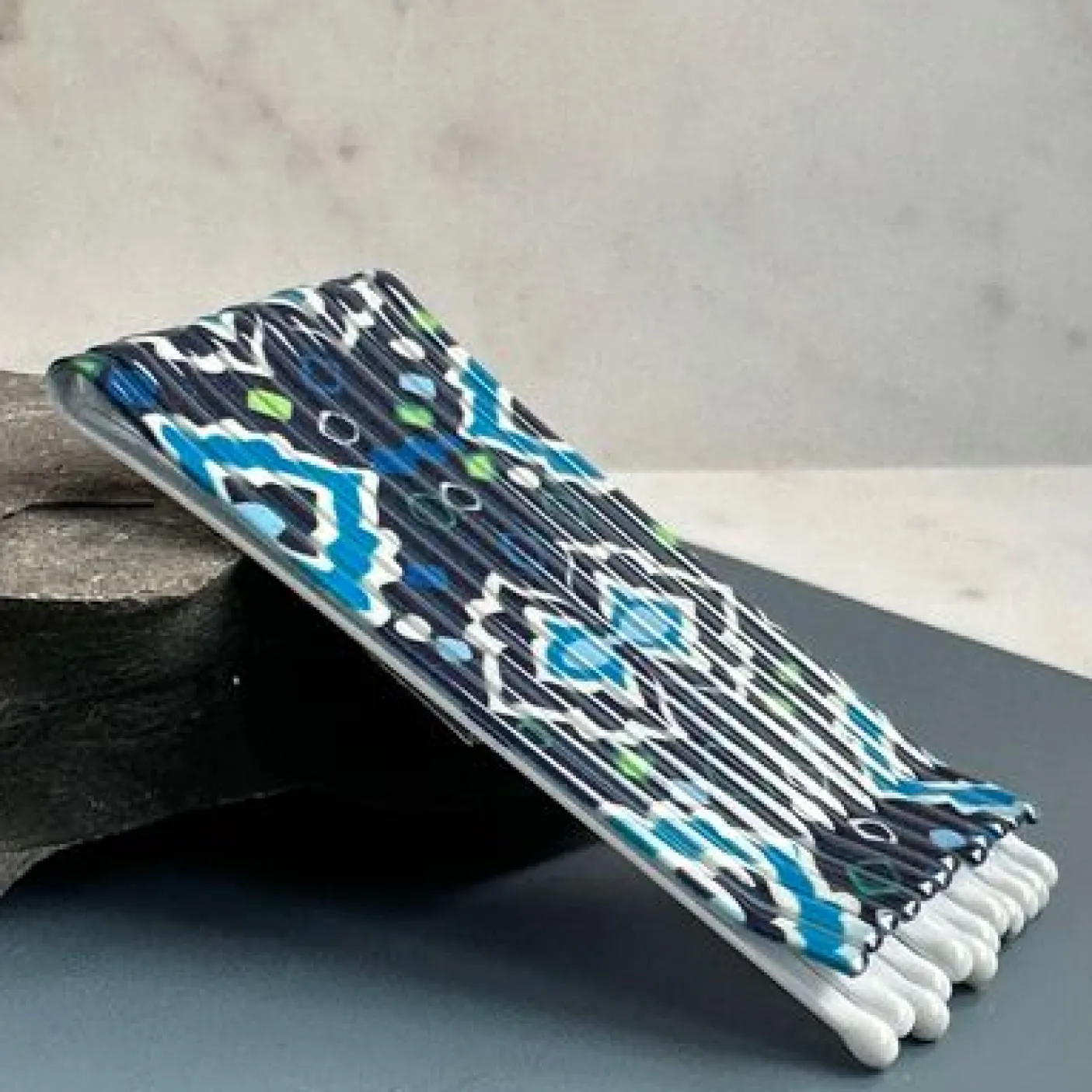 Hårnåle Blue er et sæt med 12 flotte hårnåle med et smukt grafisk/geometrisk mønster i blå nuancer. De er velegnede som enkel hårpynt, når du vil samle håret og samtidig tilføje et diskret, dekorativt udtryk.