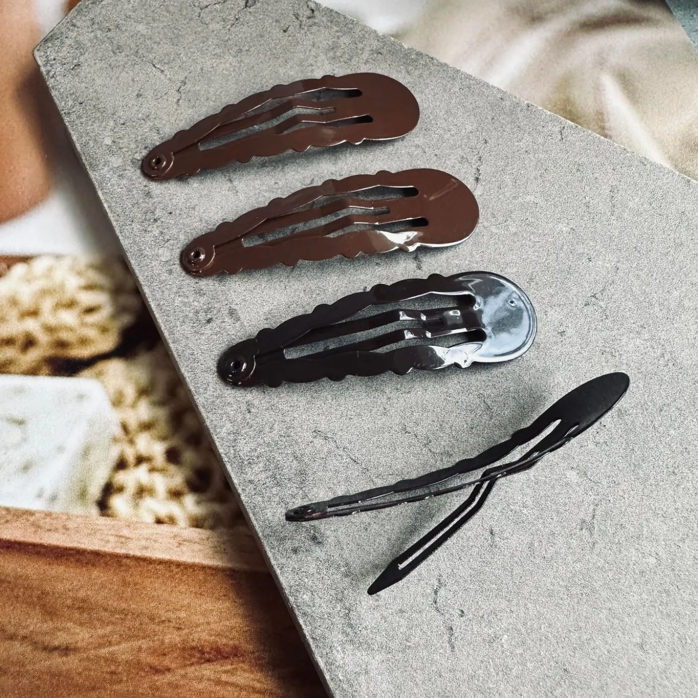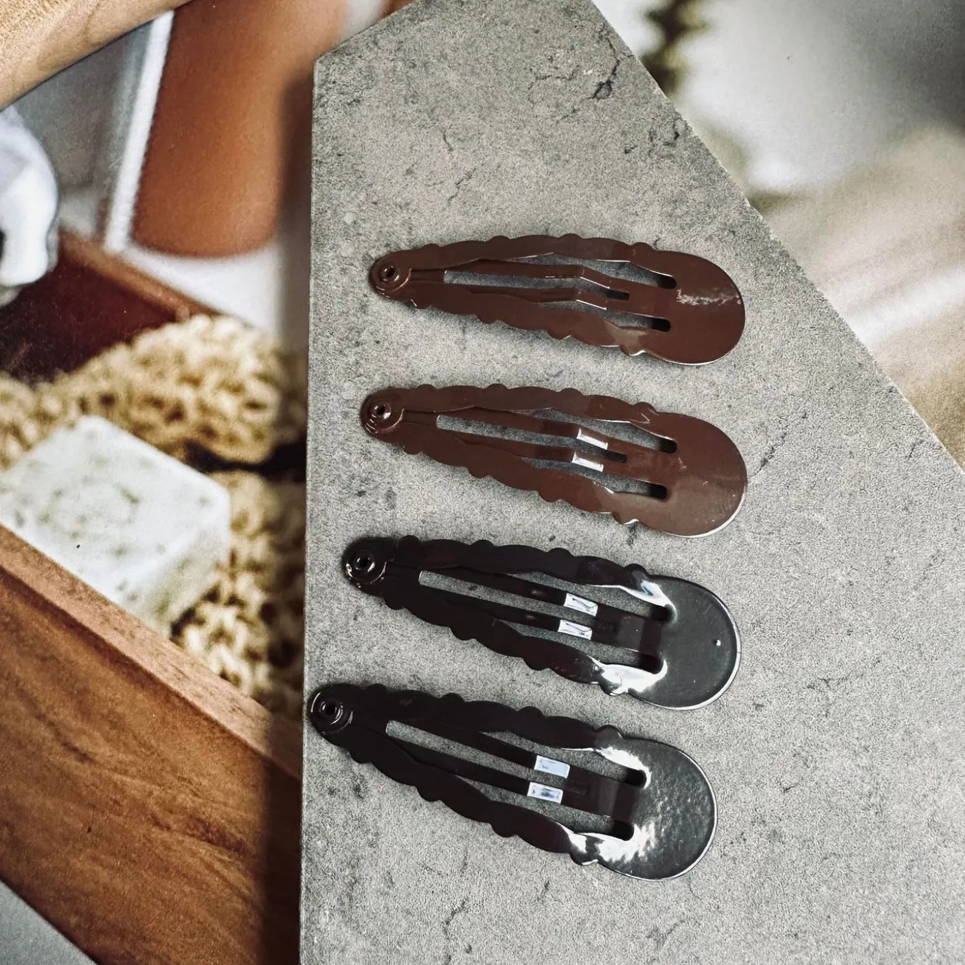 Hårspænderne er fremstillet i plast og har et ensfarvet look i brun. Den neutrale farve giver et klassisk udtryk, der passer fint til både hverdags- og mere enkle, stylede looks.