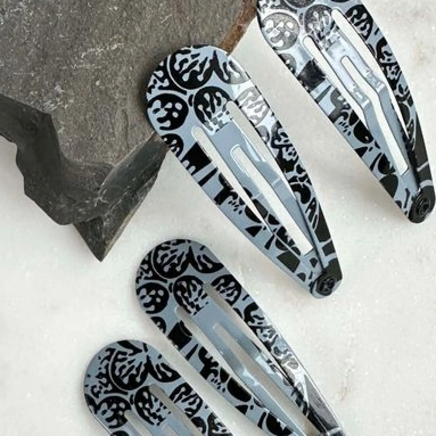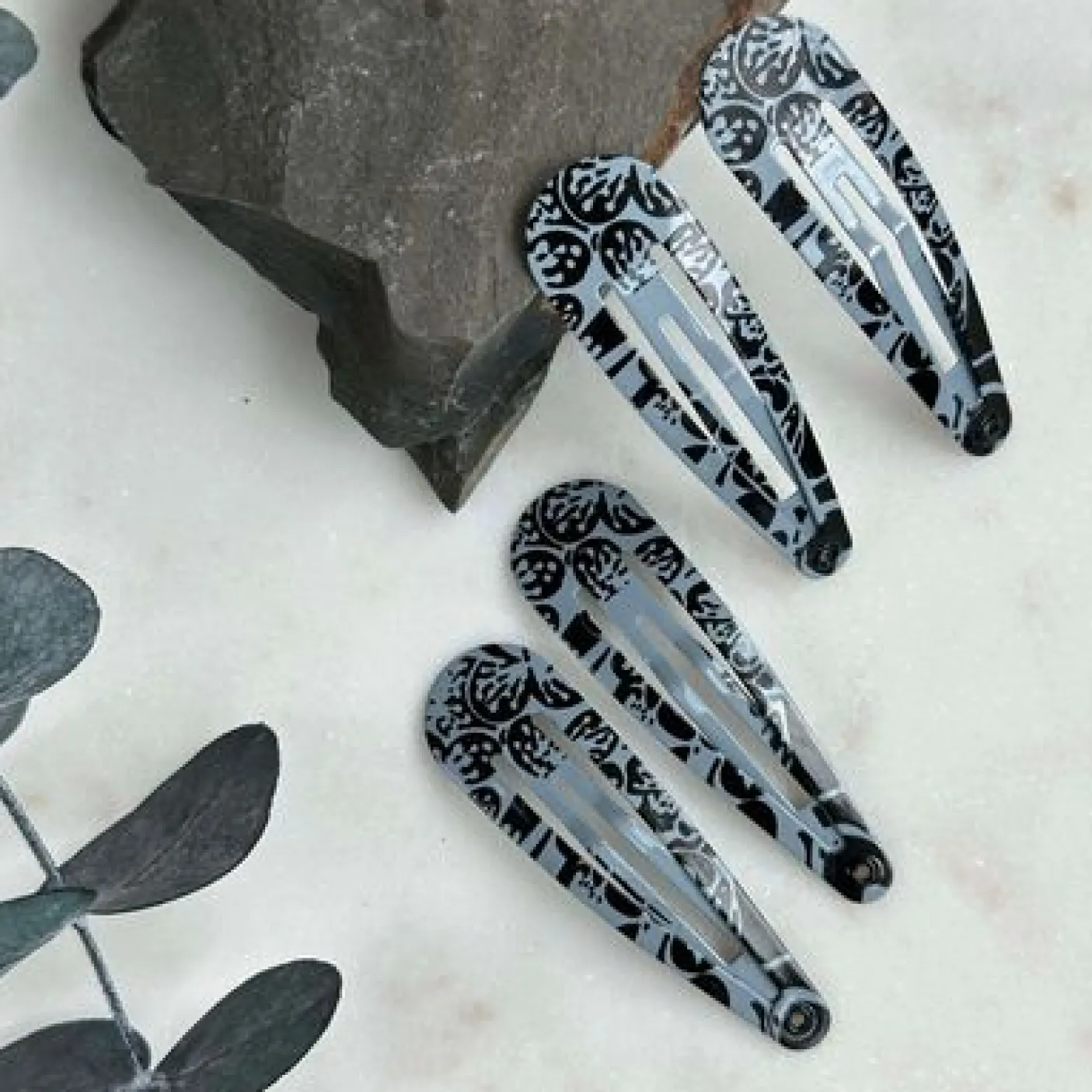 De grå nuancer kombineret med de sorte detaljer giver et diskret, dekorativt præg, uden at spænderne tager al opmærksomheden. Et fint valg, når du vil holde håret på plads og samtidig tilføje en rolig, gennemført detalje.