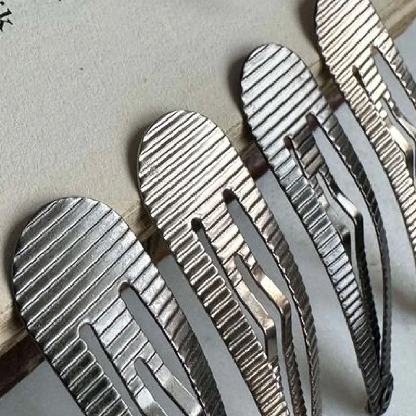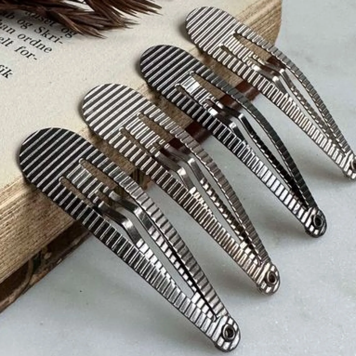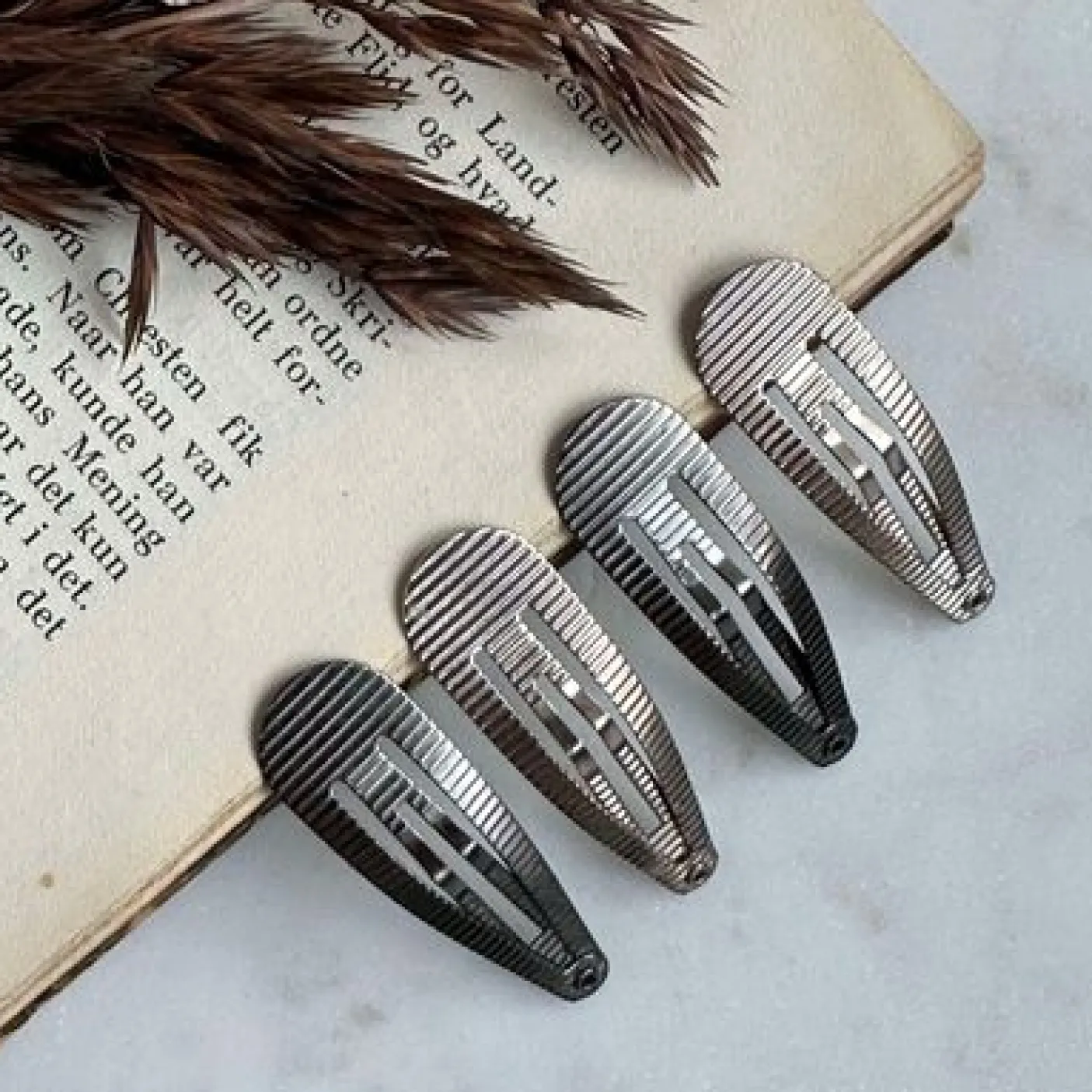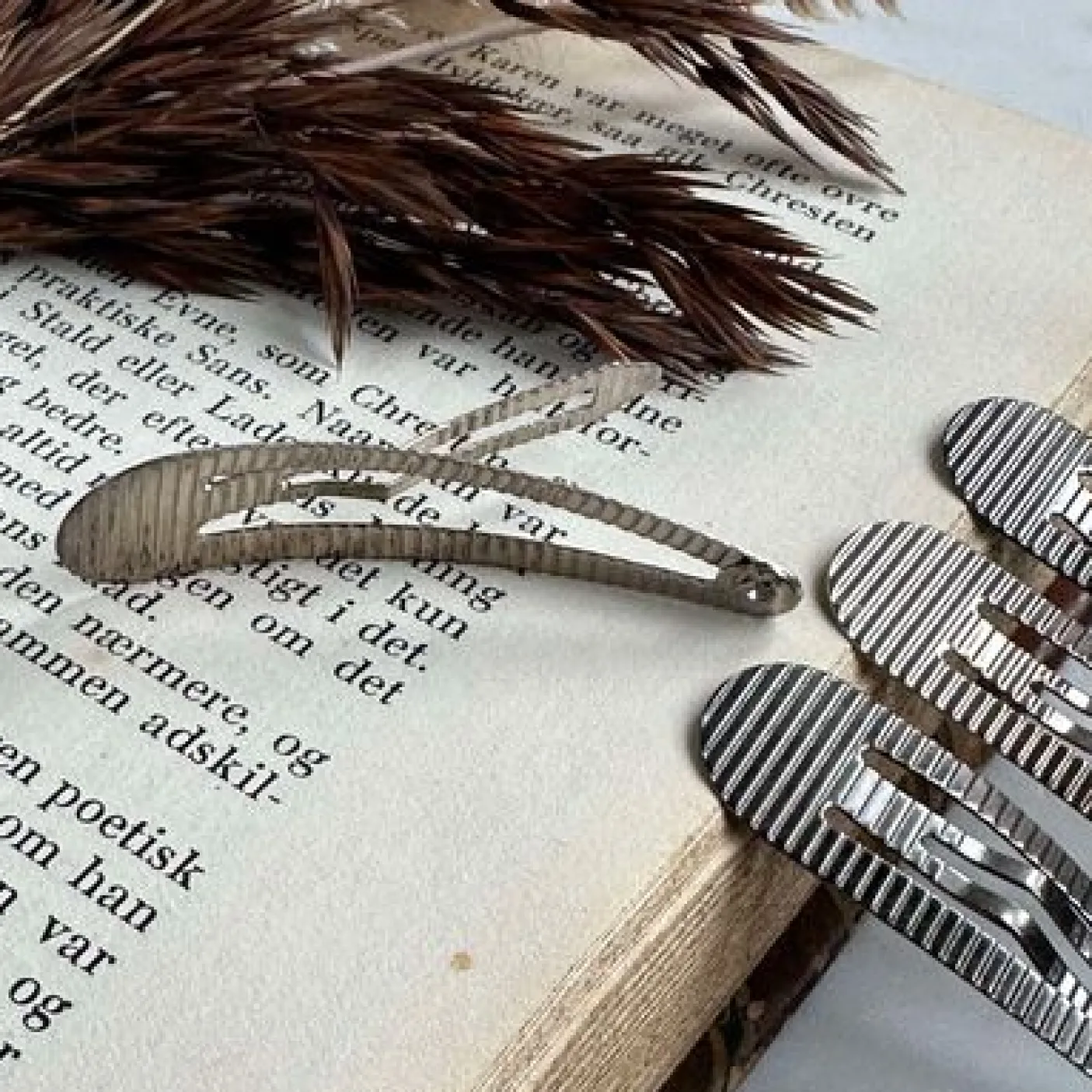 Hårspænder Silver Shine er et sæt med 4 sølv hårspænder i metal. Spænderne har et grafisk/geometrisk udtryk med riller i to nuancer af sølv og en mat overflade, der giver et roligt og stilrent look i håret.