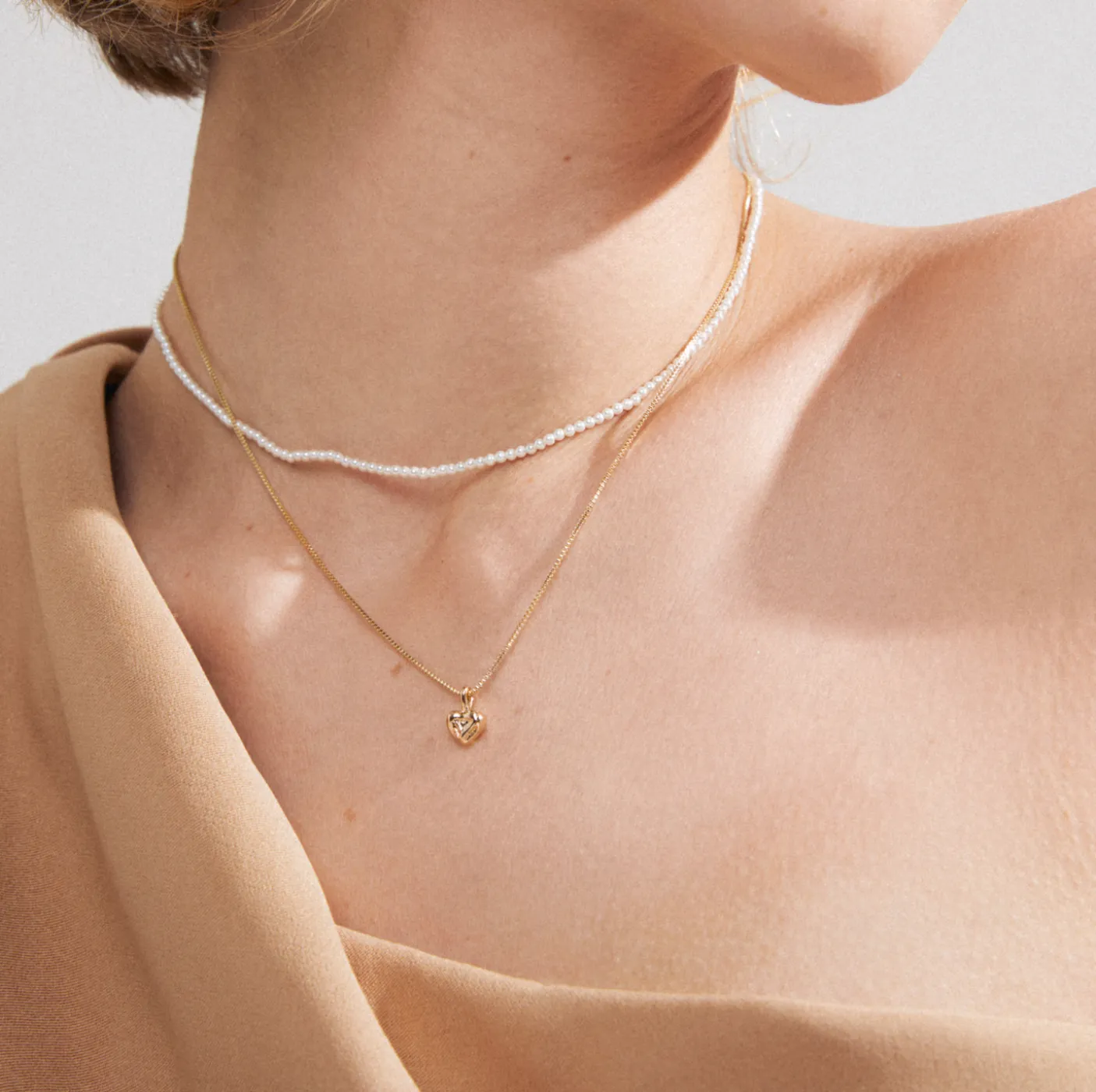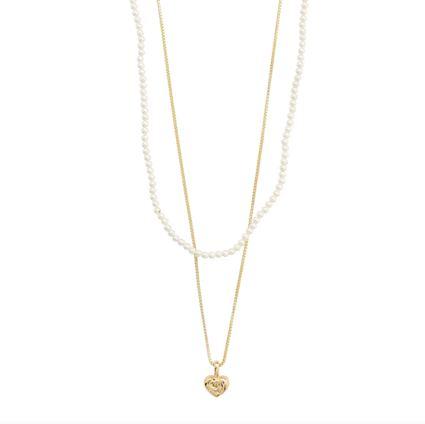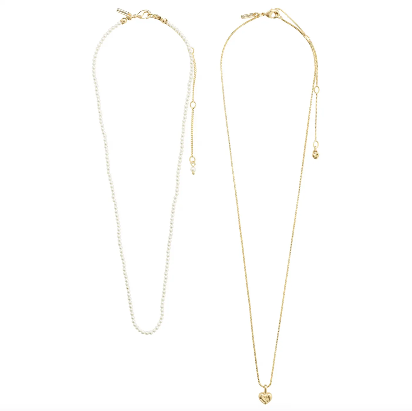 En slank, guldbelagt box chain med et charming lille hjerte og en perlekæde med fine hvide glasperler.