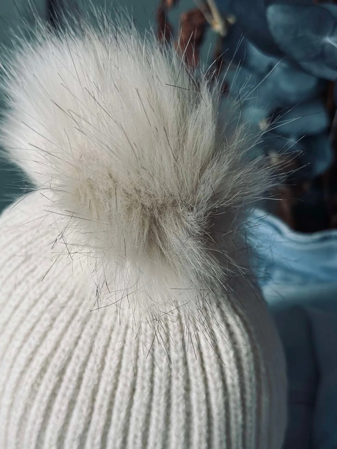 Hue med kvast – Creme er en strikket vinterhue i uld med et enkelt, ensfarvet udtryk. Den dekorative kvast giver huen et roligt, afdæmpet look, der er nemt at style til både frakker og jakker.
