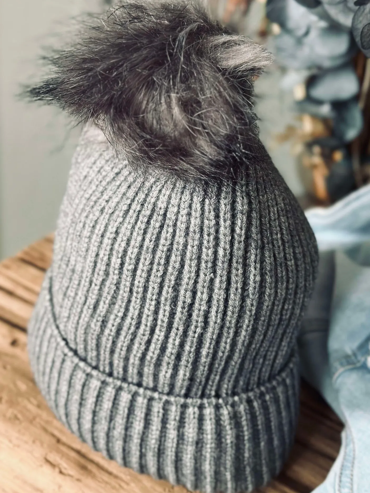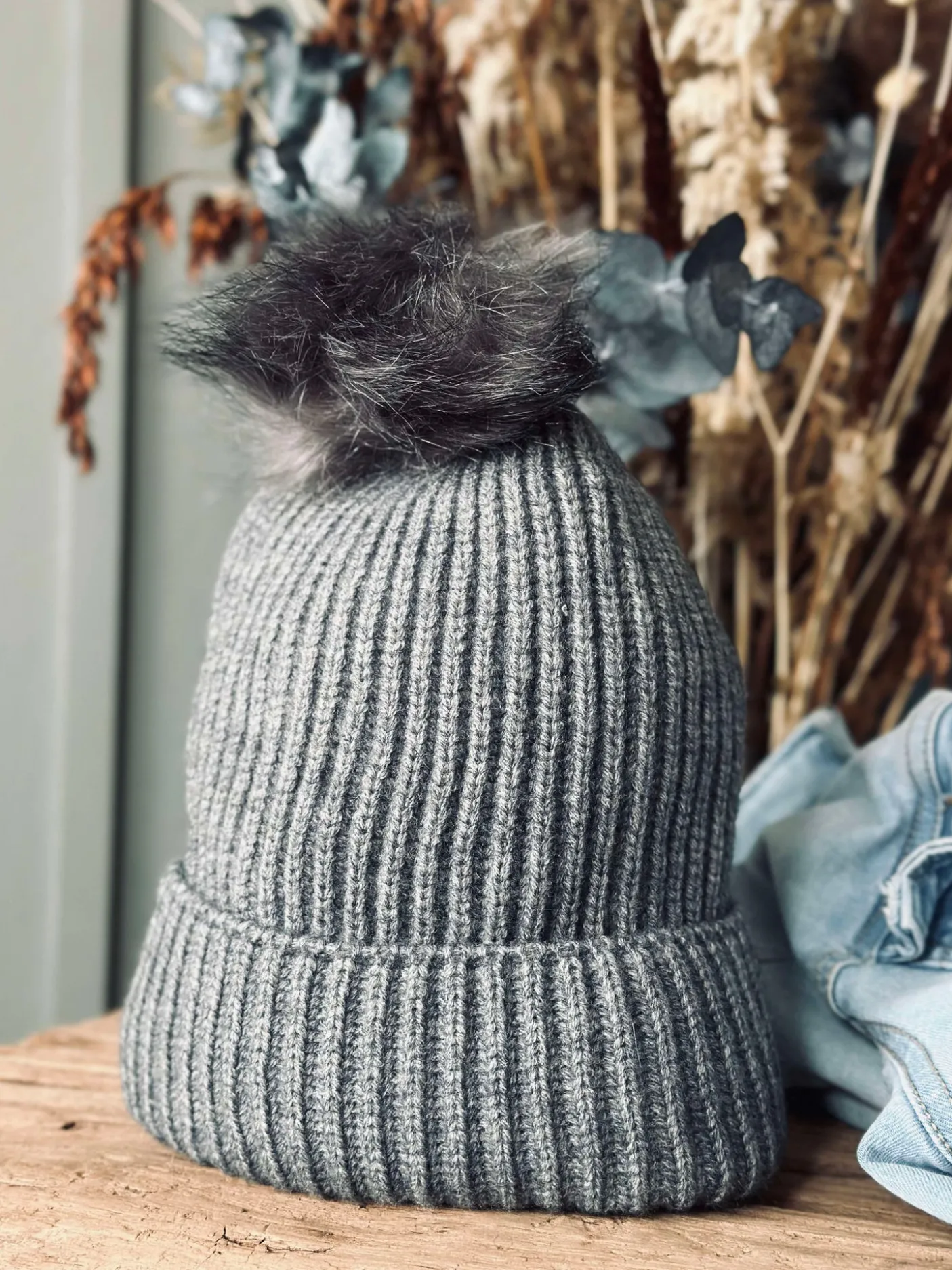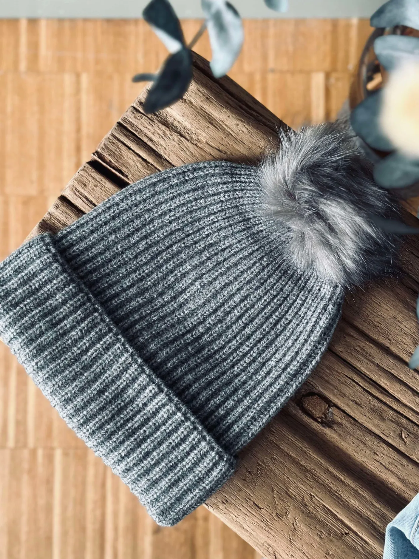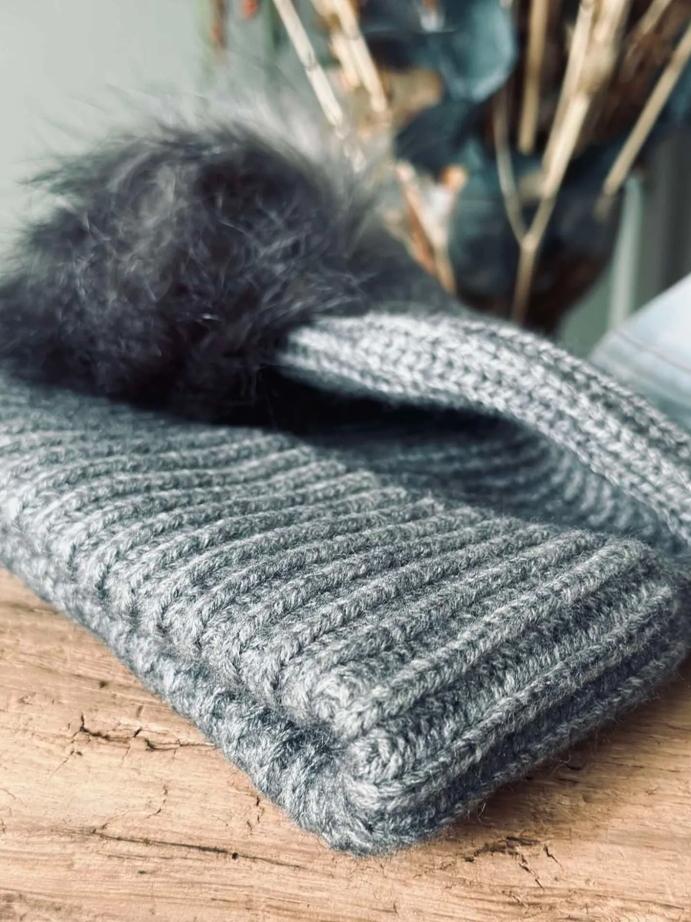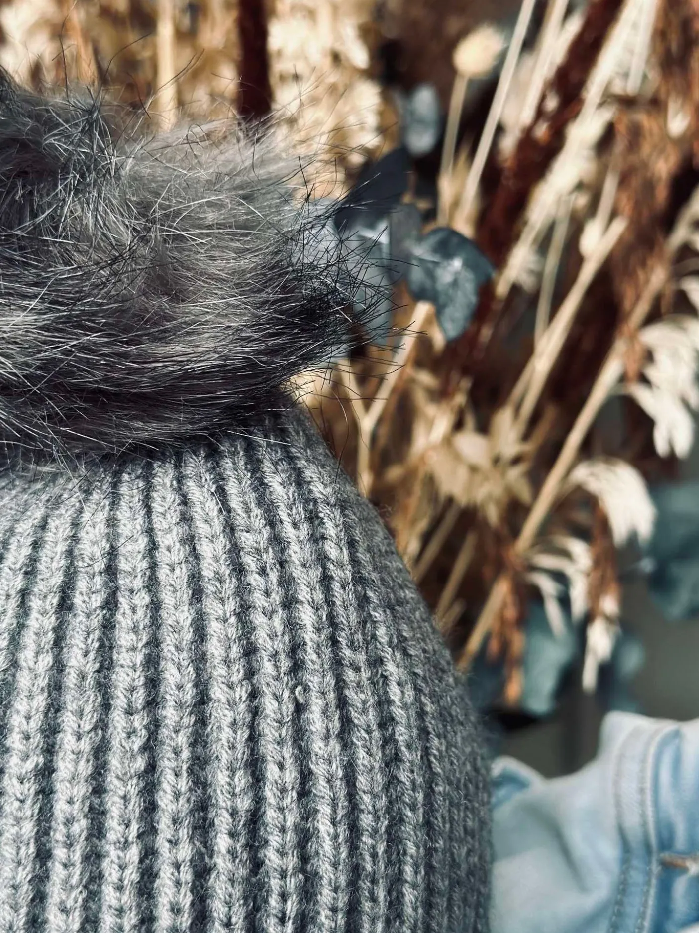 Huen er strikket i polyester og kommer i en ensfarvet grå nuance. Det rolige udtryk gør den alsidig, og kvasten på toppen tilfører en diskret detalje.