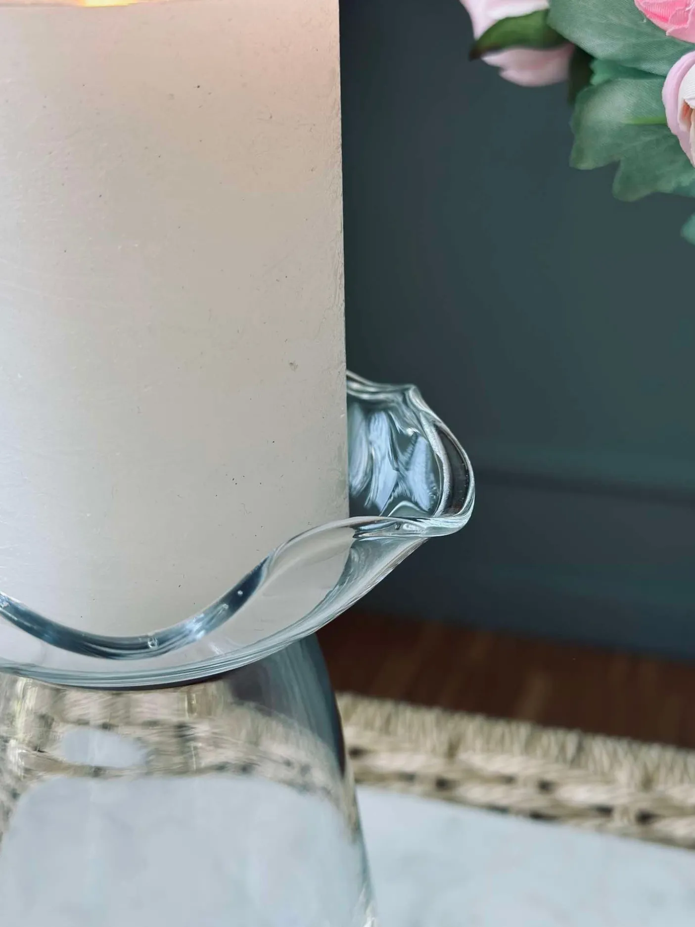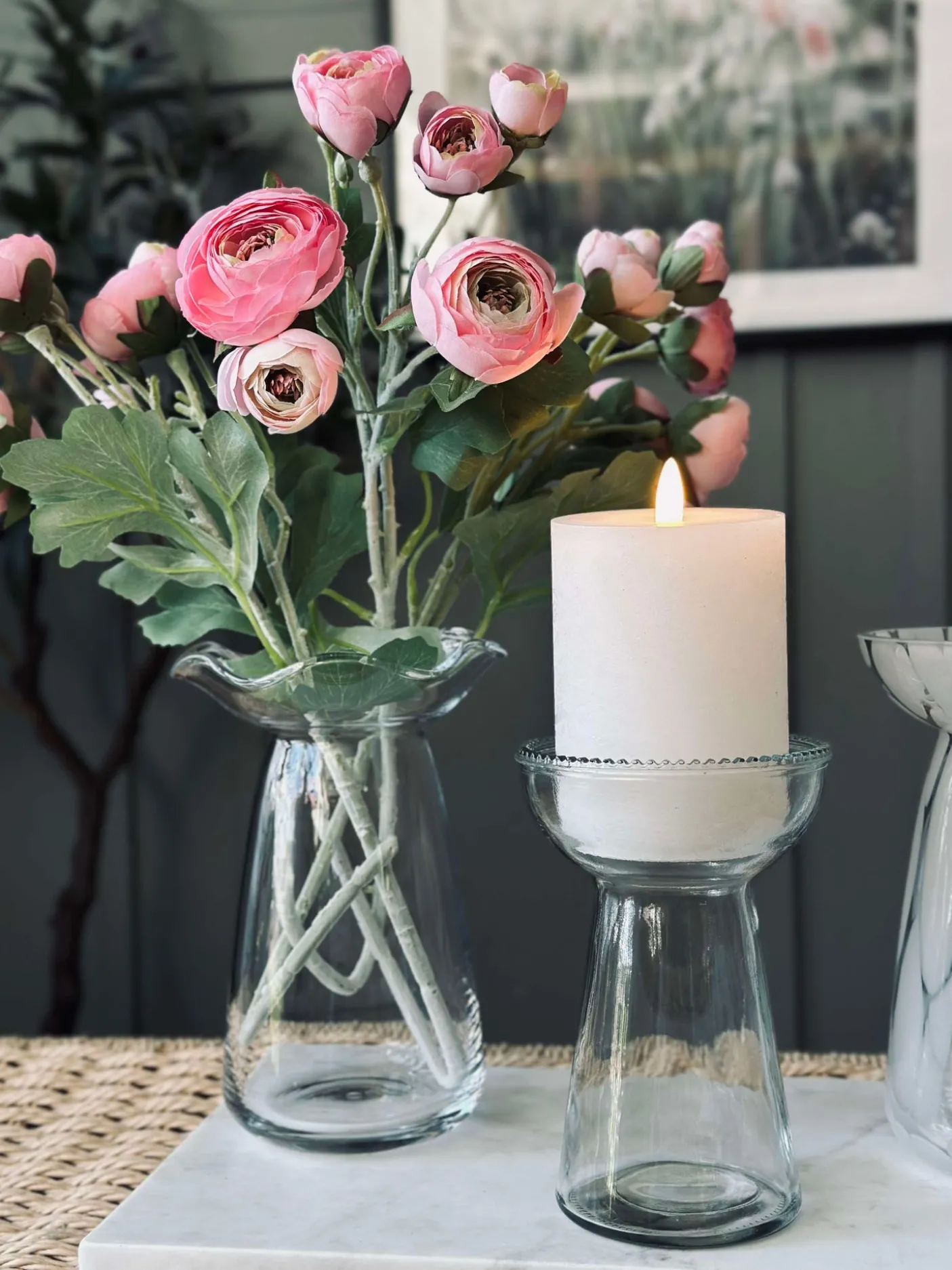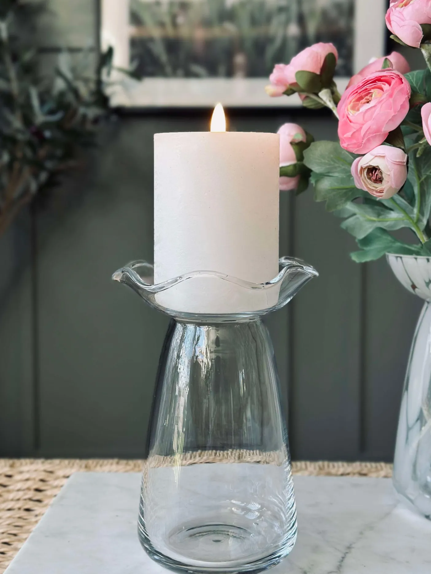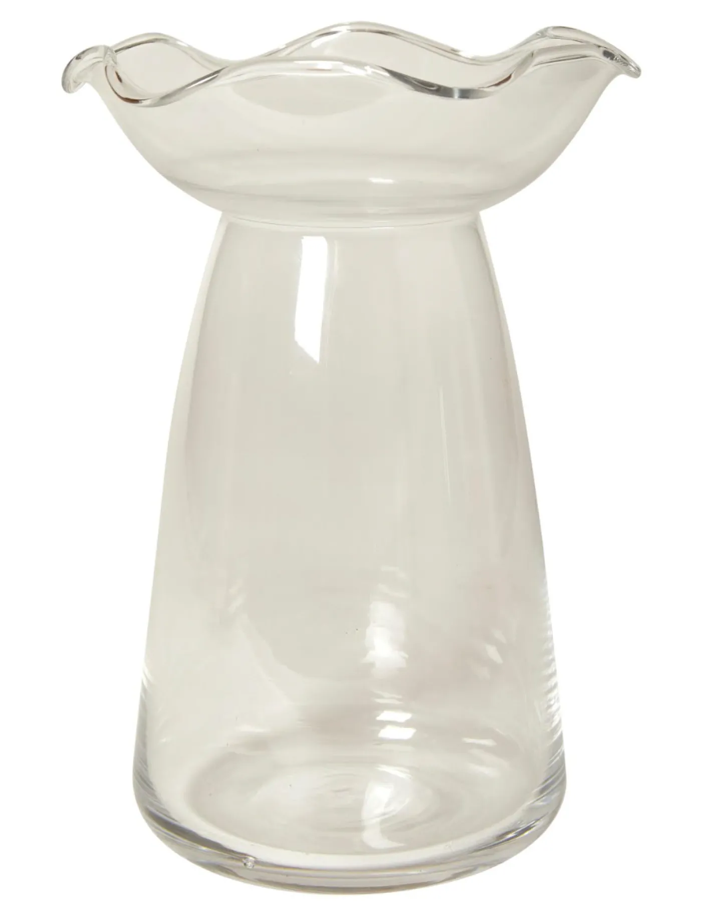 Smuk vase i glas. Vasen kan både benyttes som lysestage til bloklys og almindelig vase – den vil især være fordelagtig til hyacinter.