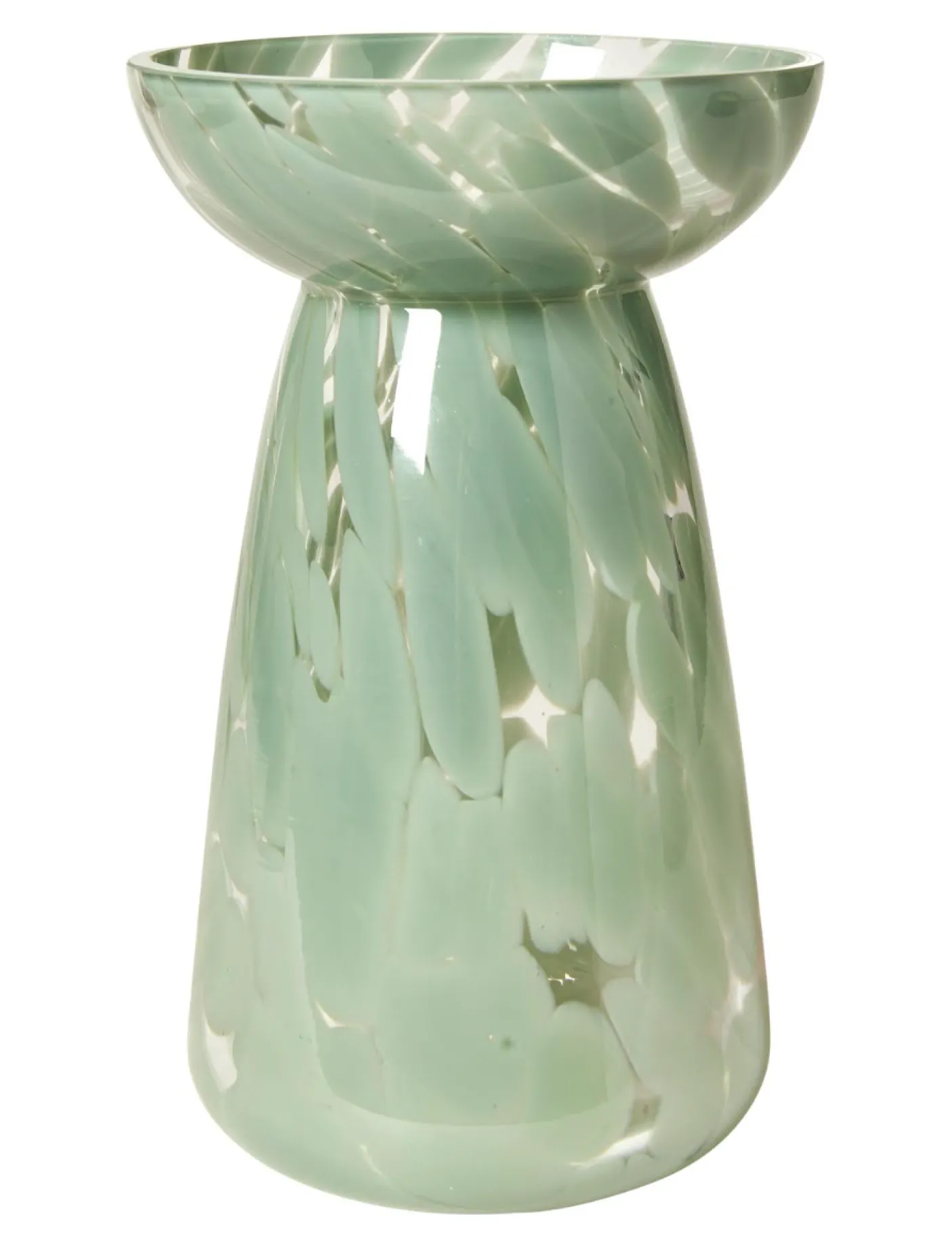 Smuk vase i glas. Vasen kan både benyttes som lysestage og almindelig vase – den vil især være fordelagtig til hyacinter.