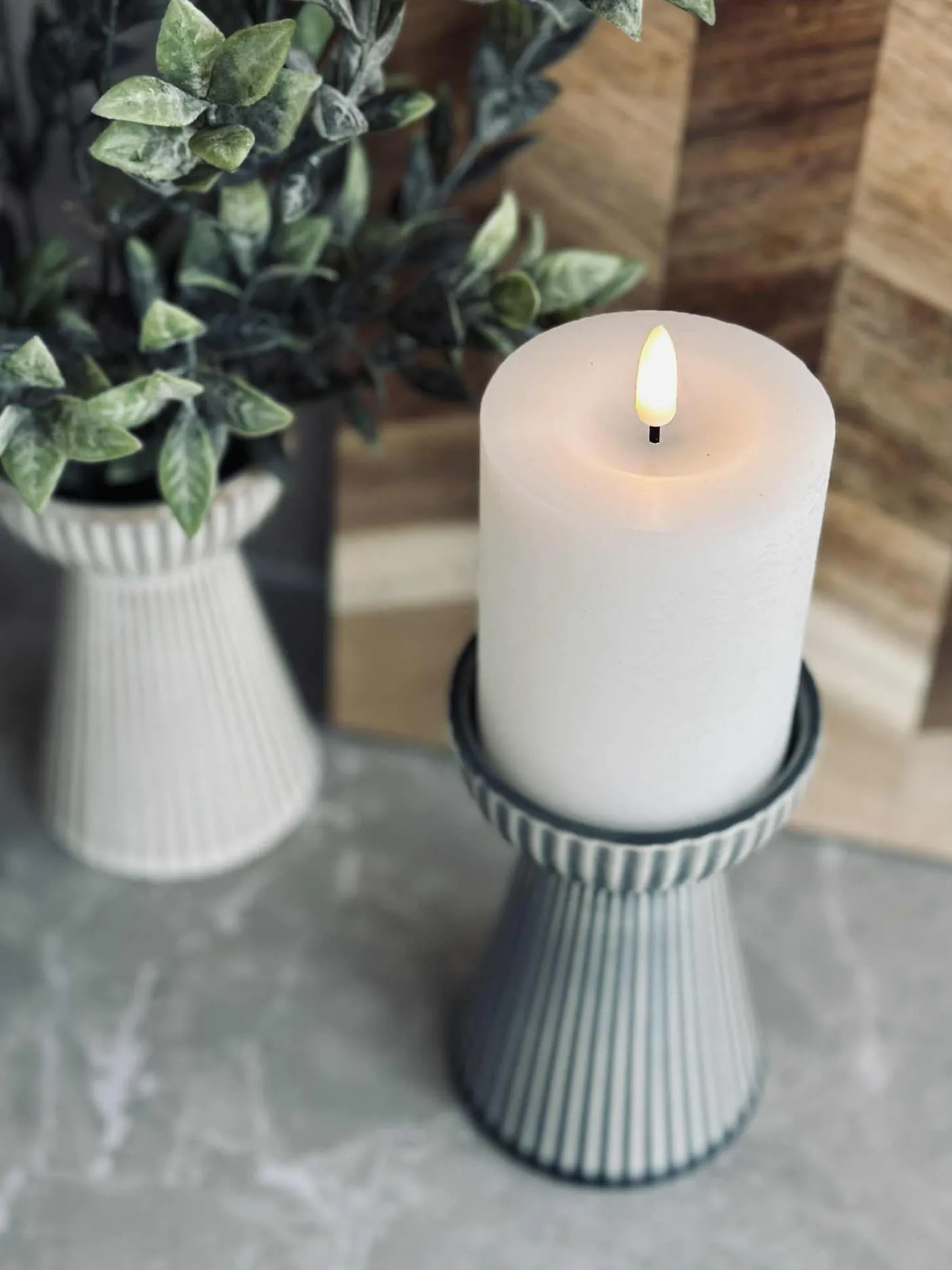 Smuk vase i stentøj. Vasen kan både benyttes som lysestage til bloklys og almindelig vase – den vil især være fordelagtig til hyacinter.