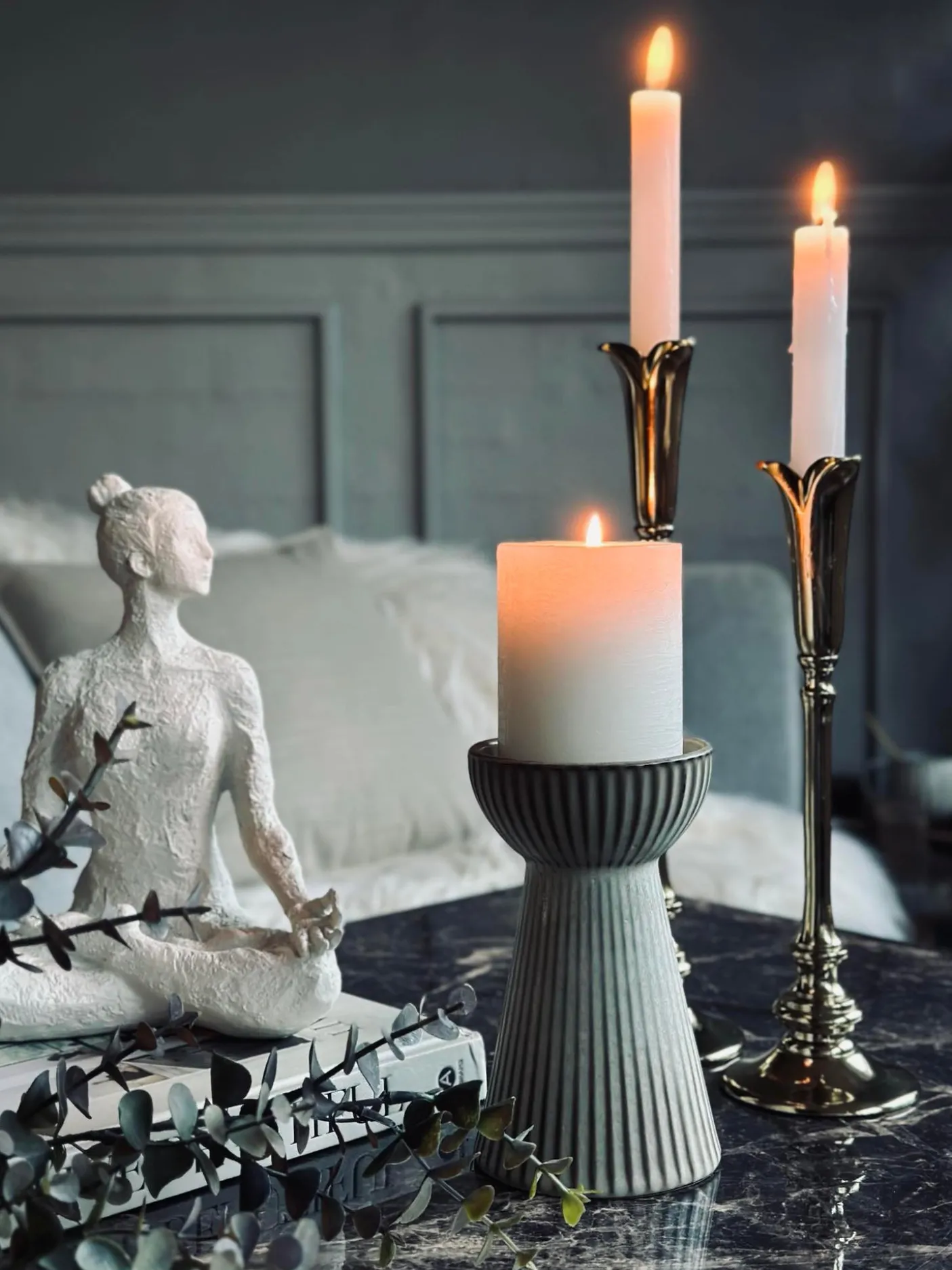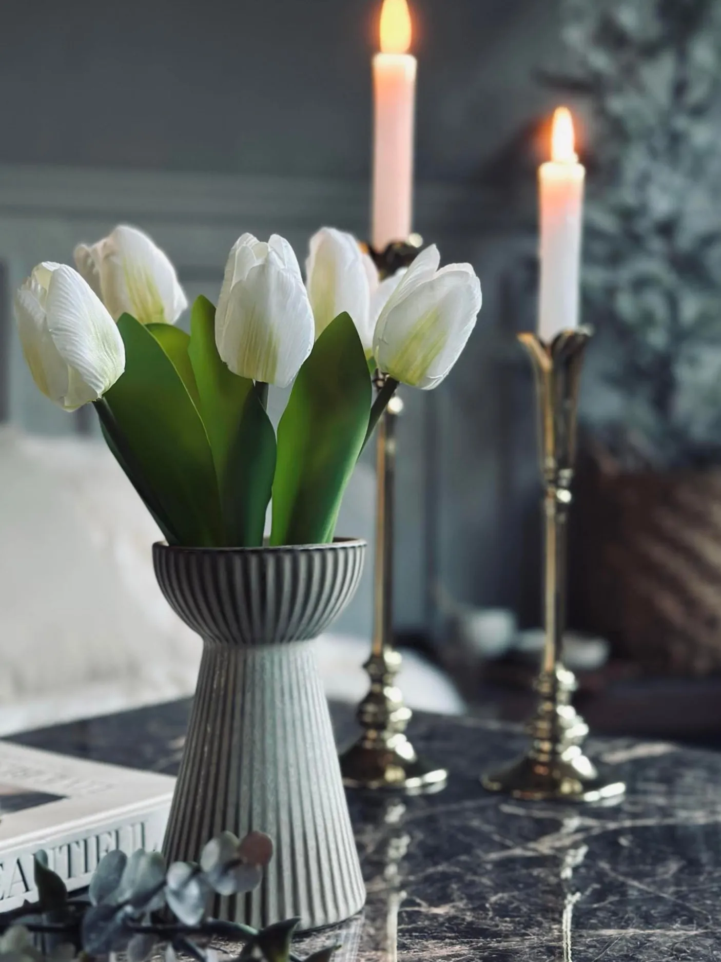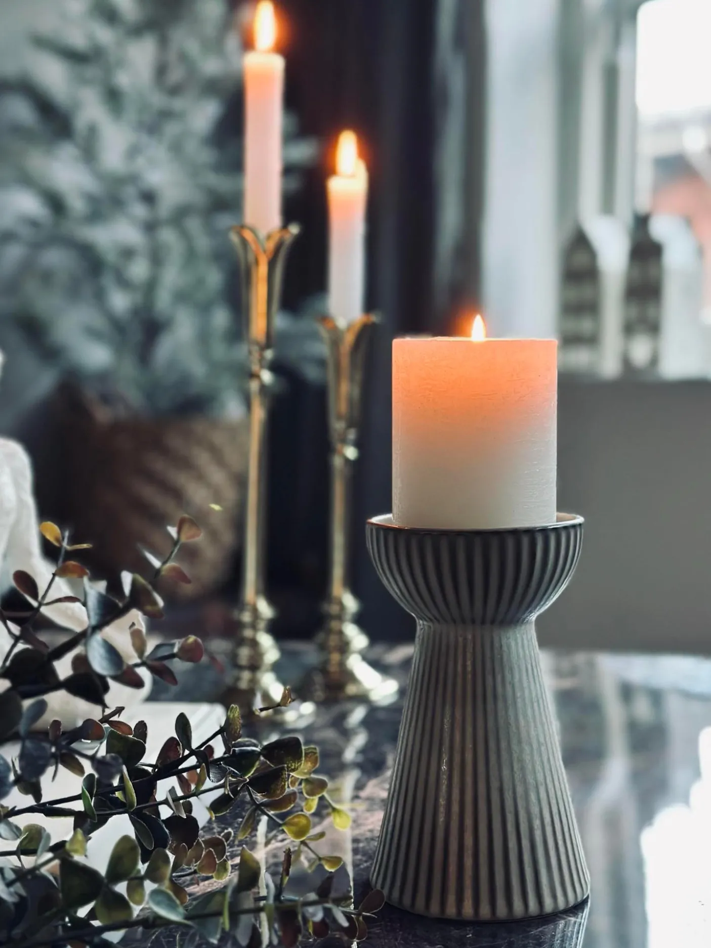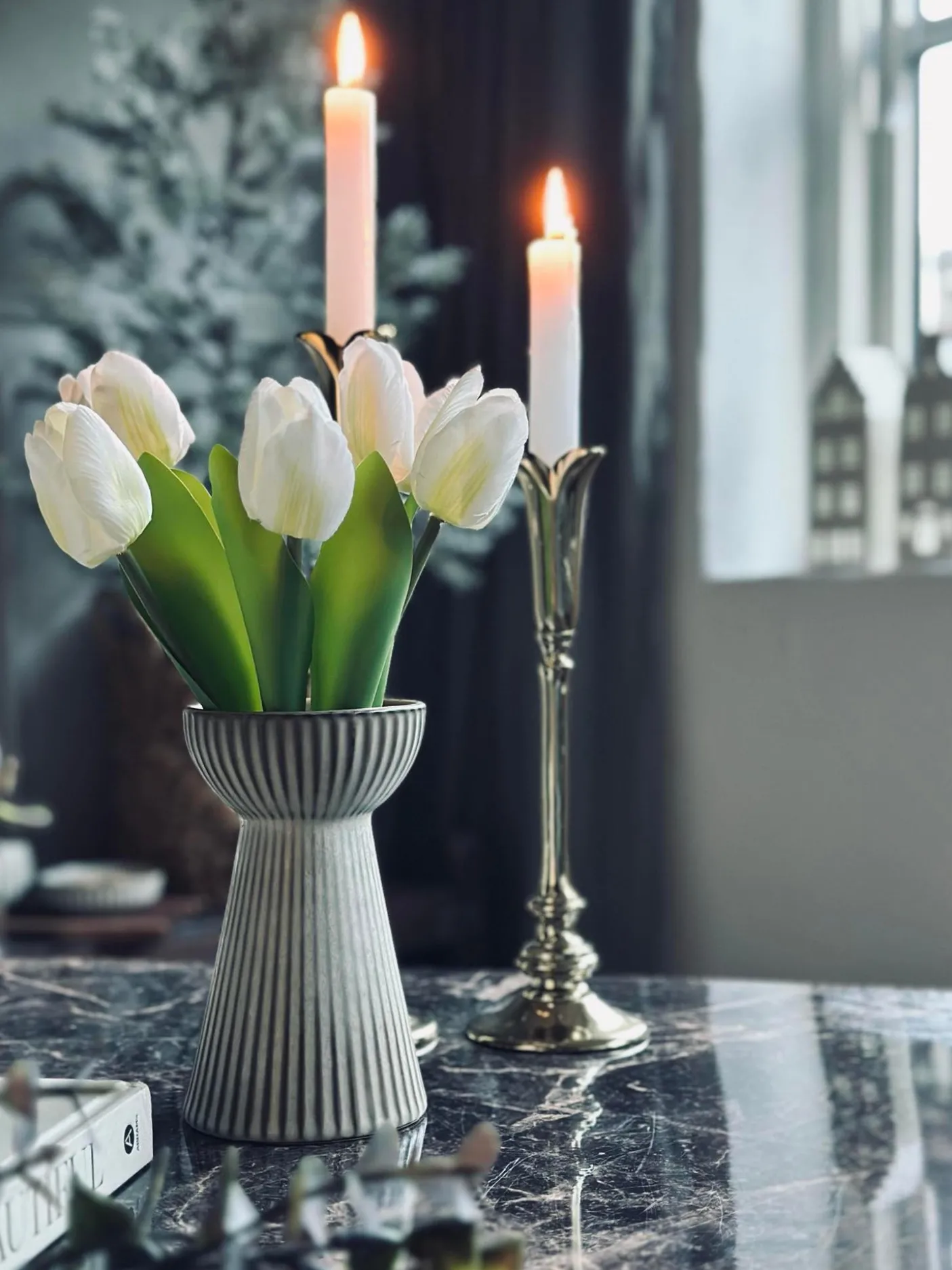 Smuk vase i stentøj. Vasen kan både benyttes som lysestage til bloklys og almindelig vase – den vil især være fordelagtig til hyacinter.