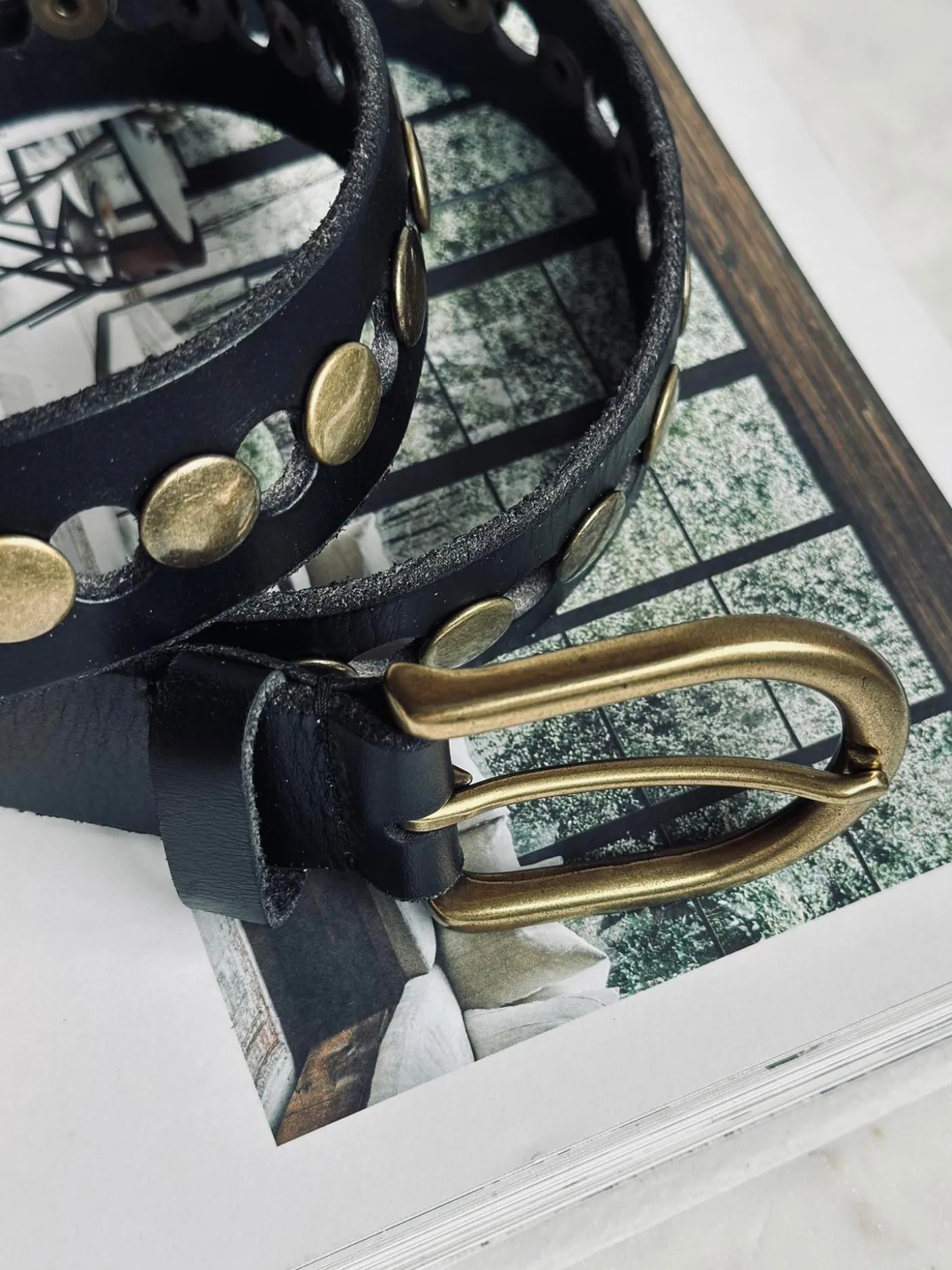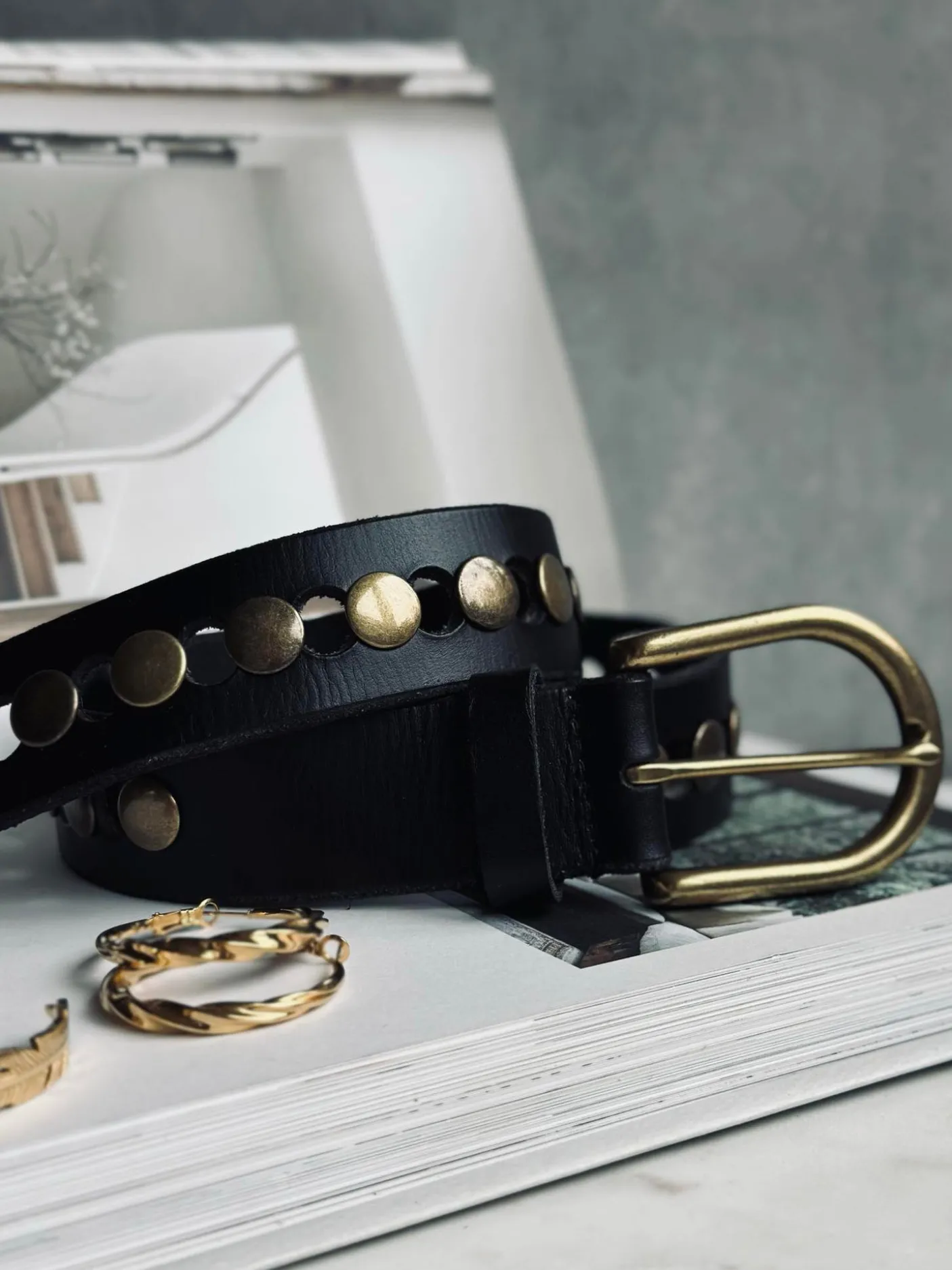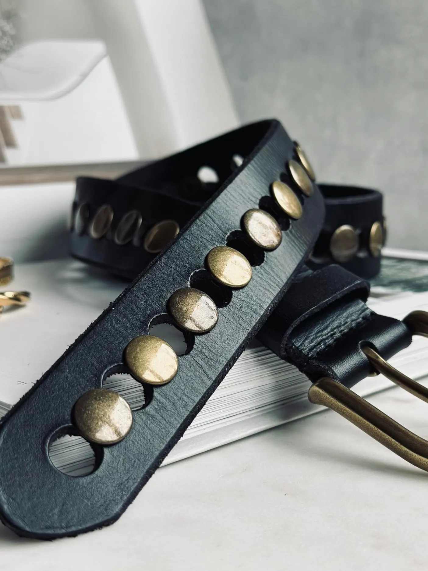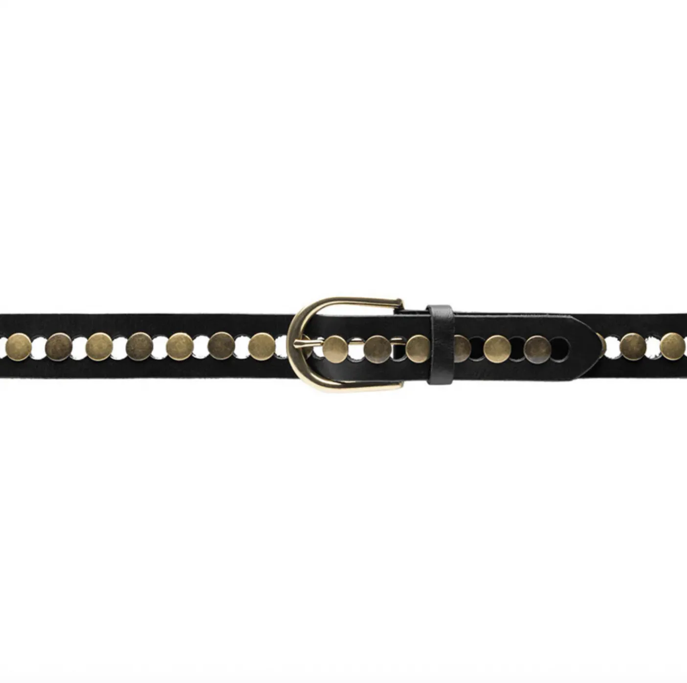 Bæltet er udført i læder og holdt i en ensfarvet sort tone. Kombinationen af læder og nitter skaber et karakterfuldt look, der fungerer som en tydelig detalje i dit outfit.