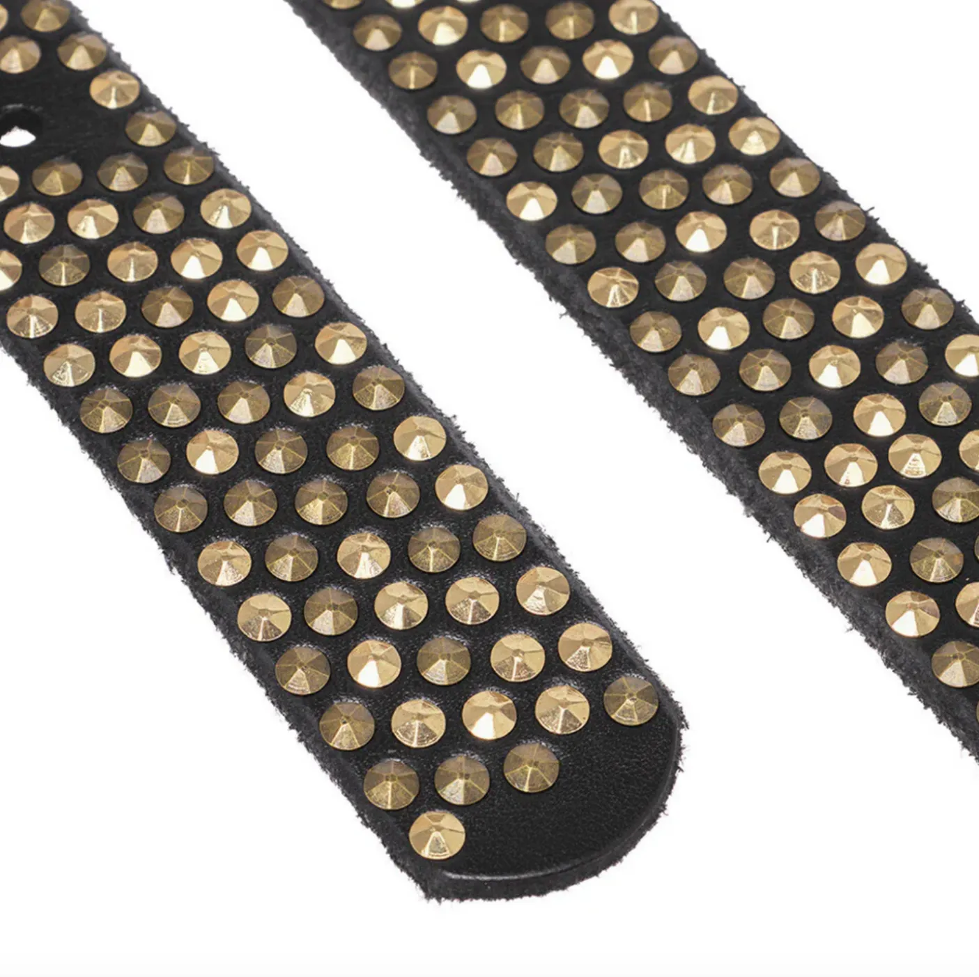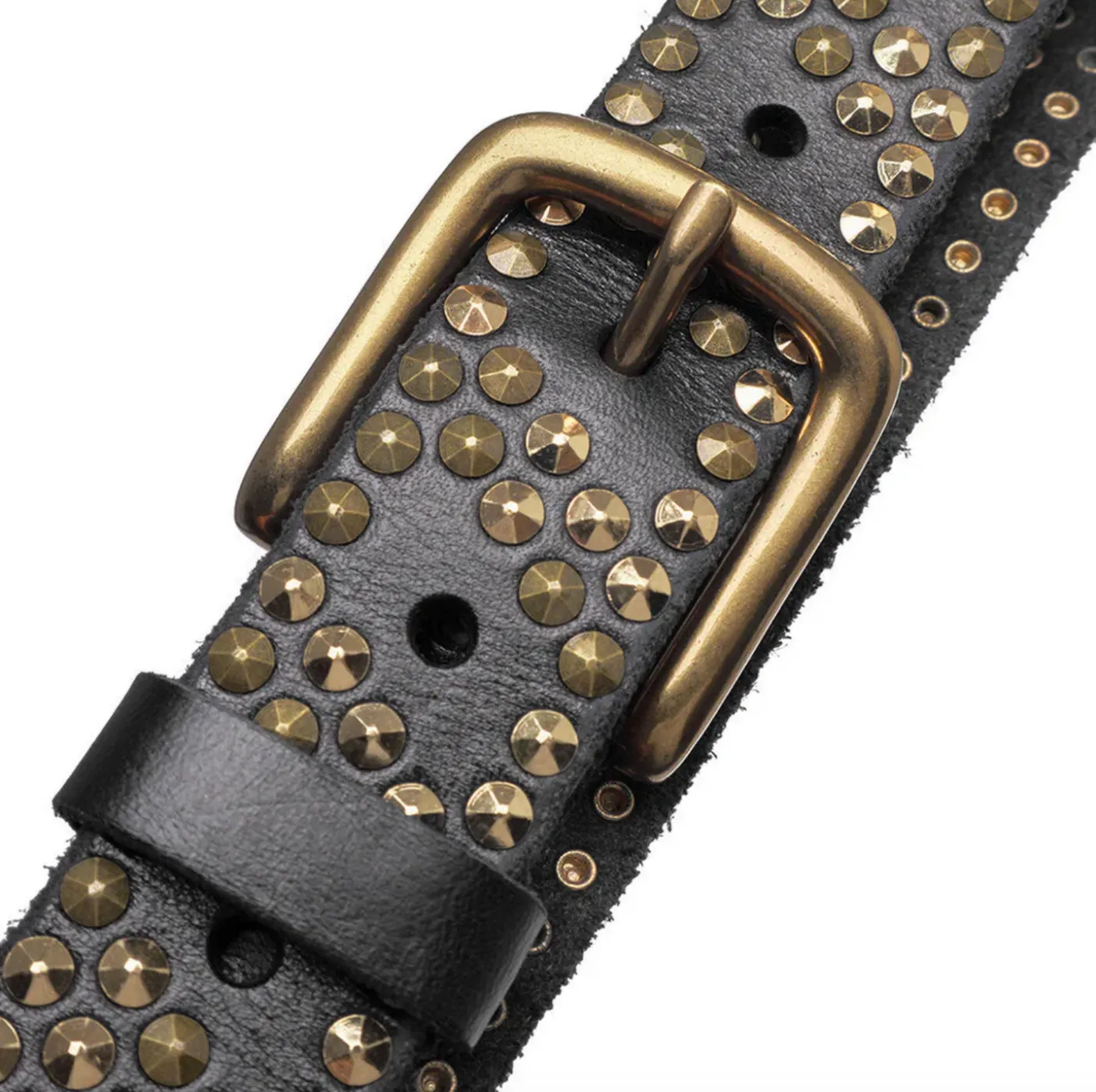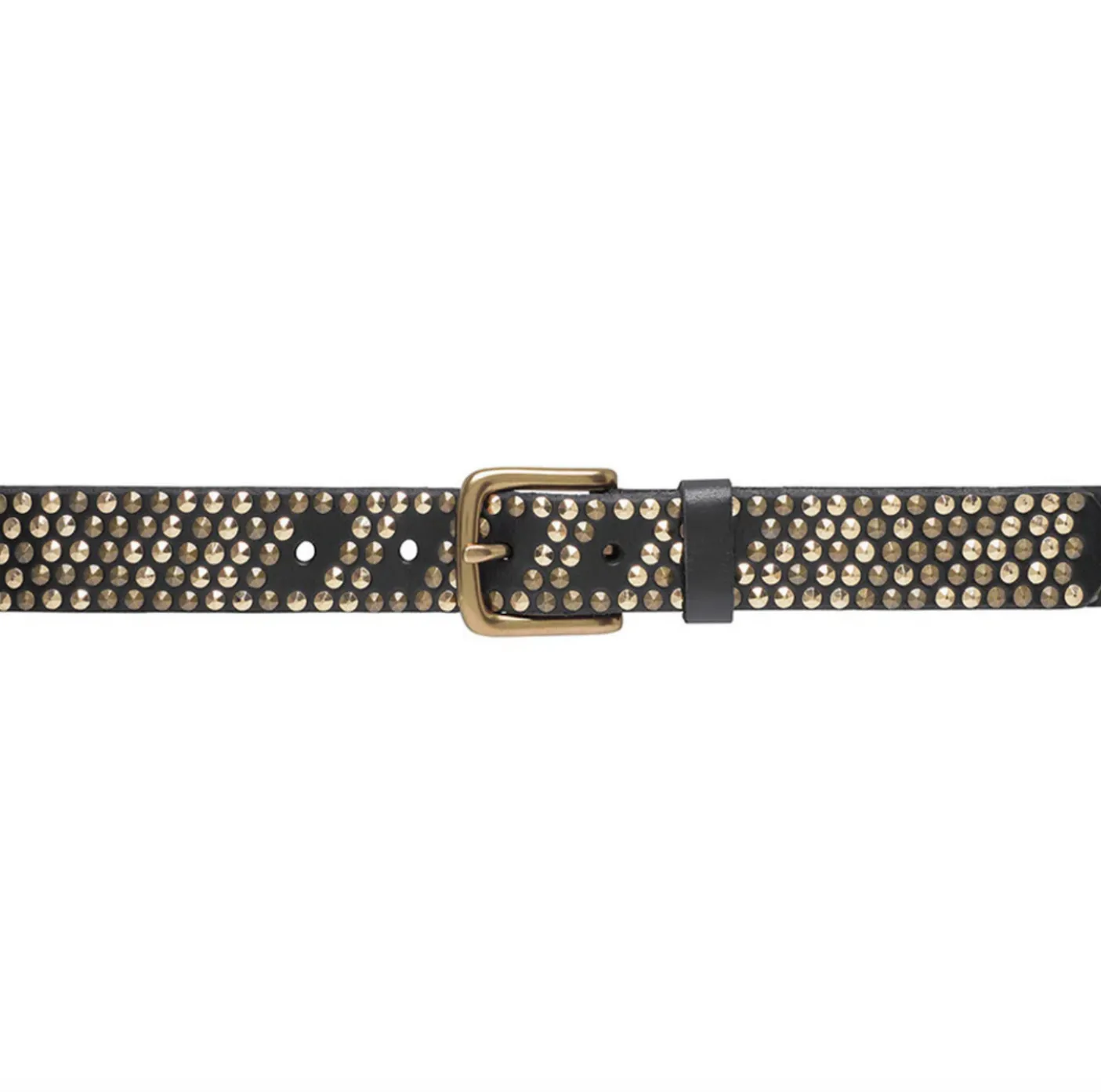 Jeans bælte med nitter er et markant accessory i sort skind med en 3 cm bred rem. De små nitter hele vejen rundt giver bæltet et kantet look, der tydeligt skiller sig ud, uden at helheden virker tung. Overfladen har et struktureret/vævet udtryk, som tilfører ekstra dybde til designet.