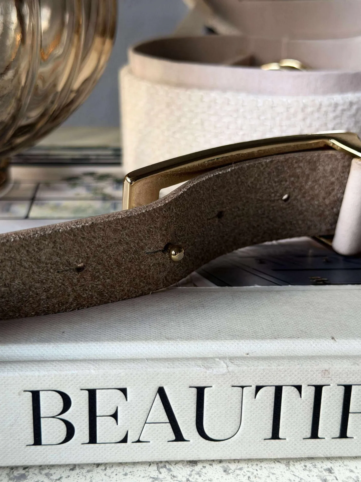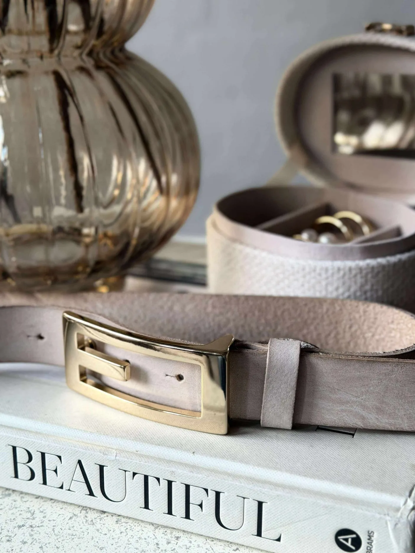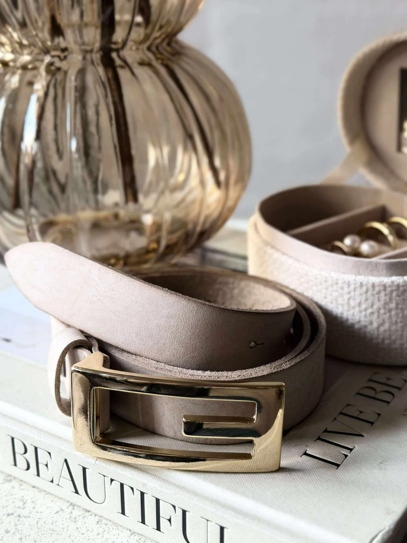 Bæltet er lavet i skind og holdt i en ensfarvet sand nuance, som giver et afdæmpet og stilrent udtryk.