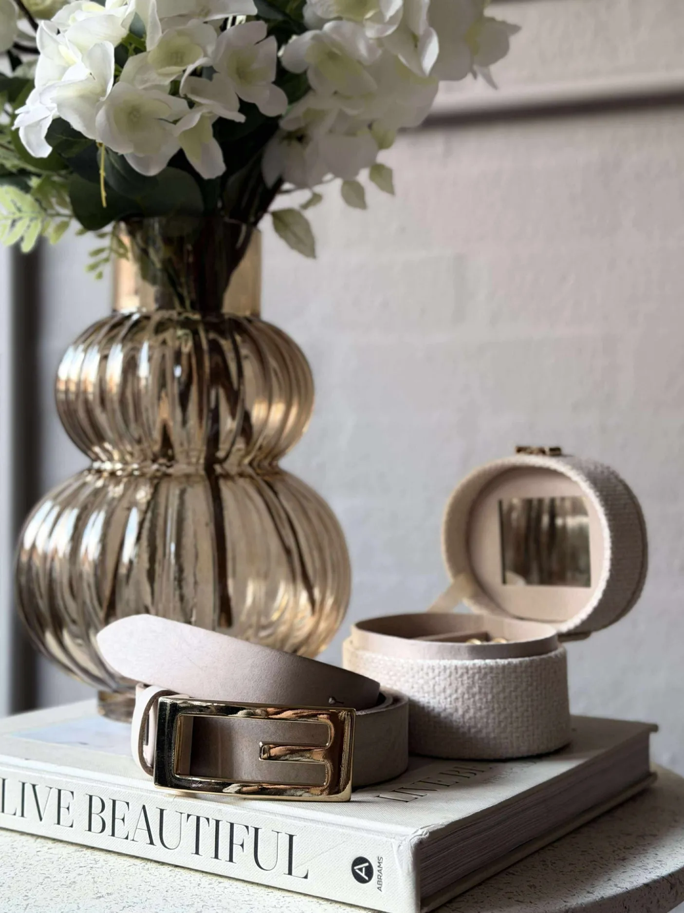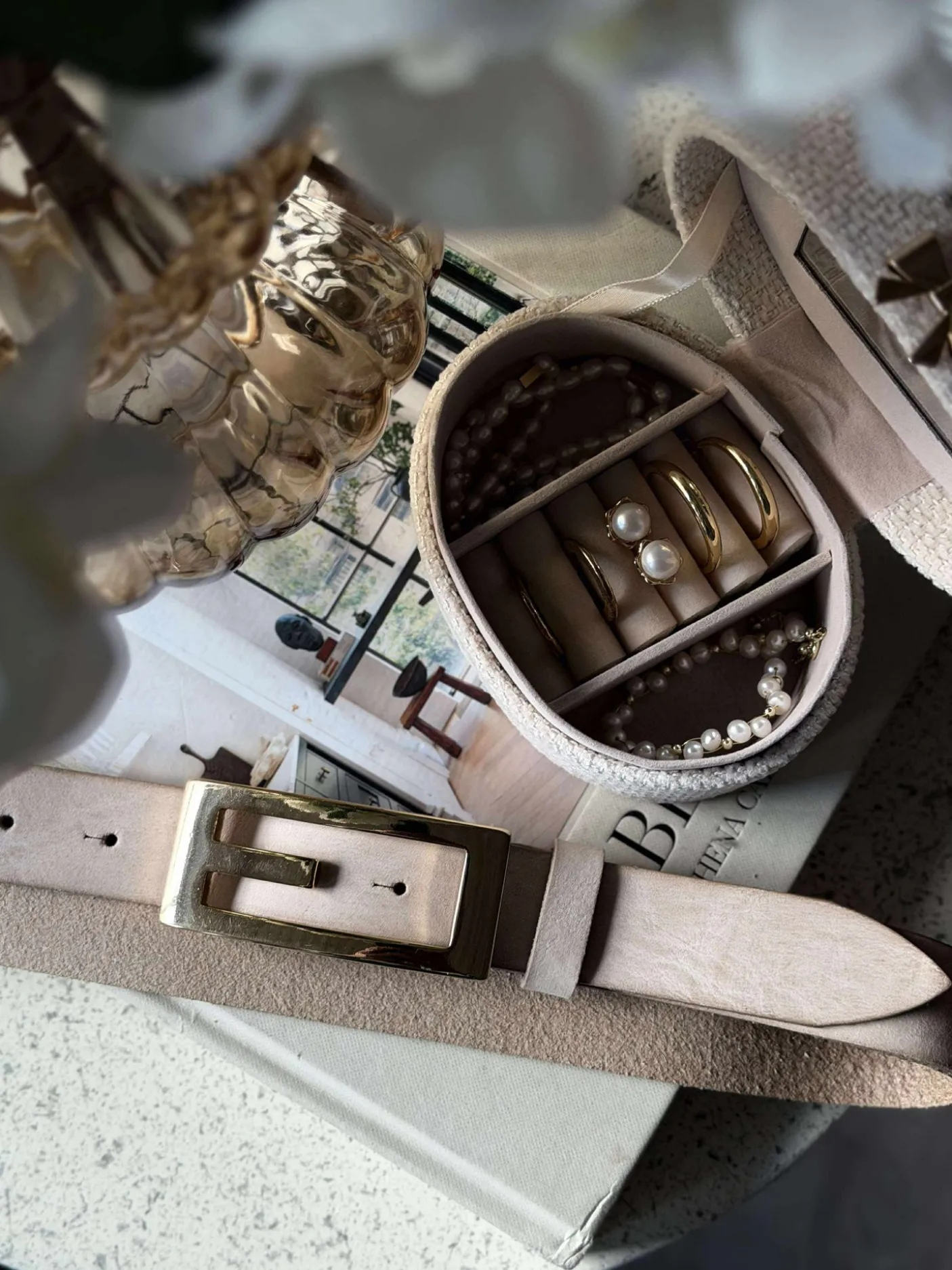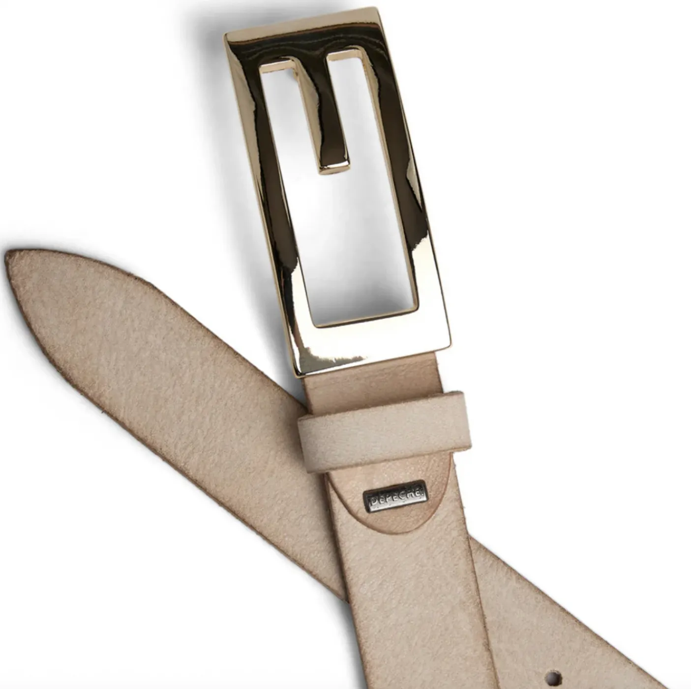 Bæltet er lavet i skind og holdt i en ensfarvet sand nuance, som giver et afdæmpet og stilrent udtryk.