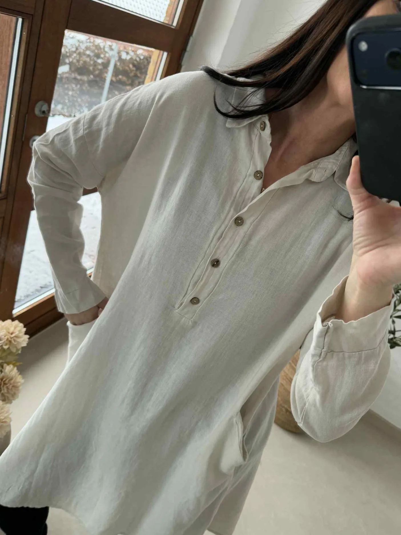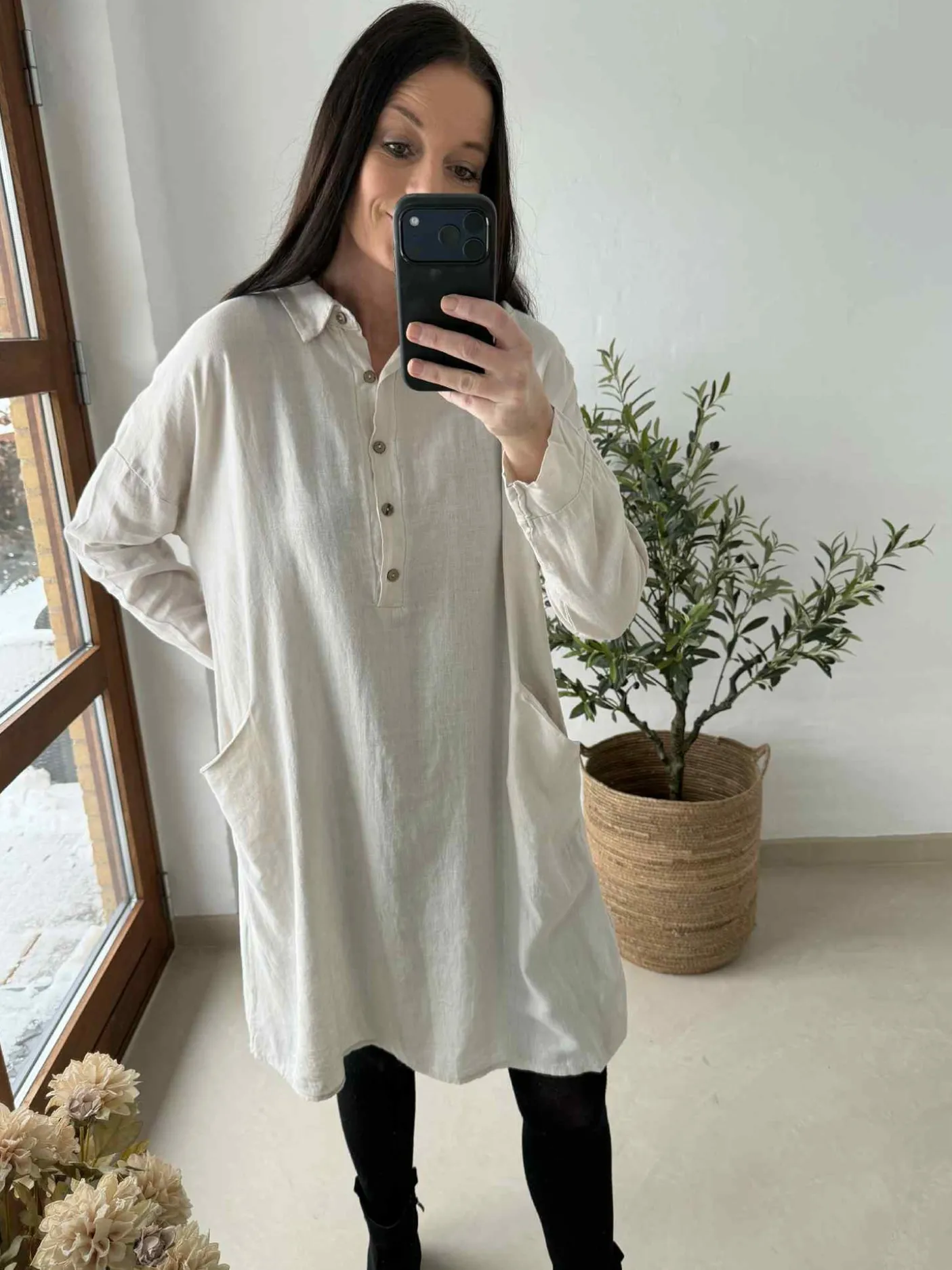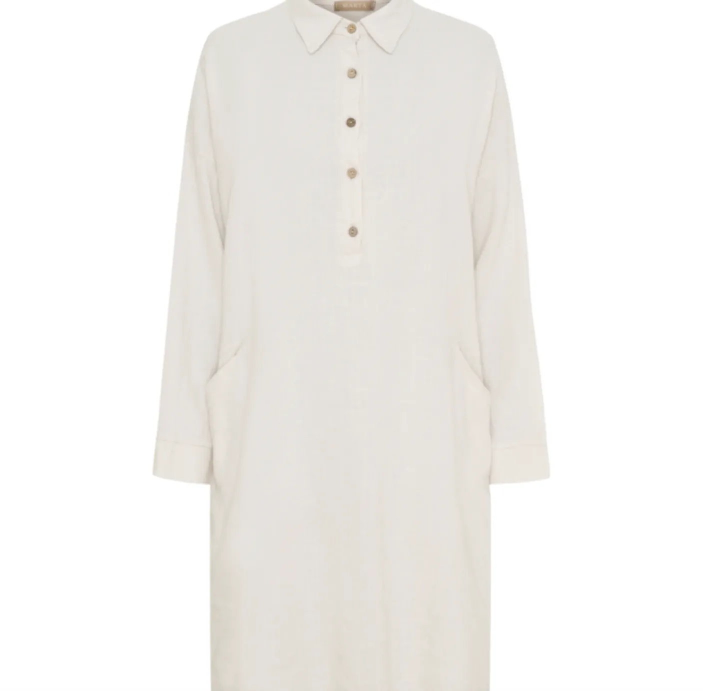 Lækker kjole med lommer og knapper i 45% viscose og 55% hør, designet i en off-white/natur nuance. Kjolen kan bruges flere sæsoner: forår, sommer og efterår. Onesize med rummelig pasform giver et afslappet, naturligt udtryk. Den kan styles i et afslappet look eller dresses op med støvler og bælte.