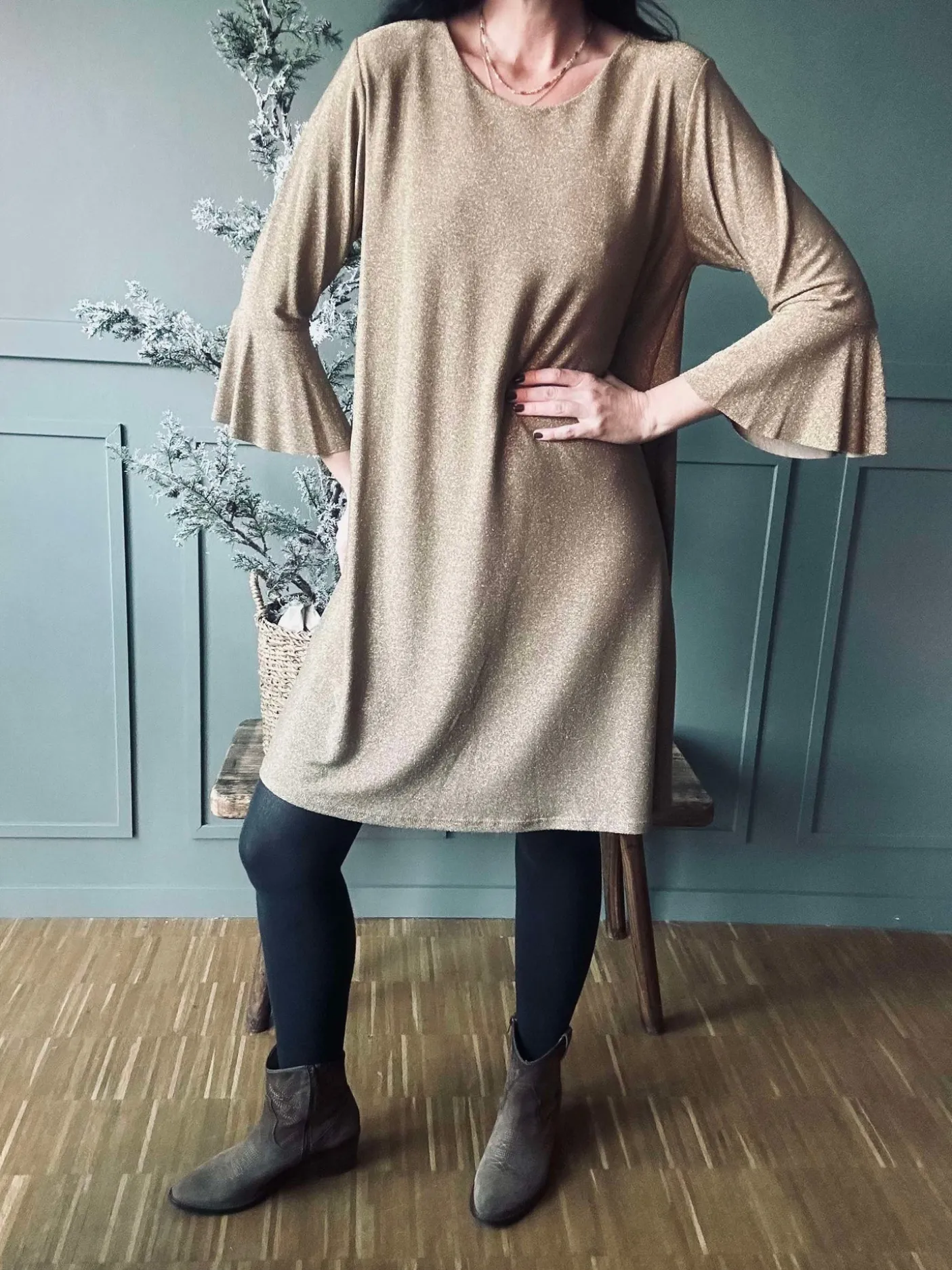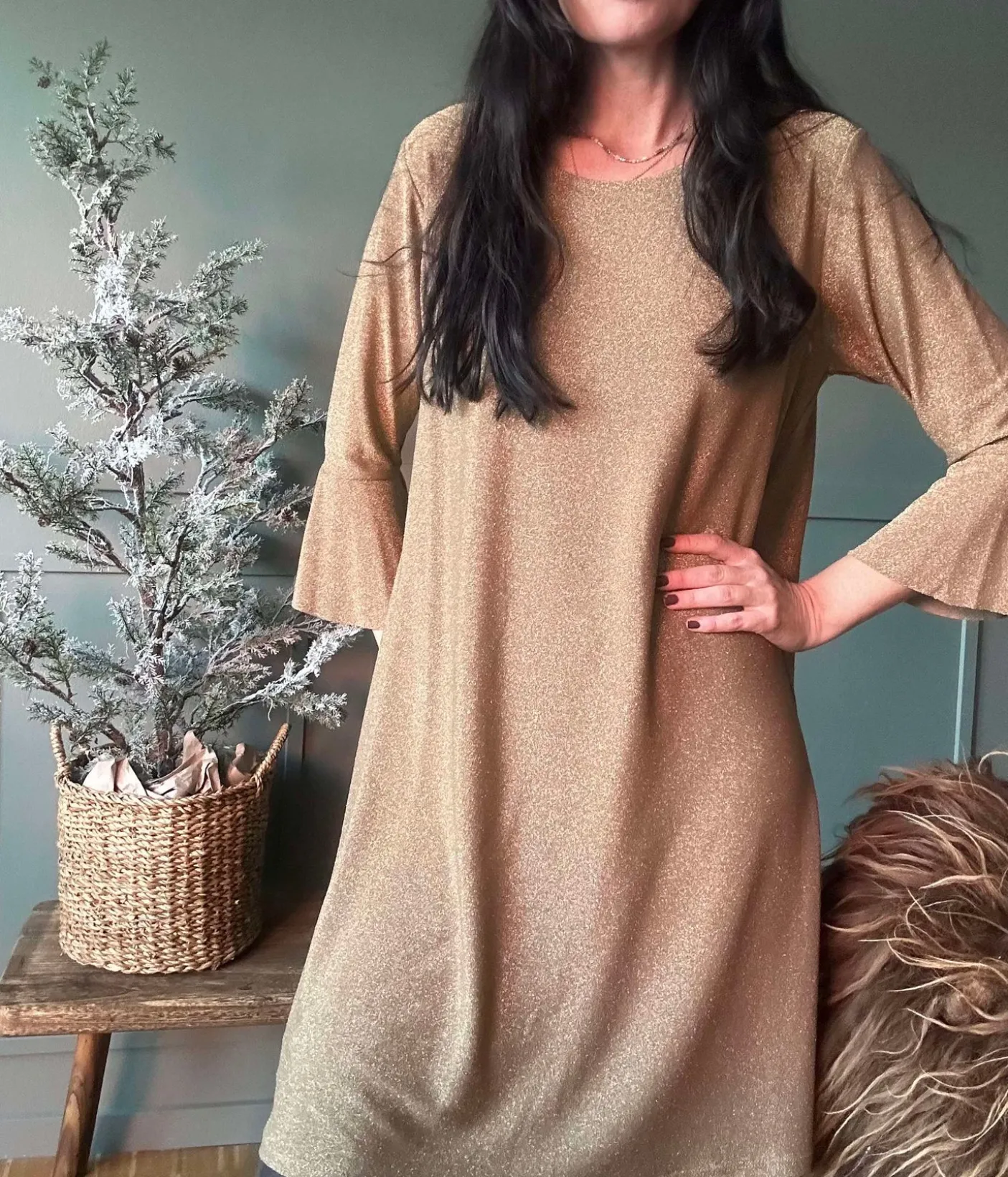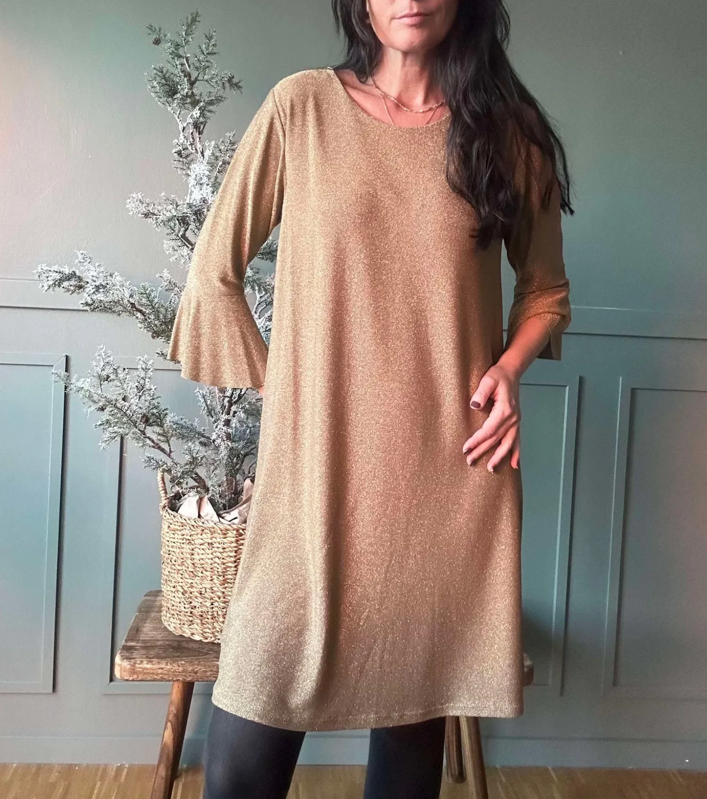 Smuk kjole med diskret glimmer og vidde ærmer, der skaber et elegant aftenudtryk. Materialet er 97% polyester og 3% elastan, hvilket indgår i stoffets finish. S/M har et brystmål på ca. 102 cm og en længde på ca. 93 cm. Designet fremhæver glimt uden at være prangende.