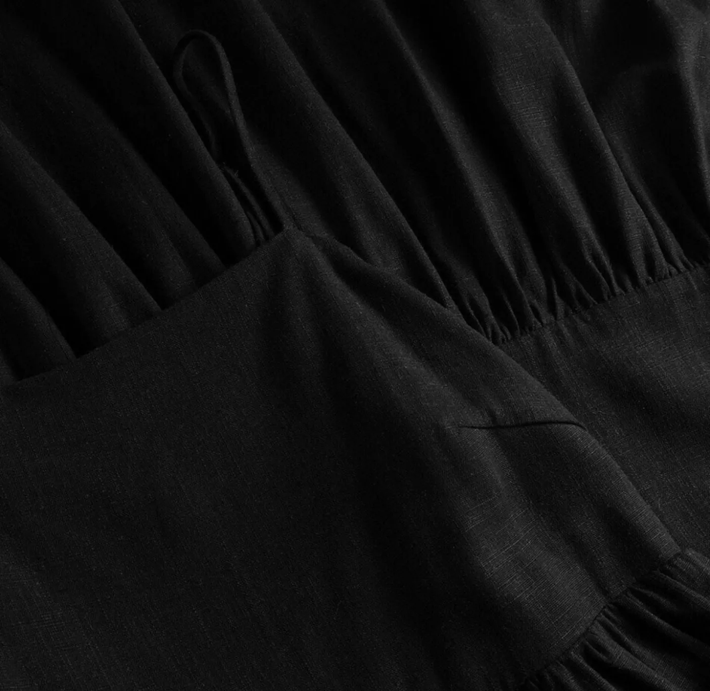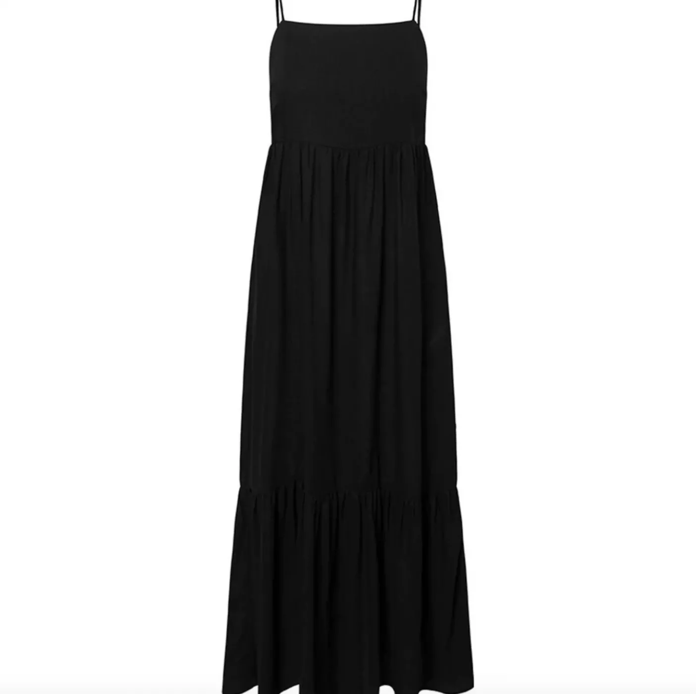 Tara kjole i Black er en lang stropkjole i en hørblanding (70% viscose, 30% linen) og går til under knæet. Kjolen har et enkelt snit, der skaber en feminin silhuet og et roligt, tidløst udtryk. Den enkle silhuet gør kjolen anvendelig ved flere lejligheder uden unødvendige detaljer.