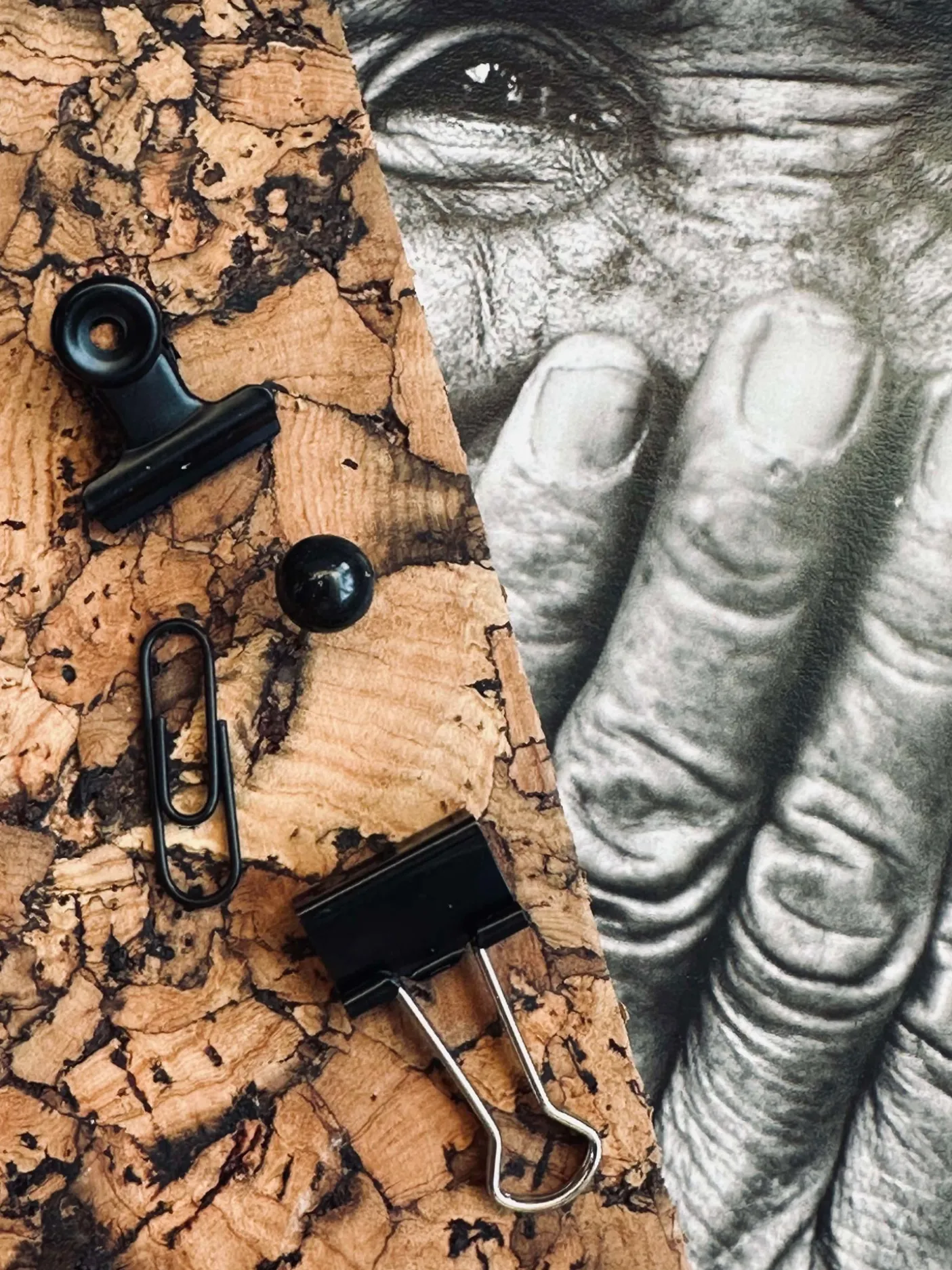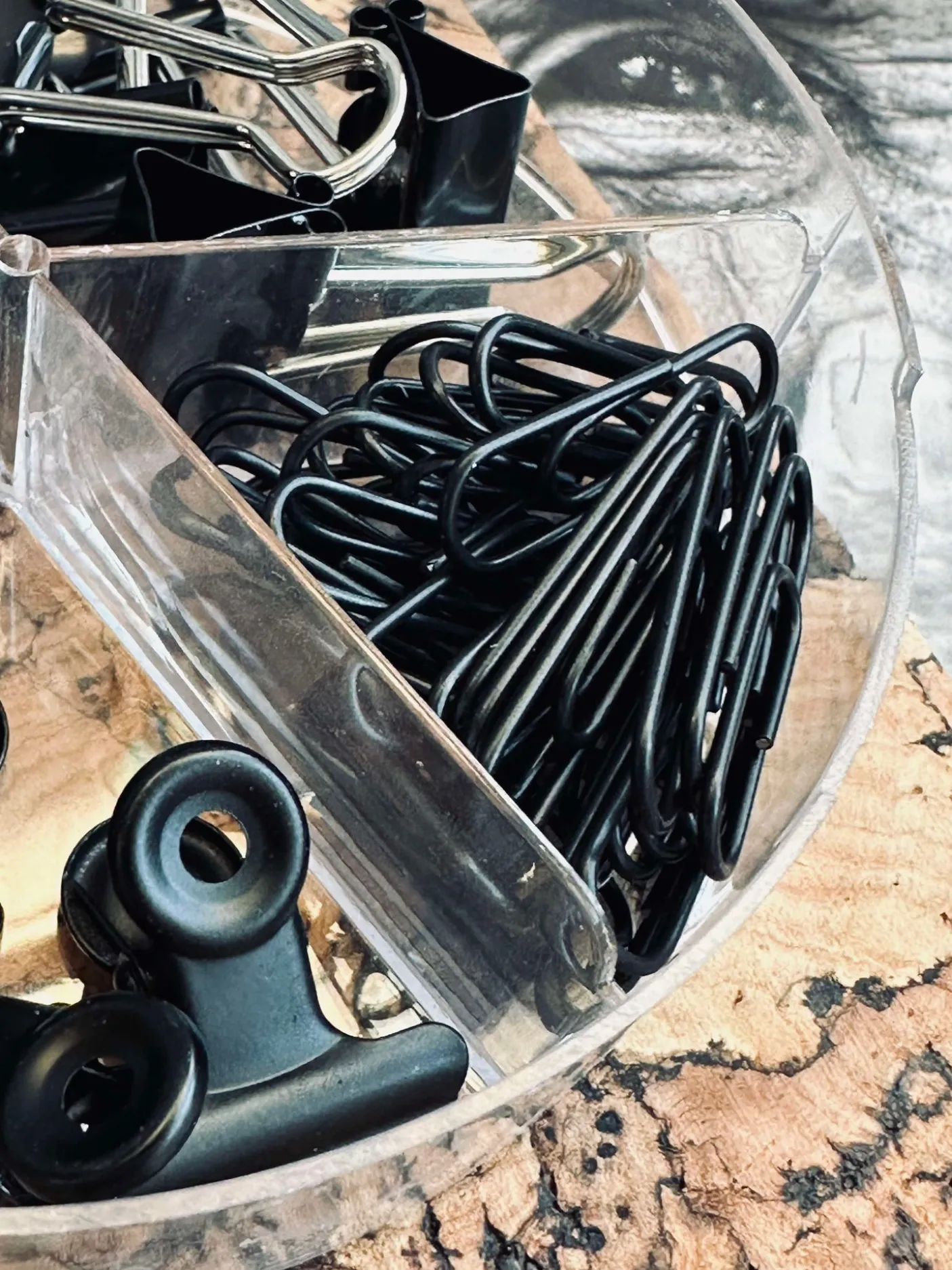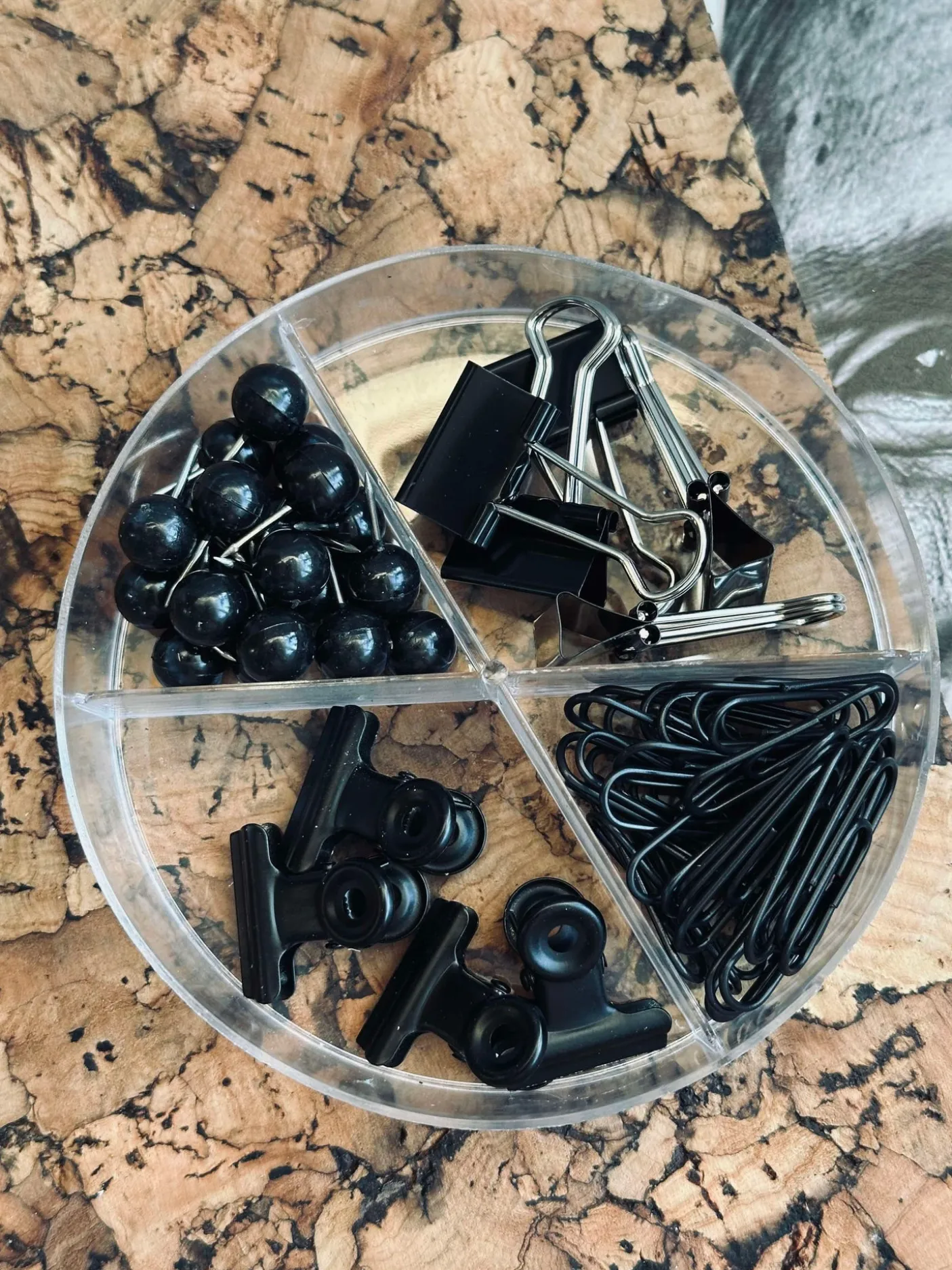 Kontorsæt bestående af store og små klemmer, papirclips og tegnestifter.