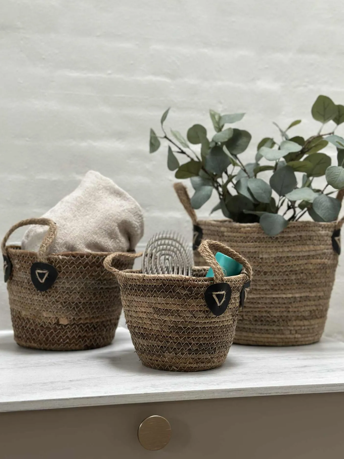 Flotte kurve til opbevaring i bananblade med hanke i jute.