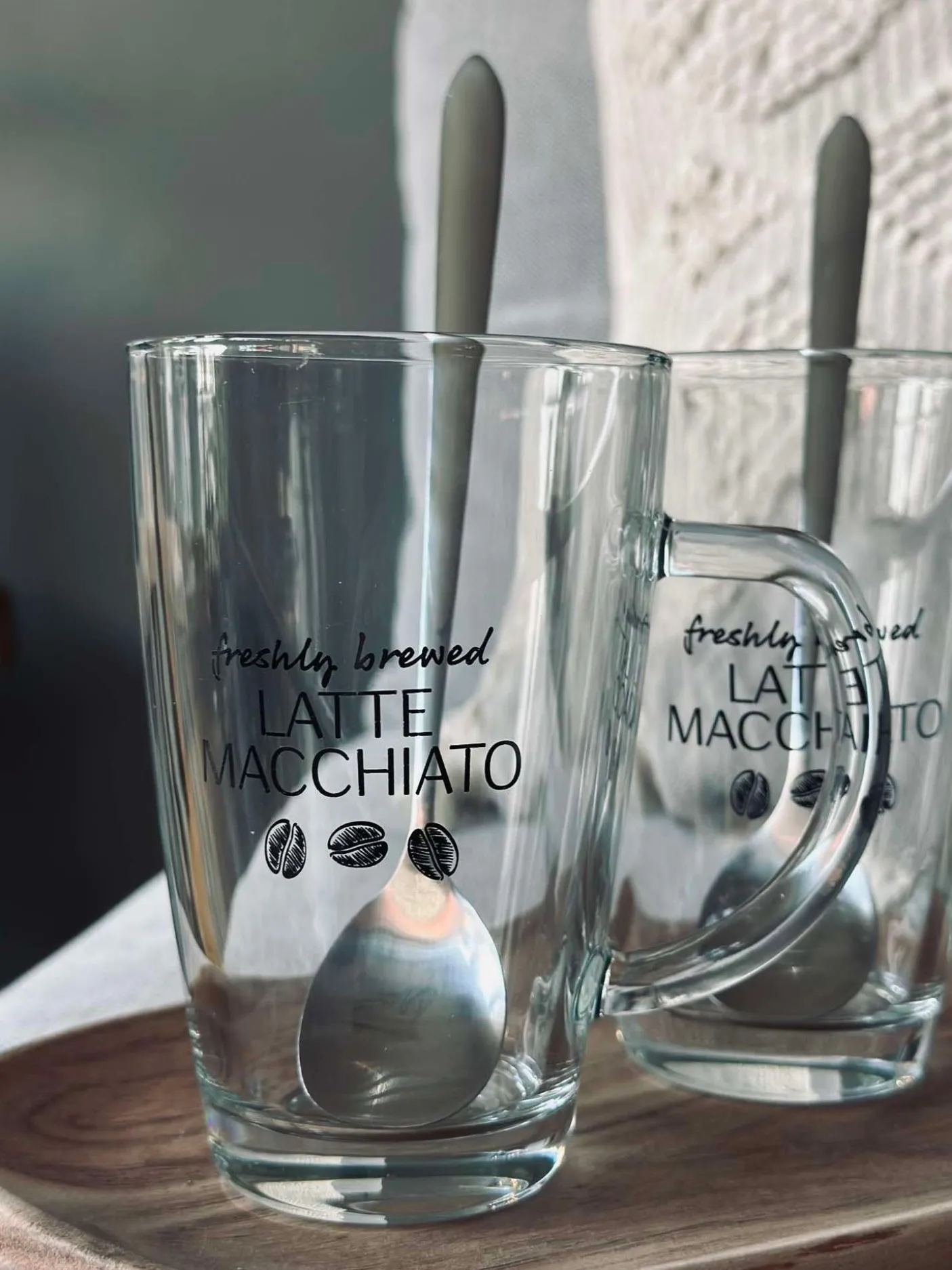 2x latte kopper i glas med 2x skeer