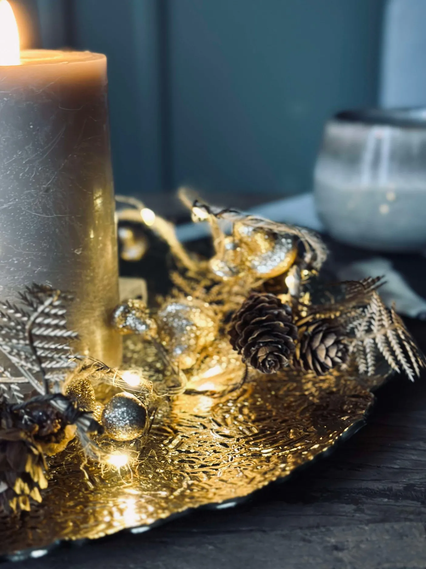 Meget dekorativ lyskæde med kogler, blade og svampe i guld.