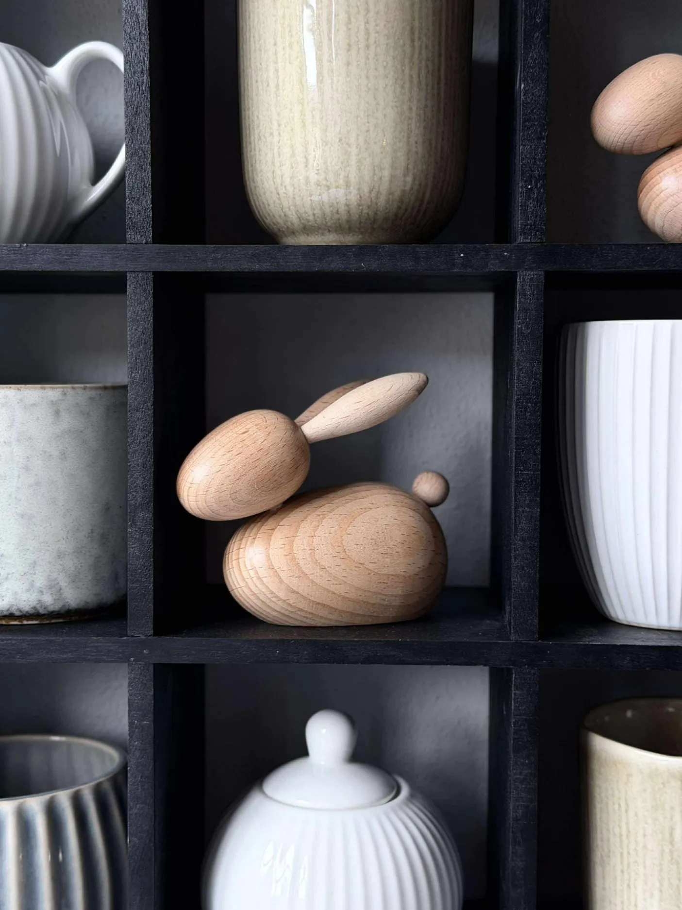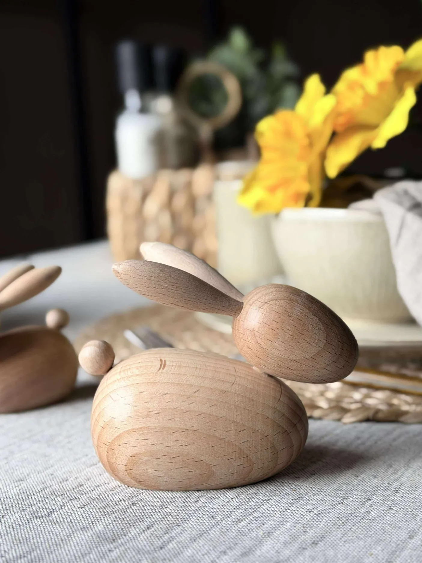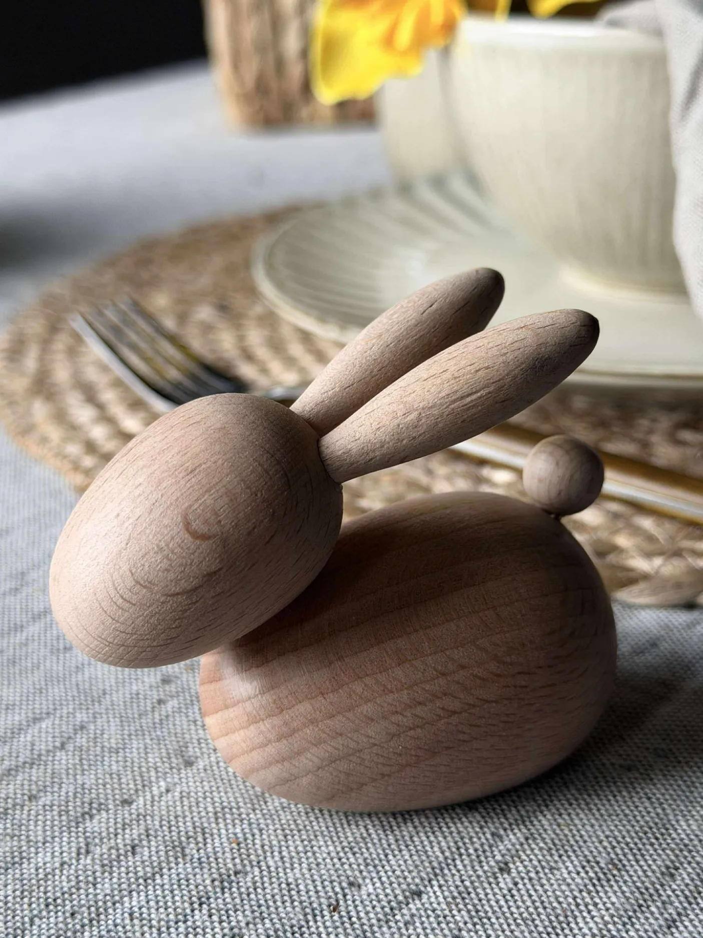 Træfiguren kanin er fremstillet af ægte bøgetræ, som bevarer sin naturlige farve. Dette materiale tilføjer en varm og autentisk følelse til ethvert rum. Bøgetræets holdbare natur sikrer, at figuren bevarer sit udseende over tid, mens den naturlige farve harmonerer med forskellige indretningsstile og skaber en jordnær atmosfære.