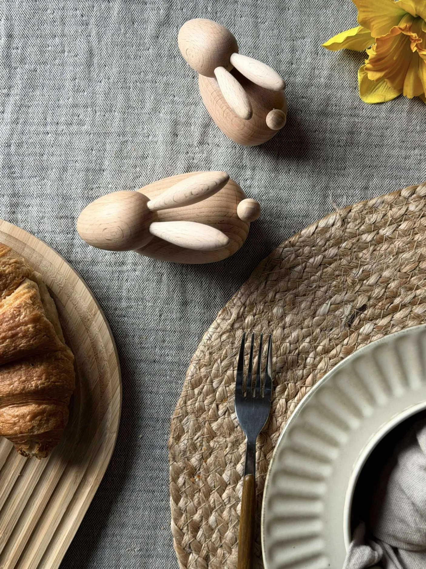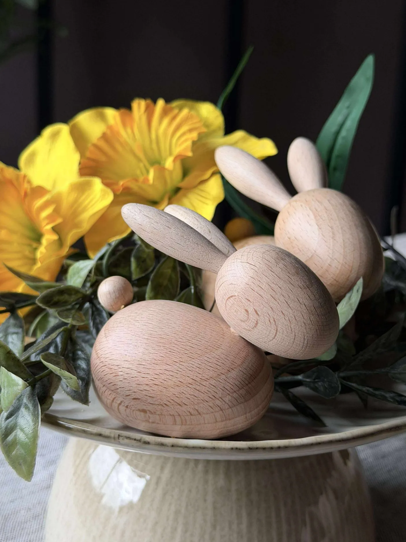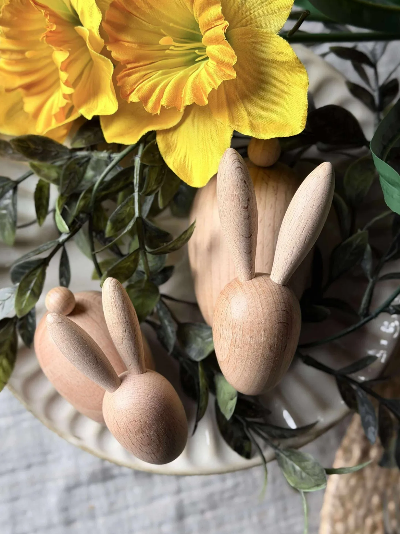 Træfiguren kanin er fremstillet af ægte bøgetræ, som bevarer sin naturlige farve. Dette materiale tilføjer en varm og autentisk følelse til ethvert rum. Bøgetræets holdbare natur sikrer, at figuren bevarer sit udseende over tid, mens den naturlige farve harmonerer med forskellige indretningsstile og skaber en jordnær atmosfære.