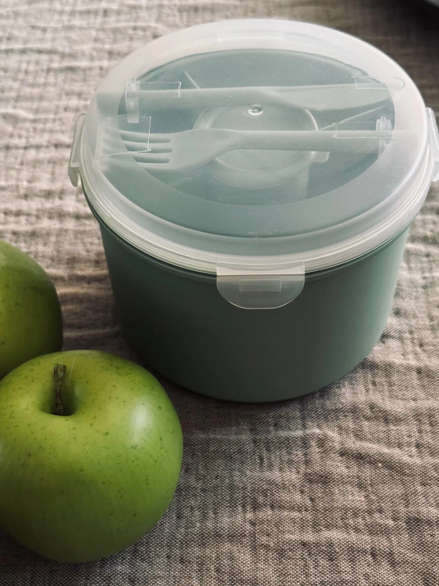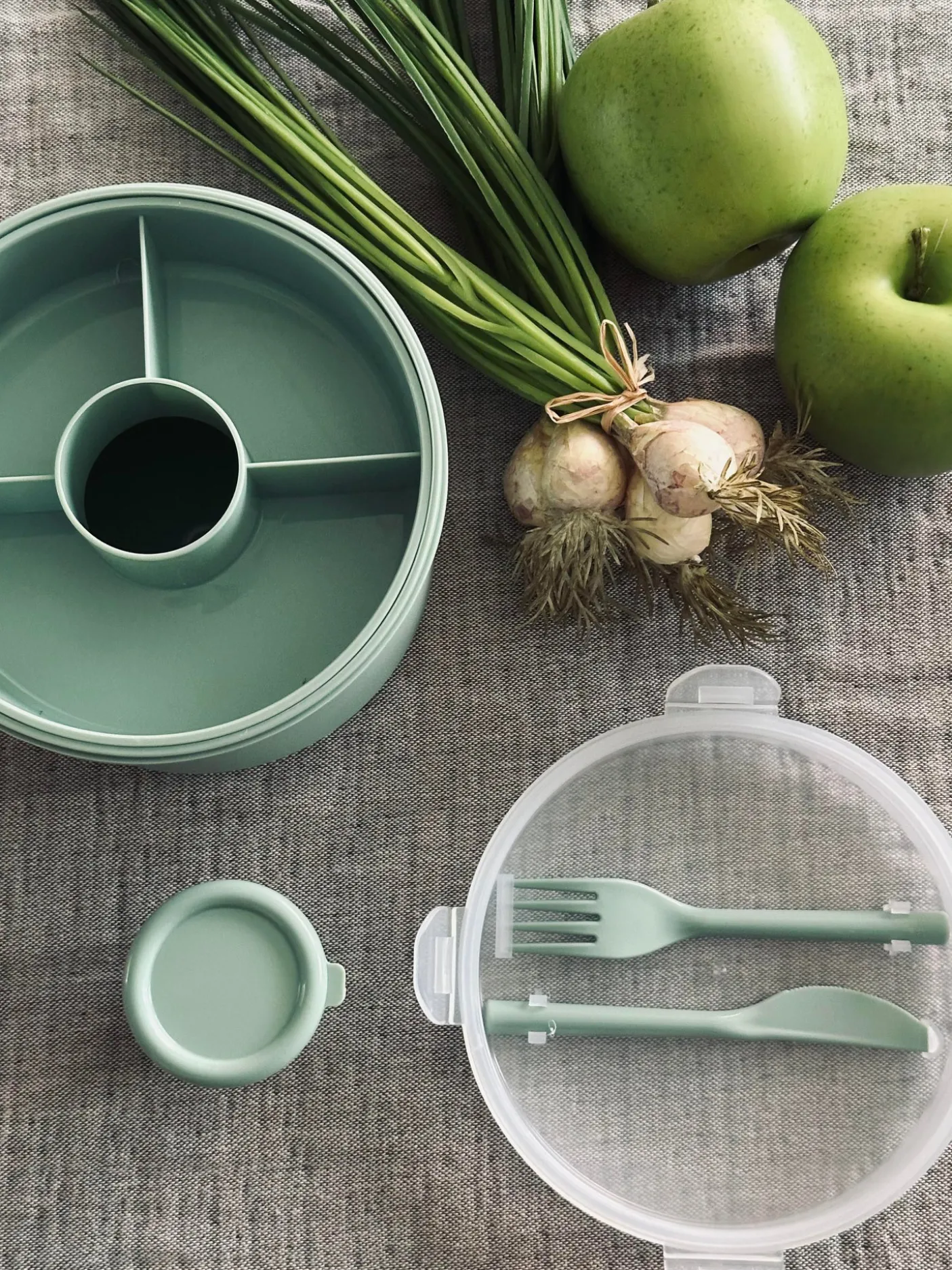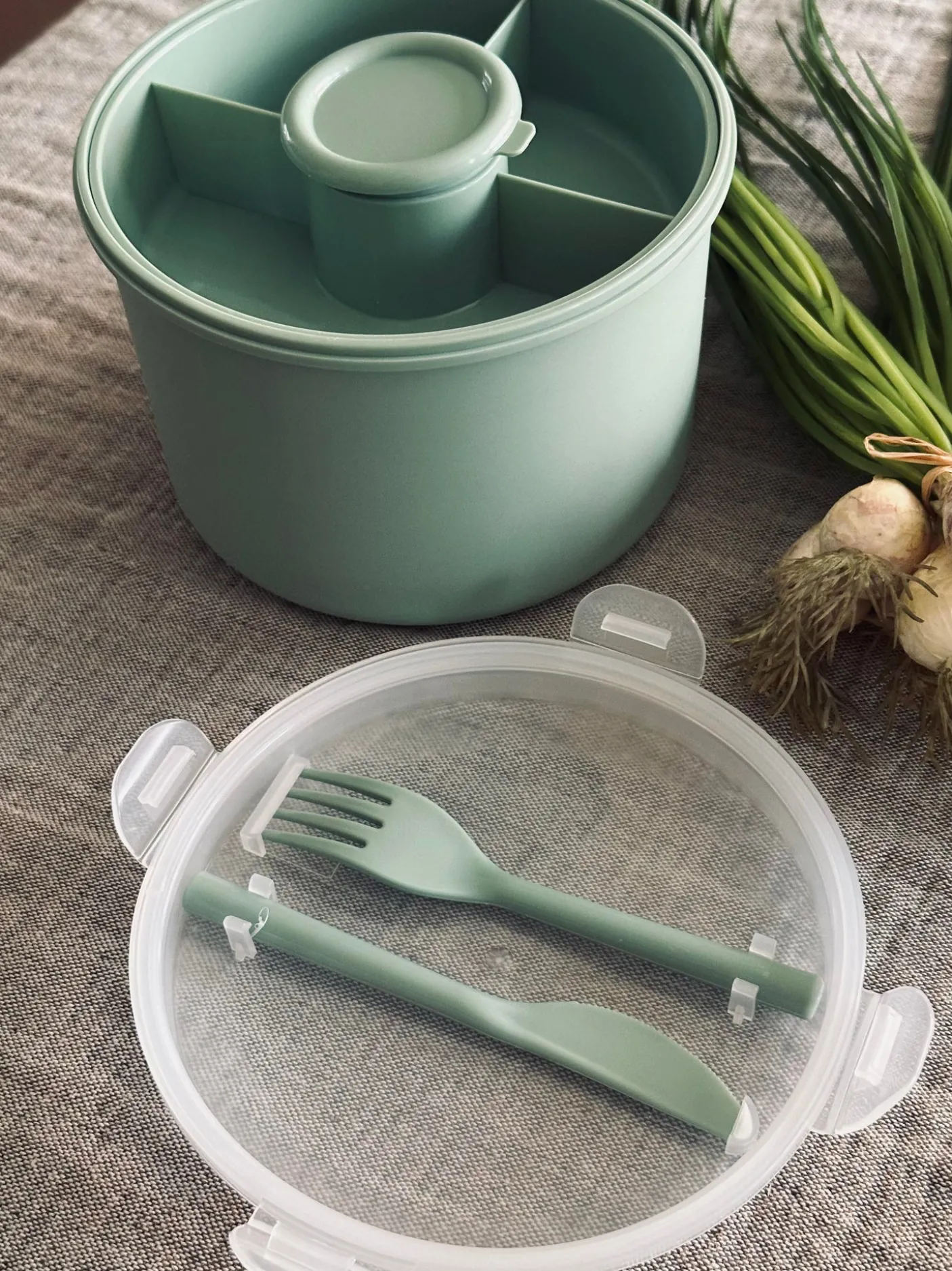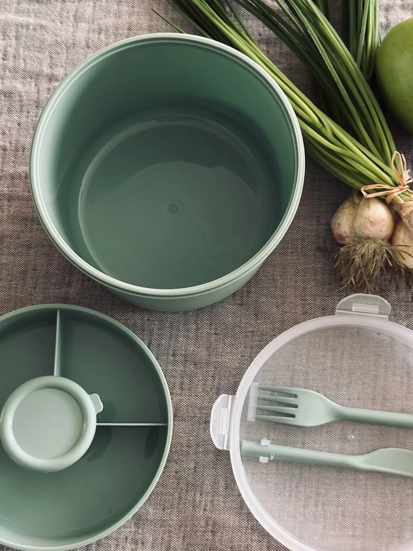 Madkasse til salat med ét stort rum og en indsats med plads til 4 toppings og dressing bøtte med låg.
