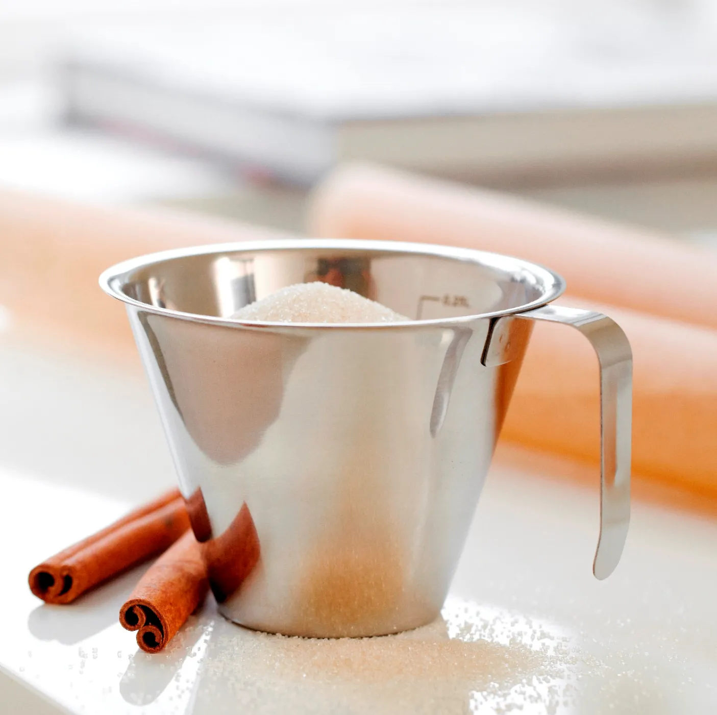Målebæger i rustfrit stål har en hældetud og et åbent håndtag, der giver mulighed for nem opbevaring.