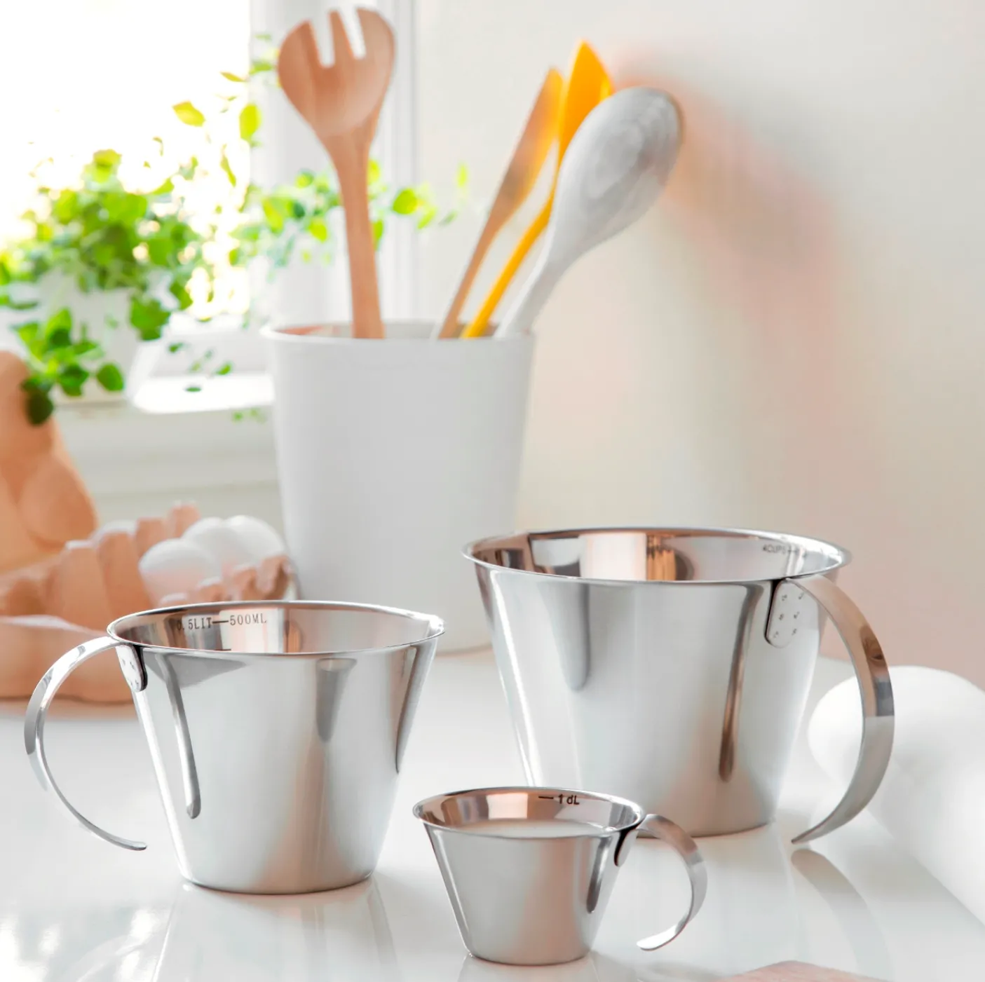 Målekande i rustfrit stål har en hældetud og et åbent håndtag, der giver mulighed for nem opbevaring.