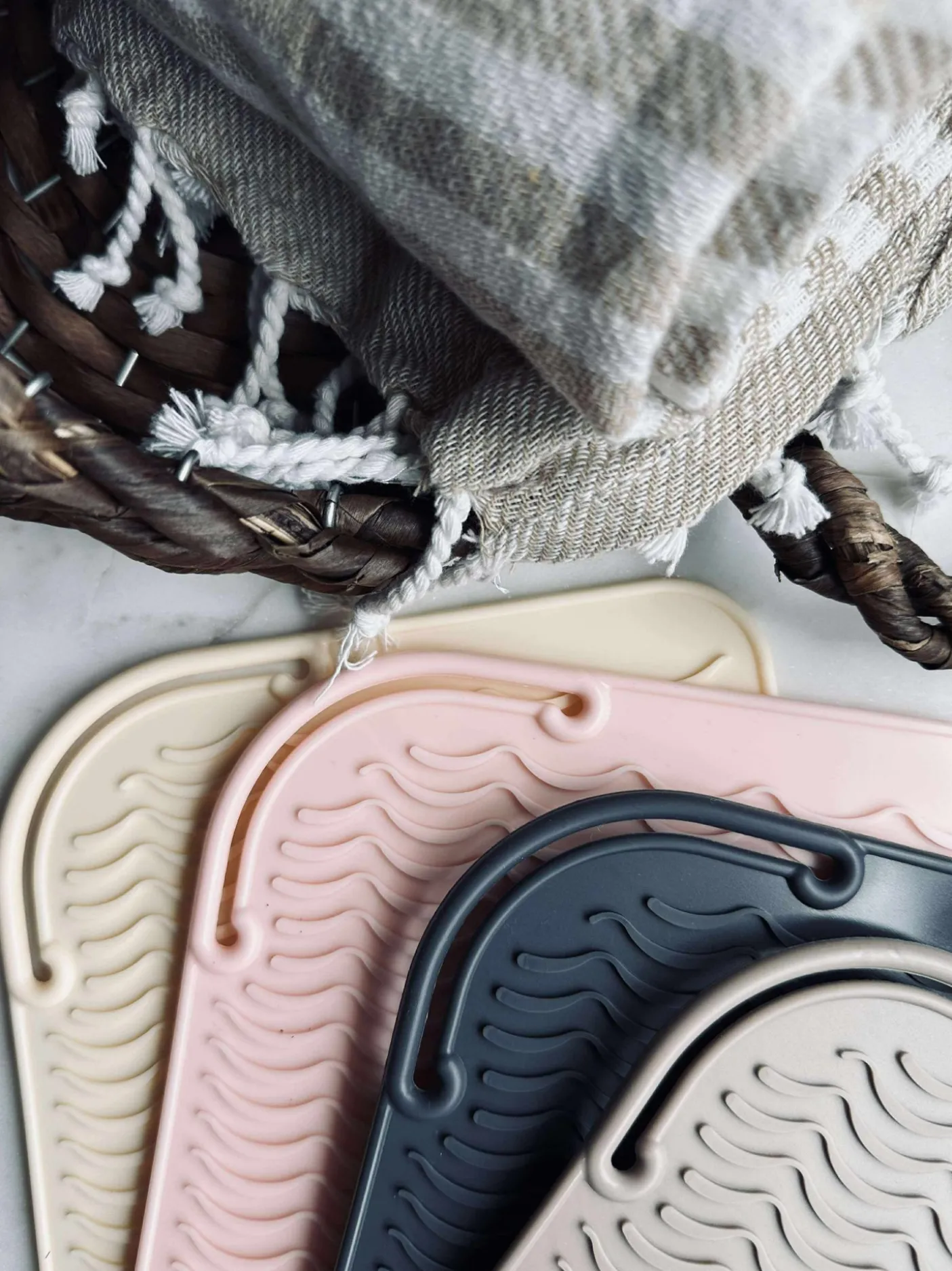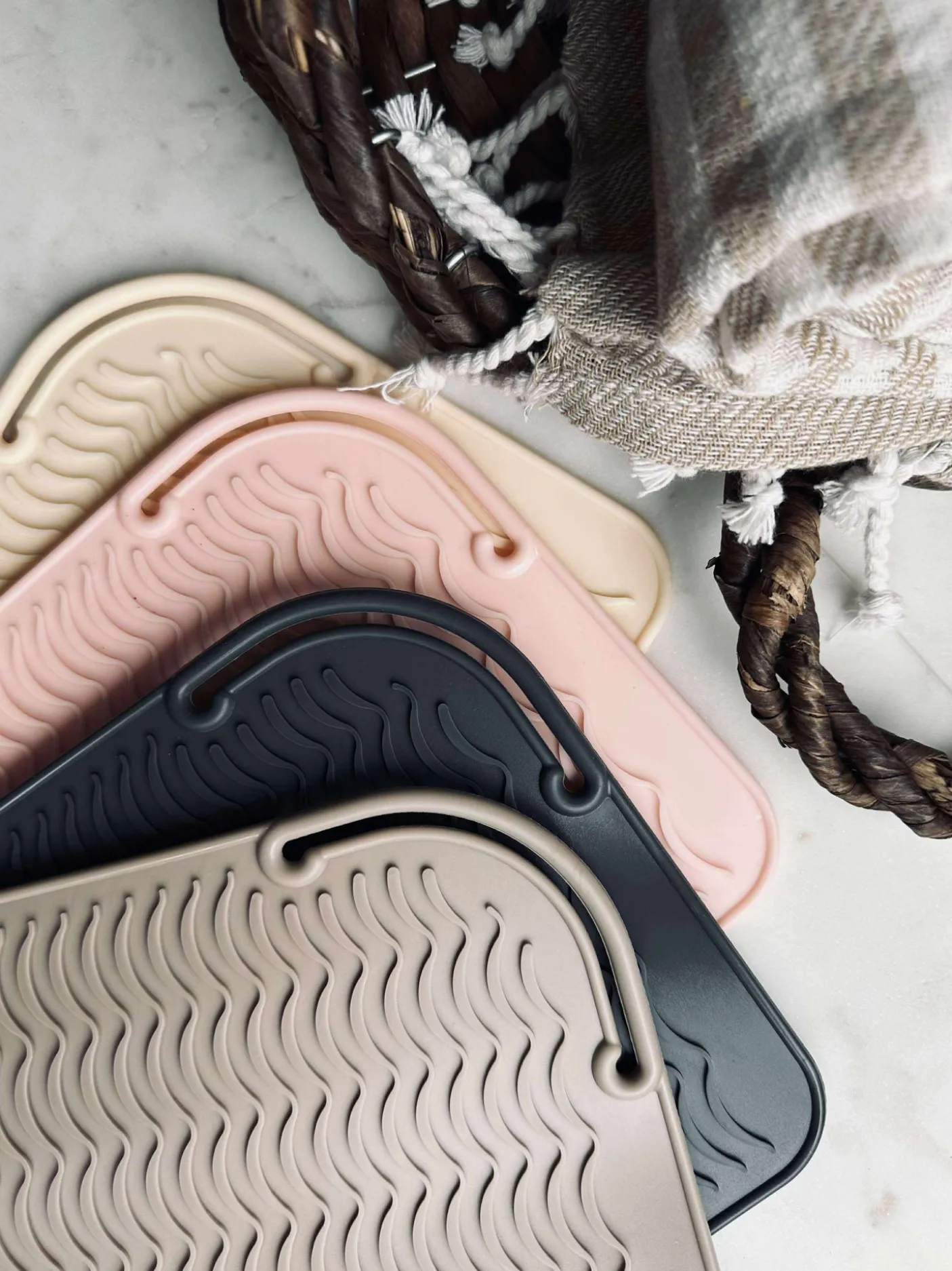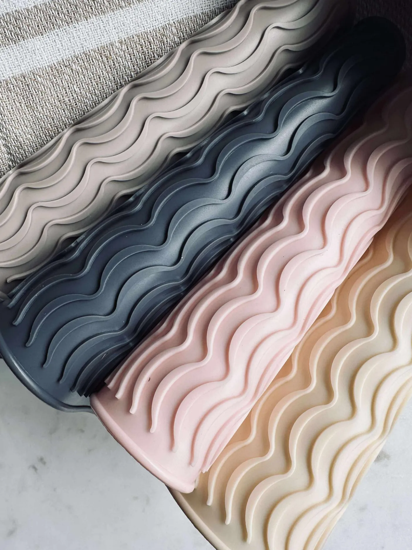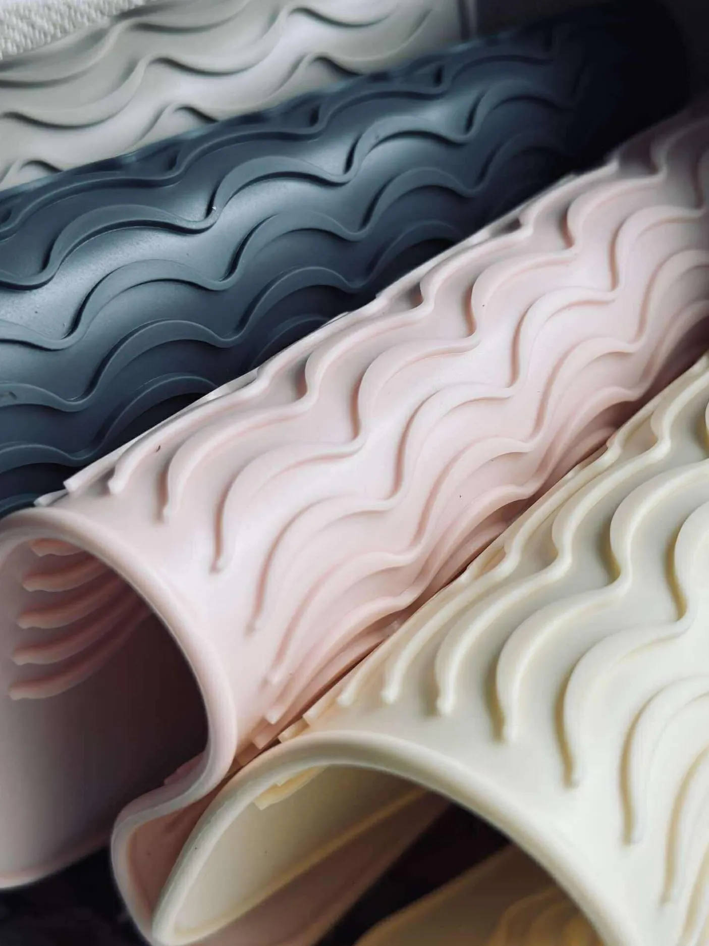 Måtten er lavet i silikone og kommer i et farvemix. Overfladen har et struktur/vævet mønster, som giver et taktilt udtryk.