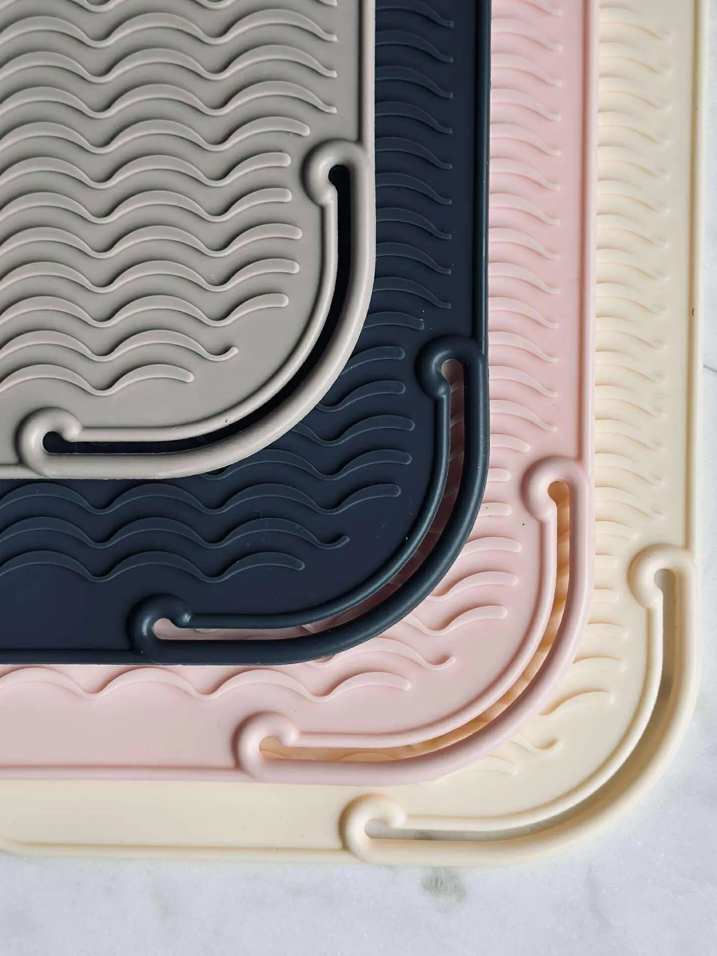 Måtte til fladjern – Mix er en enkel silikonemåtte til brug sammen med fladjern, krøllejern og andre varme apparater. Den har et multifarvet udtryk og en struktureret, vævet overflade, der giver et roligt og praktisk look på bordet.