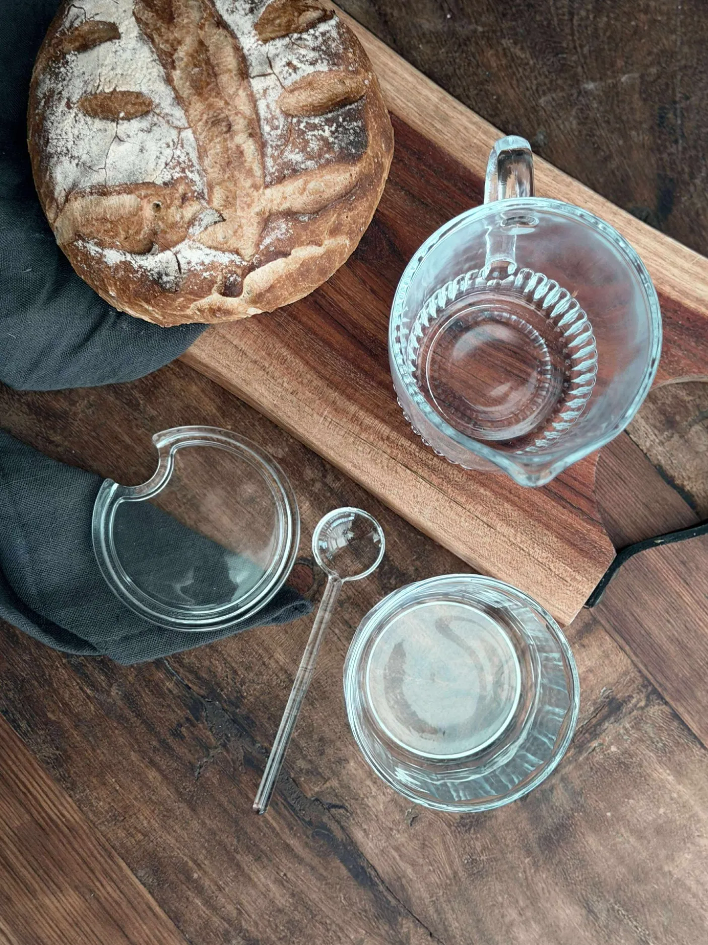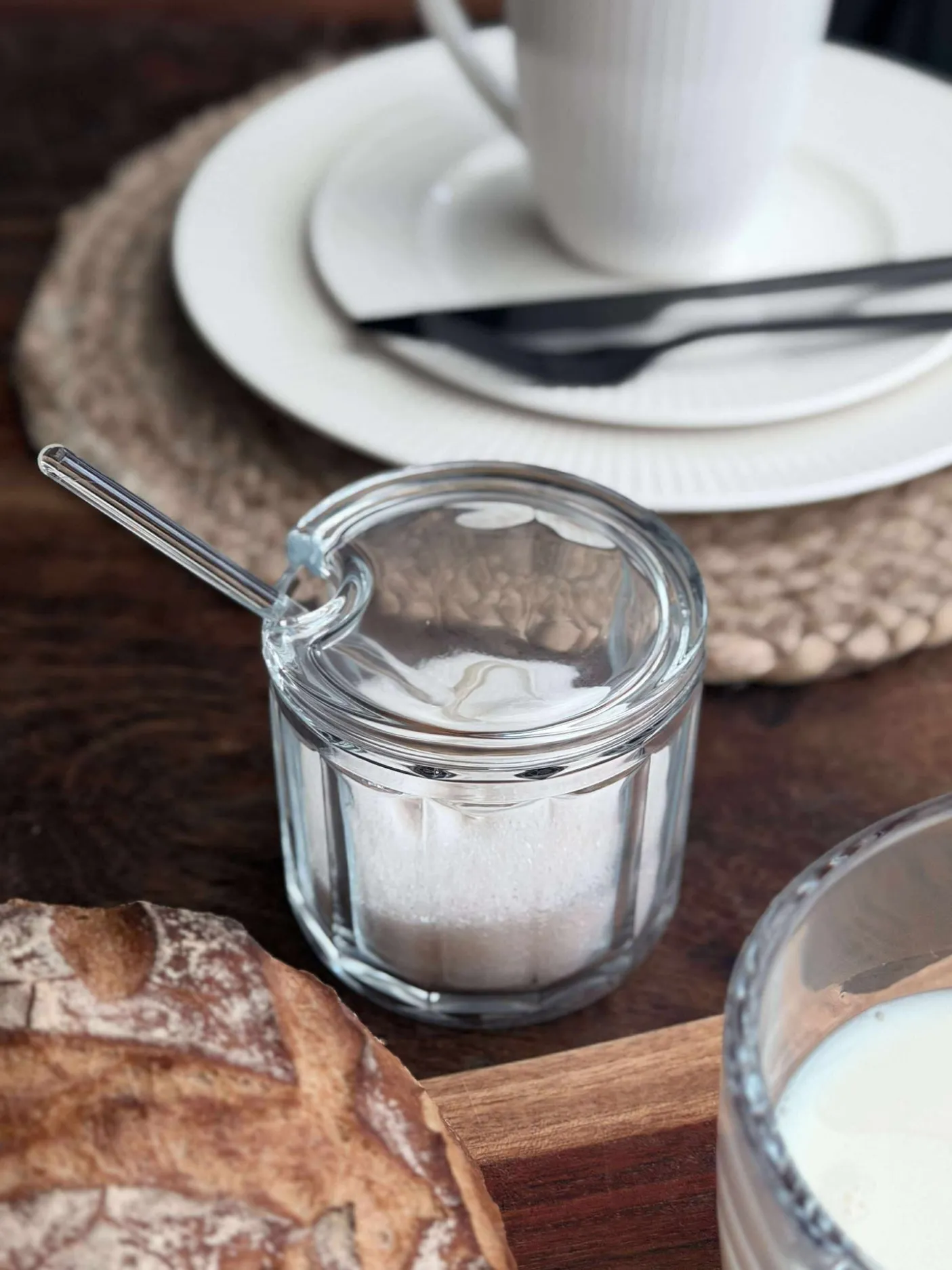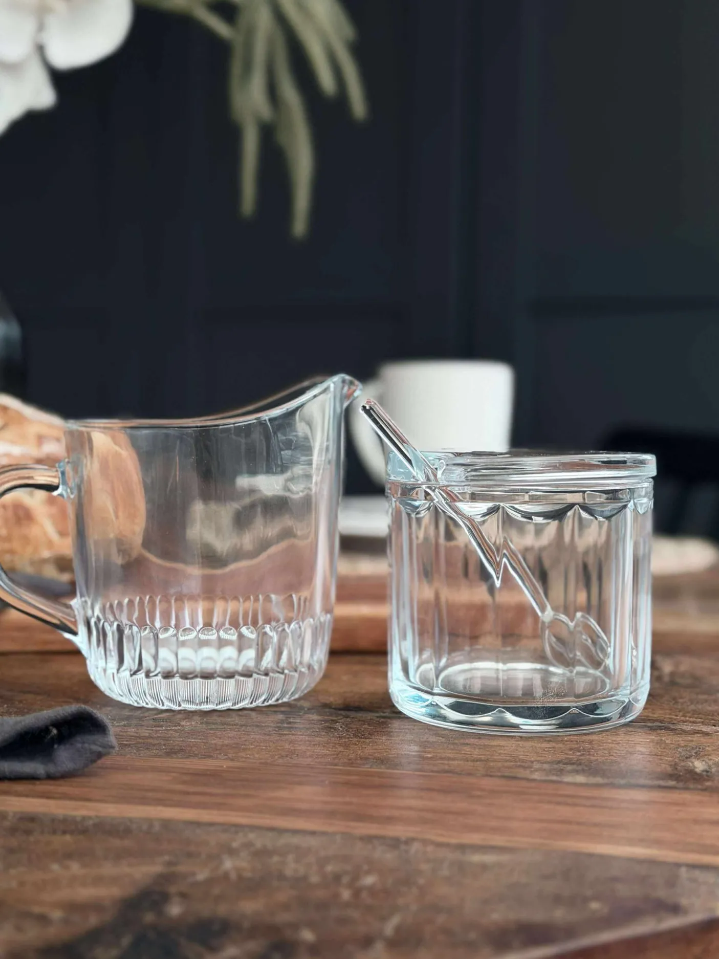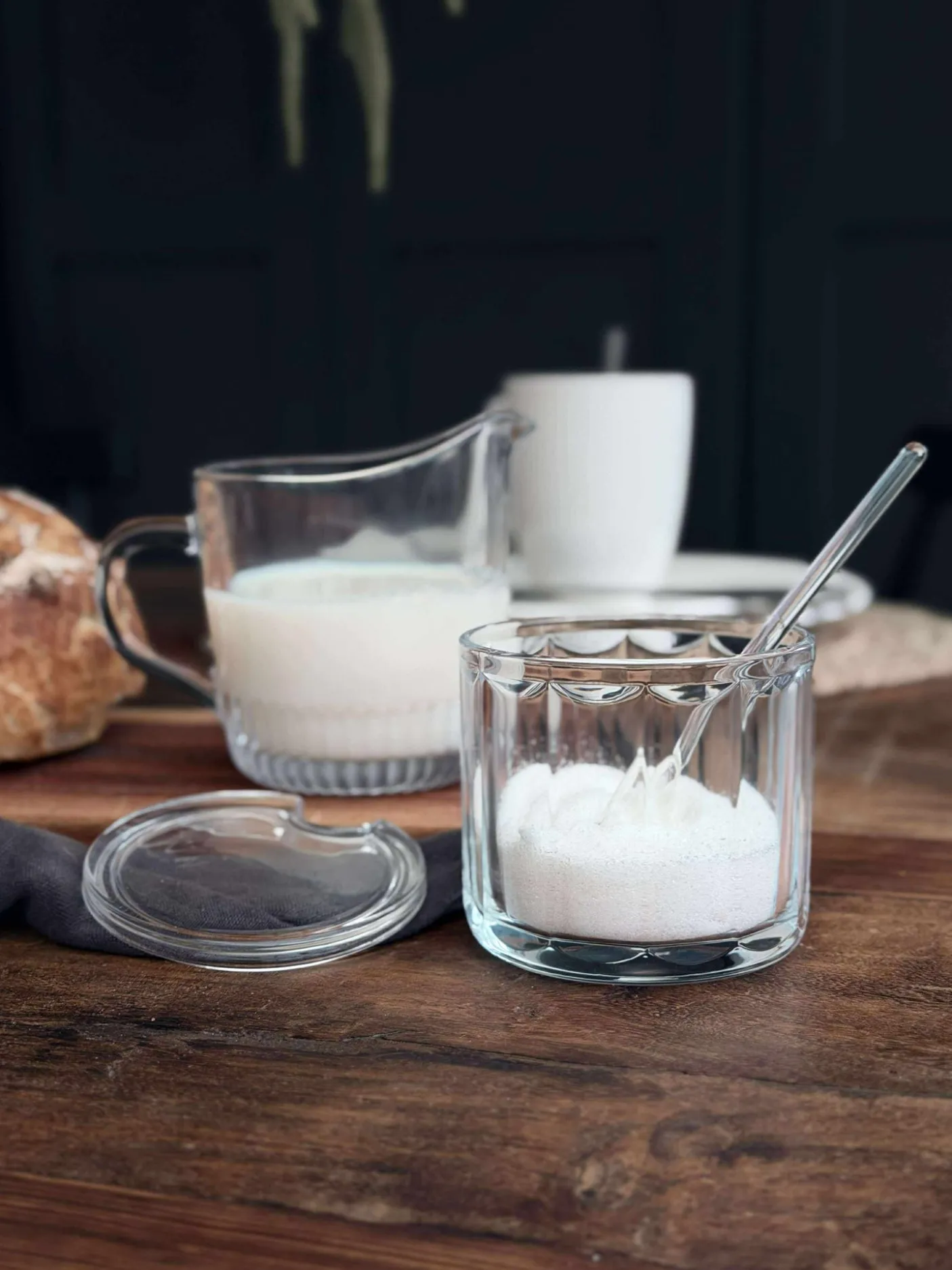 Sæt med mælkekande og sukkerskål i klar glas.