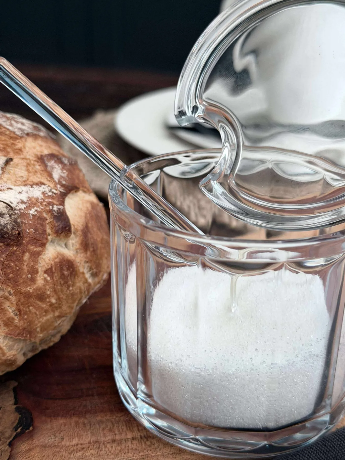 Sukkerskål er med låg og ske.