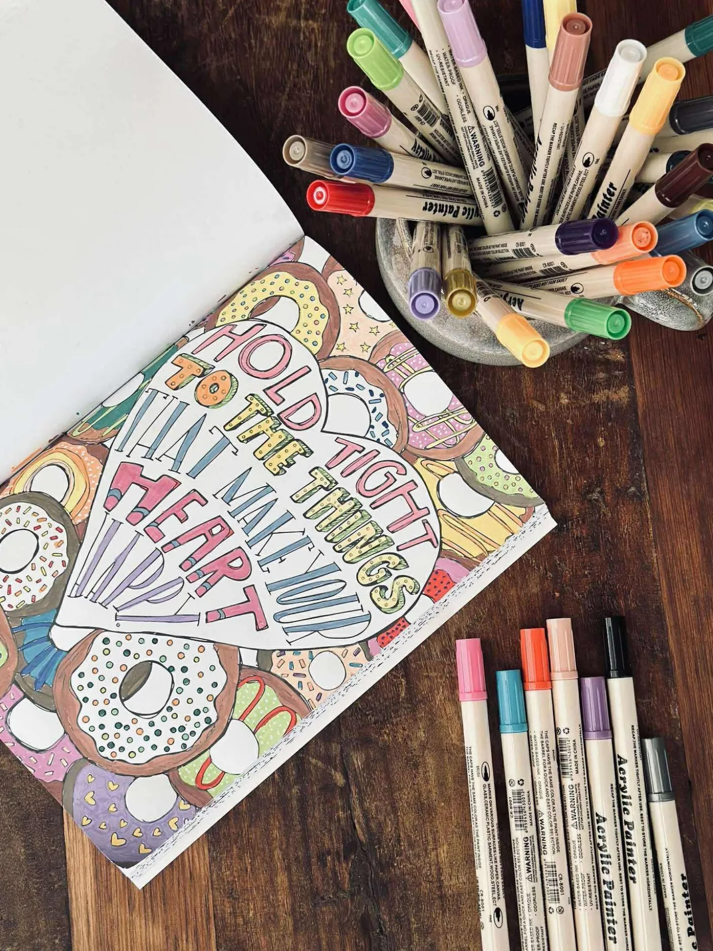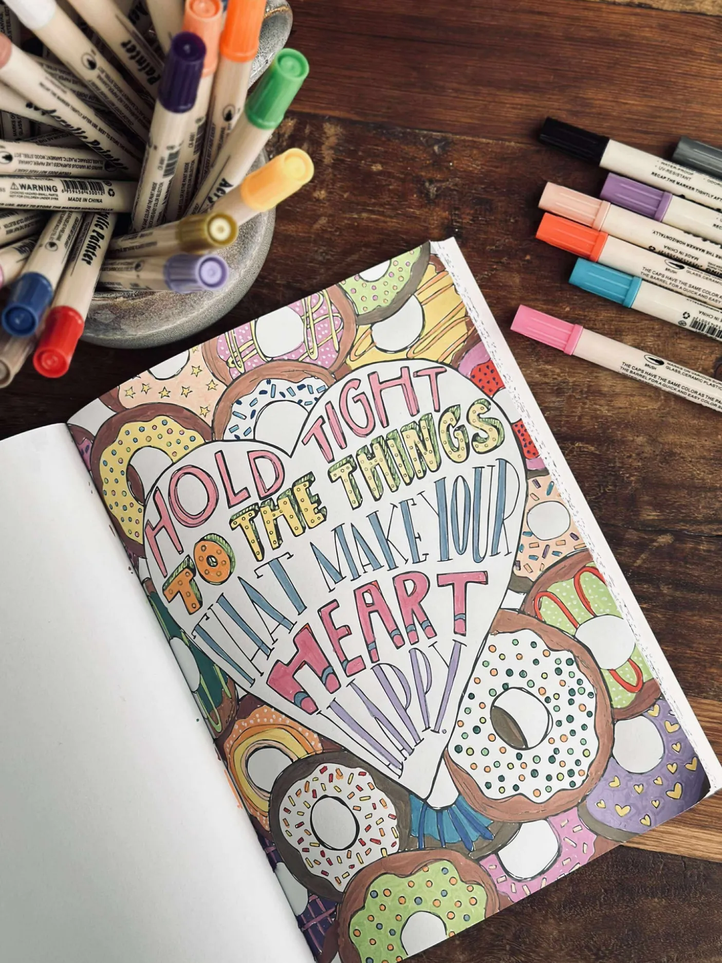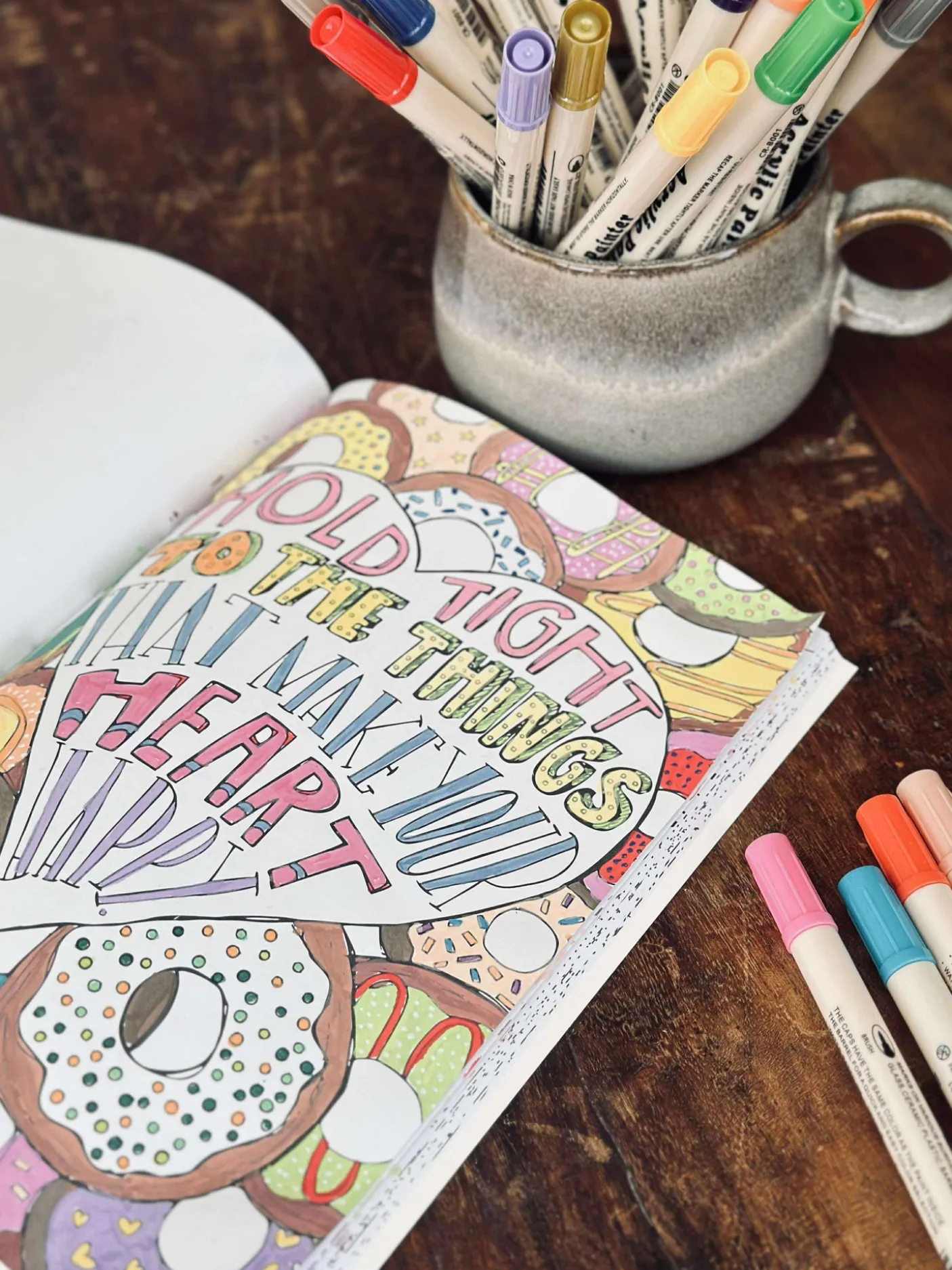 Motiverne varierer fra enkle former og hjerter til mere detaljerede mønstre og symboler, og kan farvelægges i eget tempo – uden krav eller forventninger.