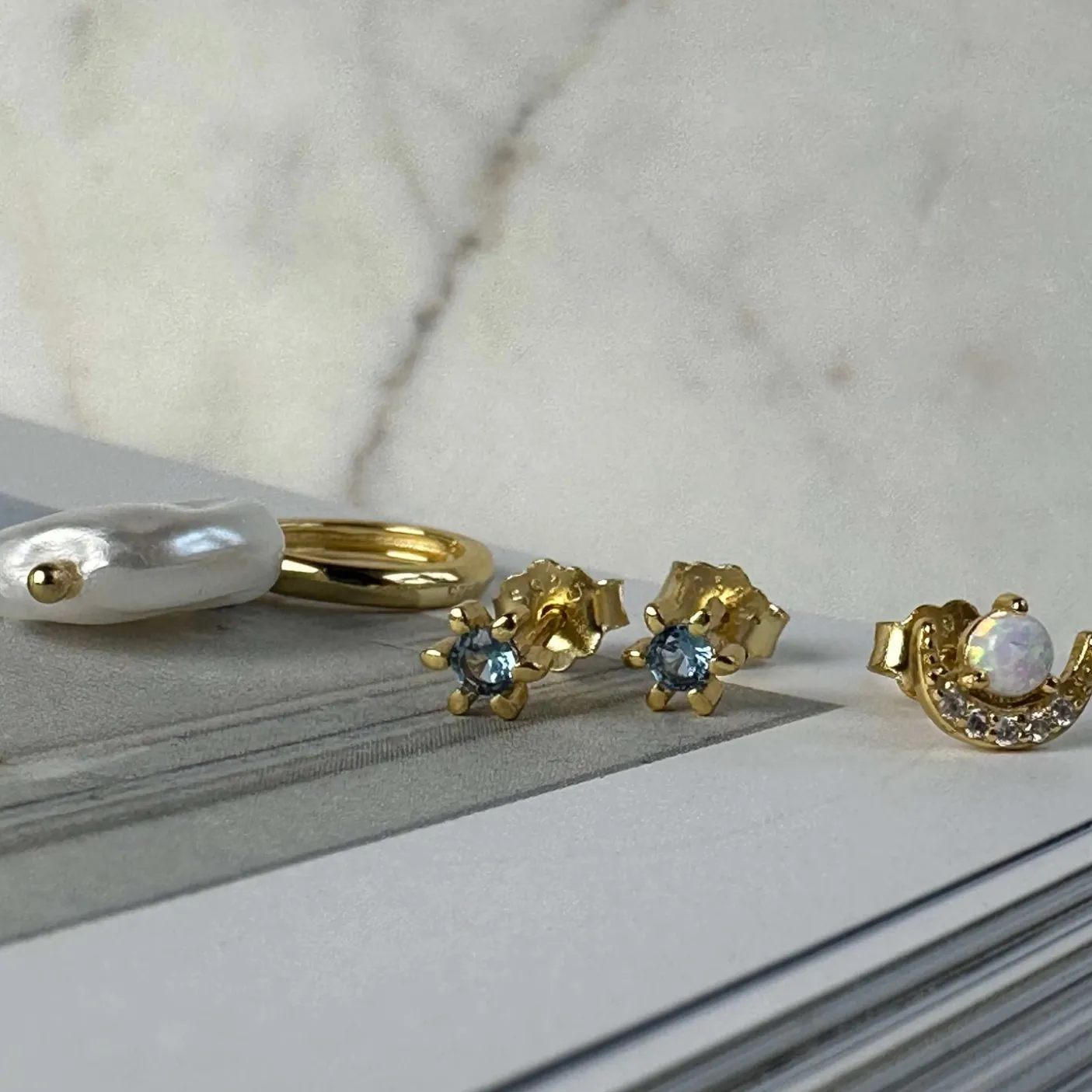 Du får et mix på fire enkelte øreringe til et skarp pris. Det hele er udført i solid Sterling sølv og forgyldt med 18K guld. Perlen i den enkelte statement ørering er en faux perle – den er ikke tung og tynger derfor ikke dine huller i ørerne nedad.