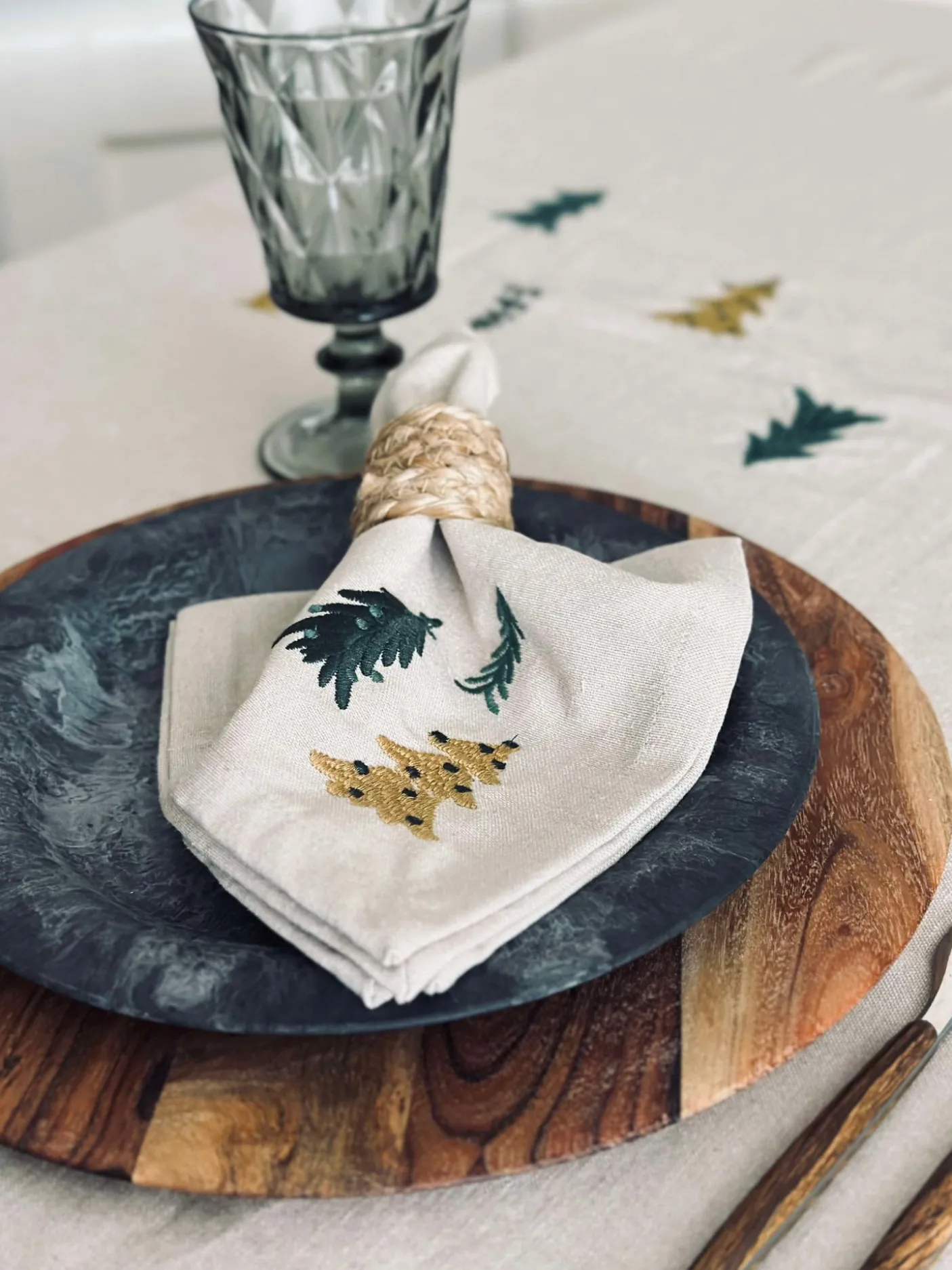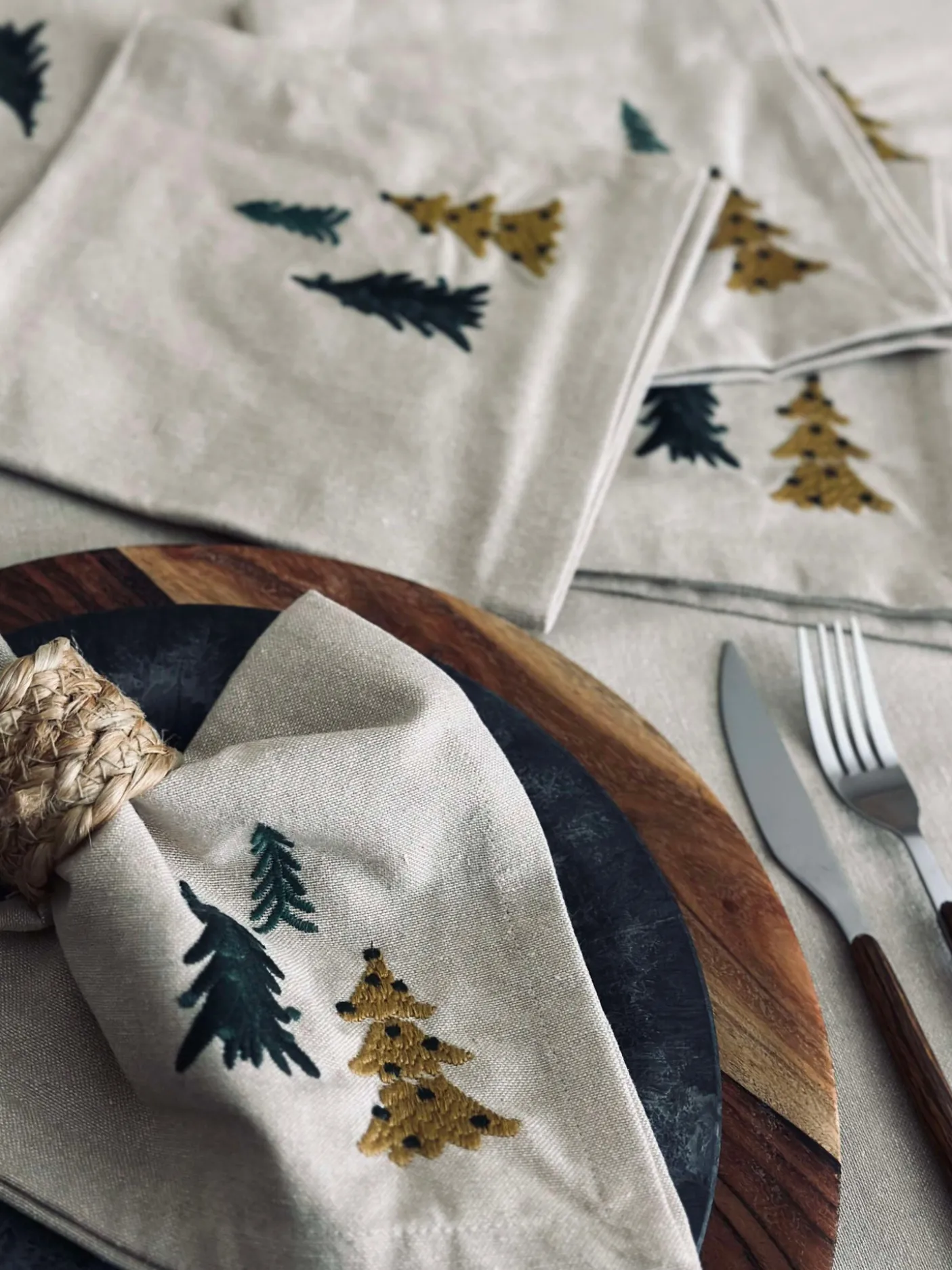 Mundservietter med broderet træer.