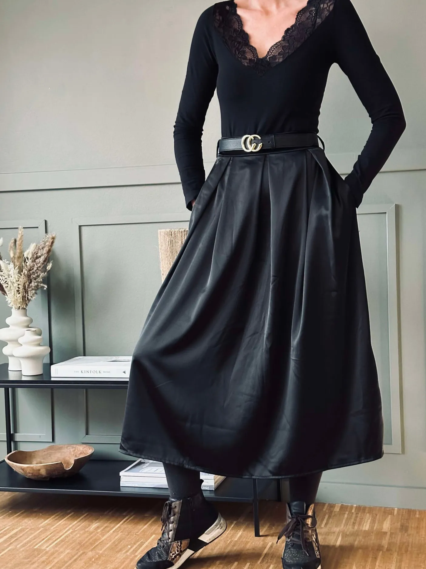 Smuk og elegant nederdel Leonora i black. Materiale: 100% polyester med et fint silkelook, der giver et afdæmpet glansfuldt udtryk. Fås i to størrelser: S/M og L/XL. Tilsæt evt. et fint bælte for ekstra finish.