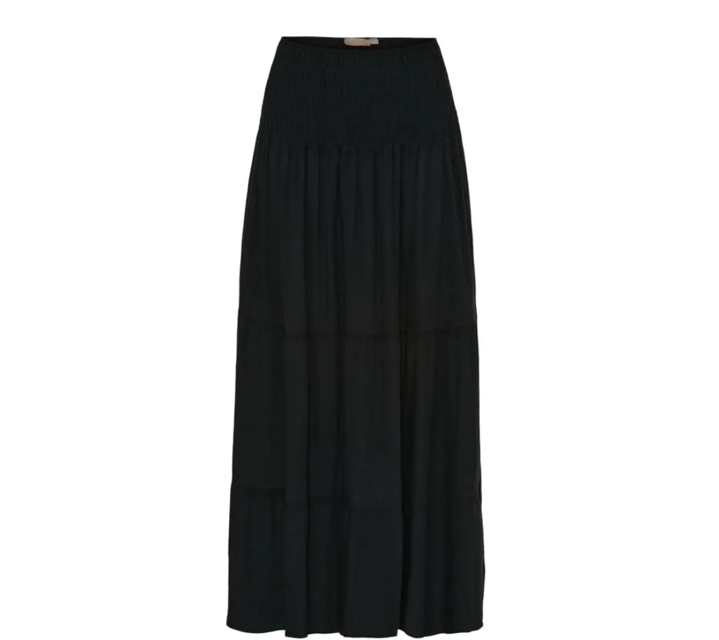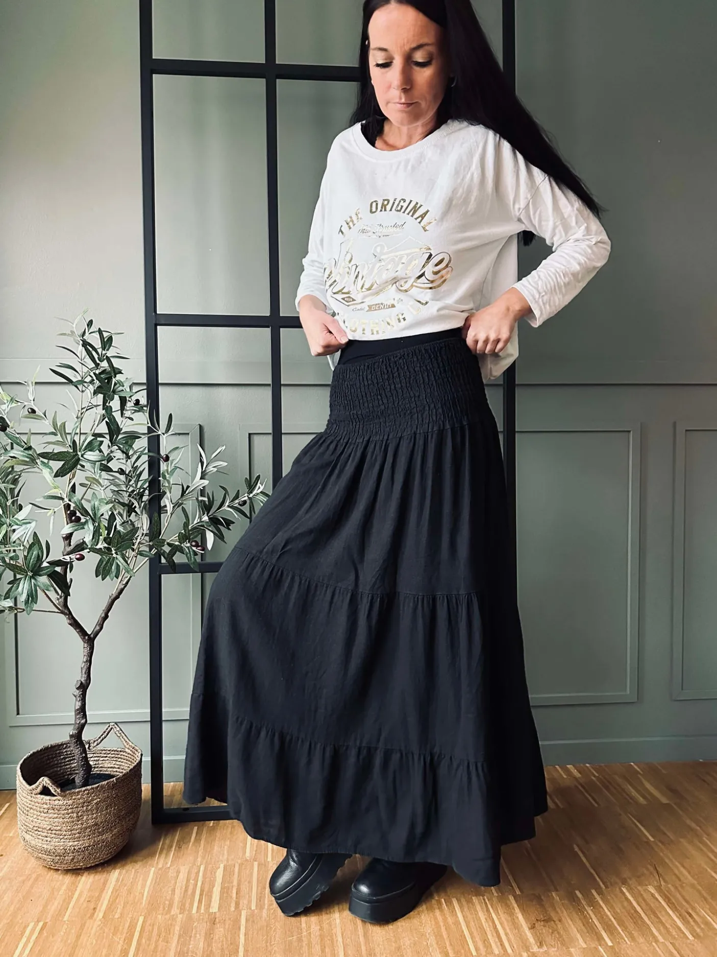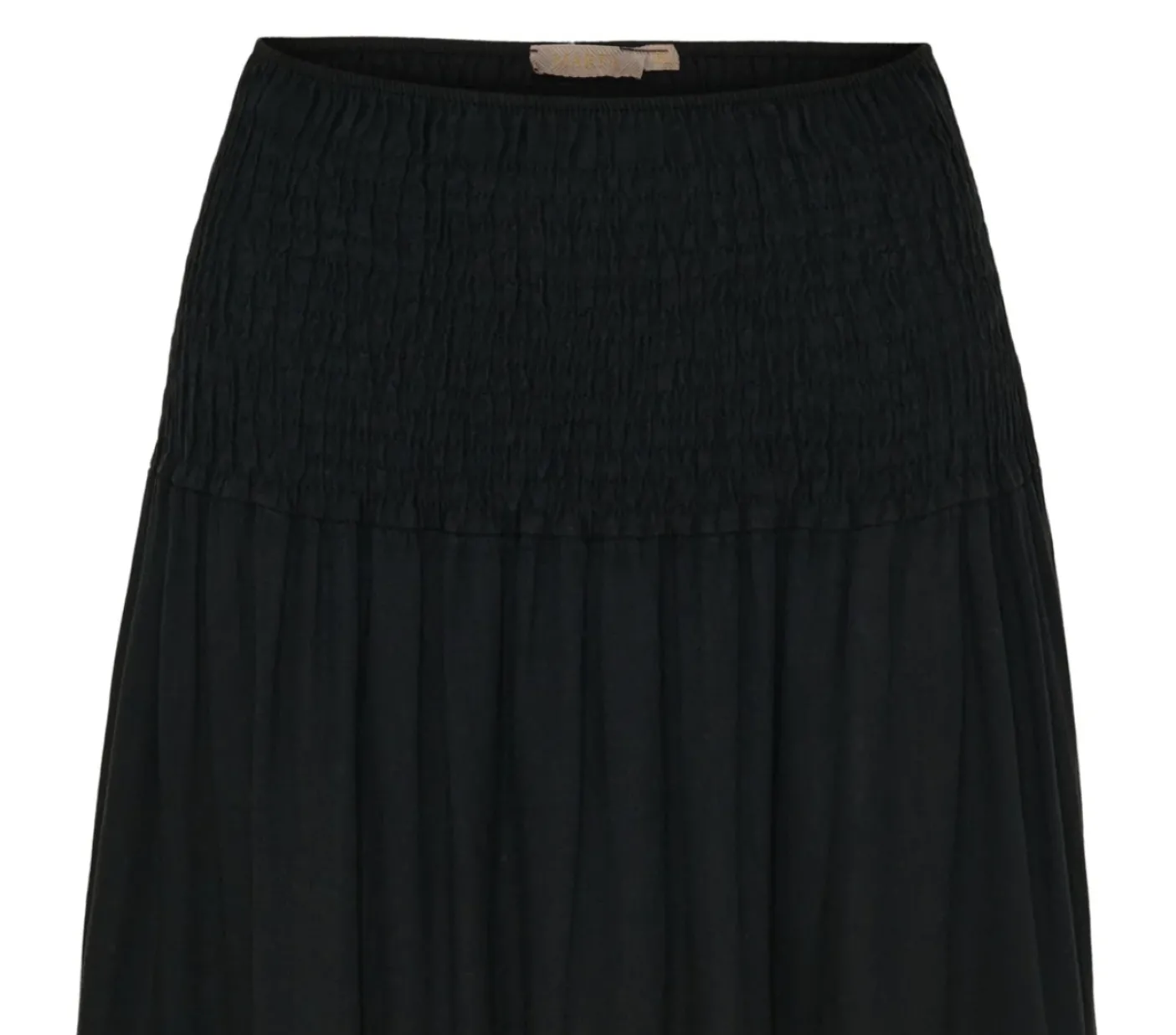 Nederdel med smock – Black er en onesize smock-nederdel med markant taljesmock og god bevægelsesfrihed i taljen. Materialet er angivet som 75% bomuld og 25% hør, hvilket fremstår i et ensfarvet sort udtryk. Designet er beregnet til sæsonerne forår, sommer og efterår, og snittet er i en regular pasform.