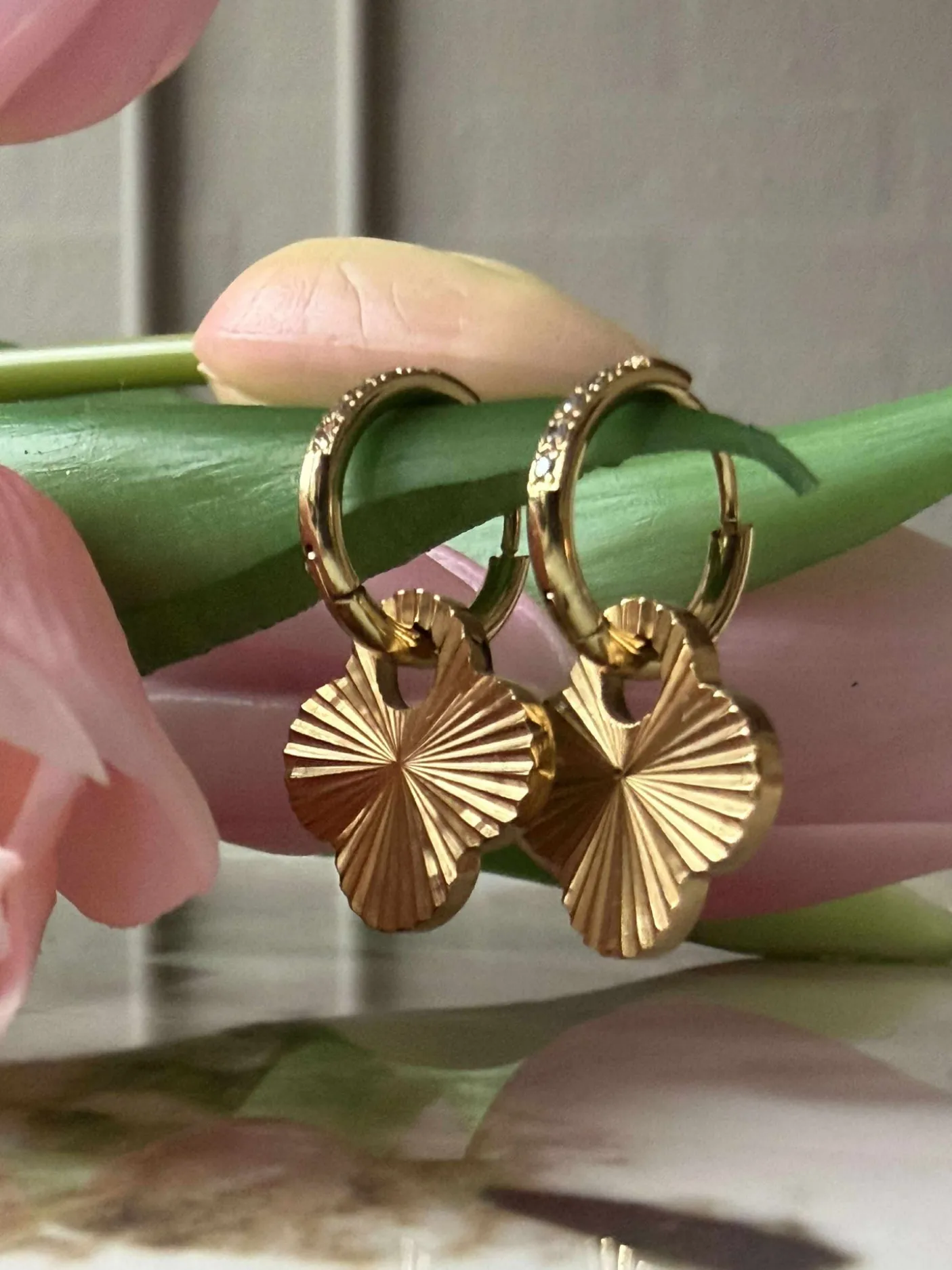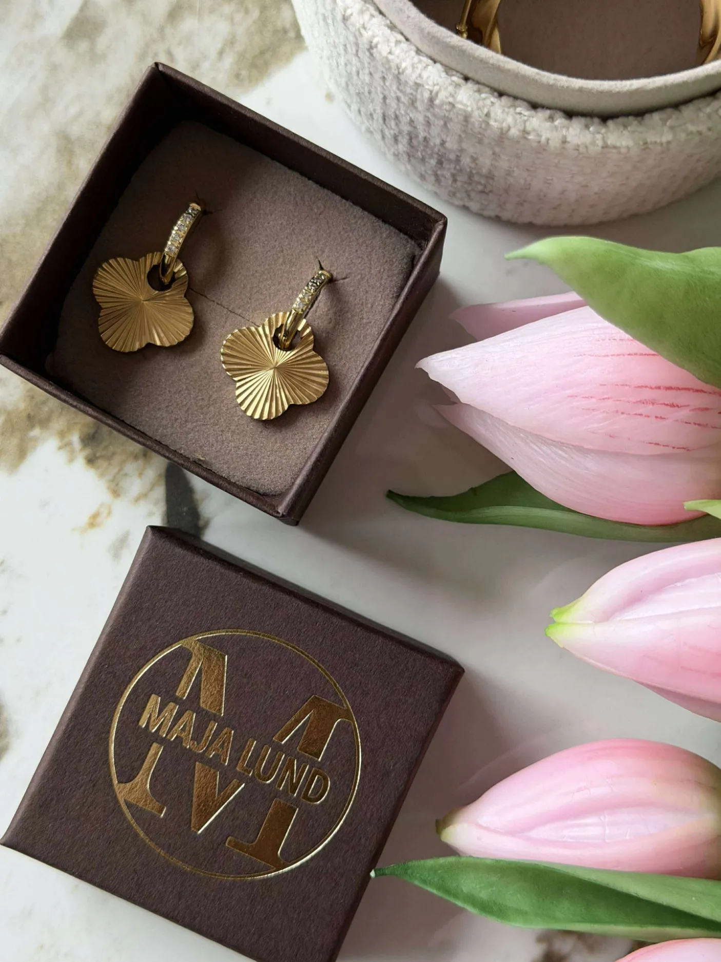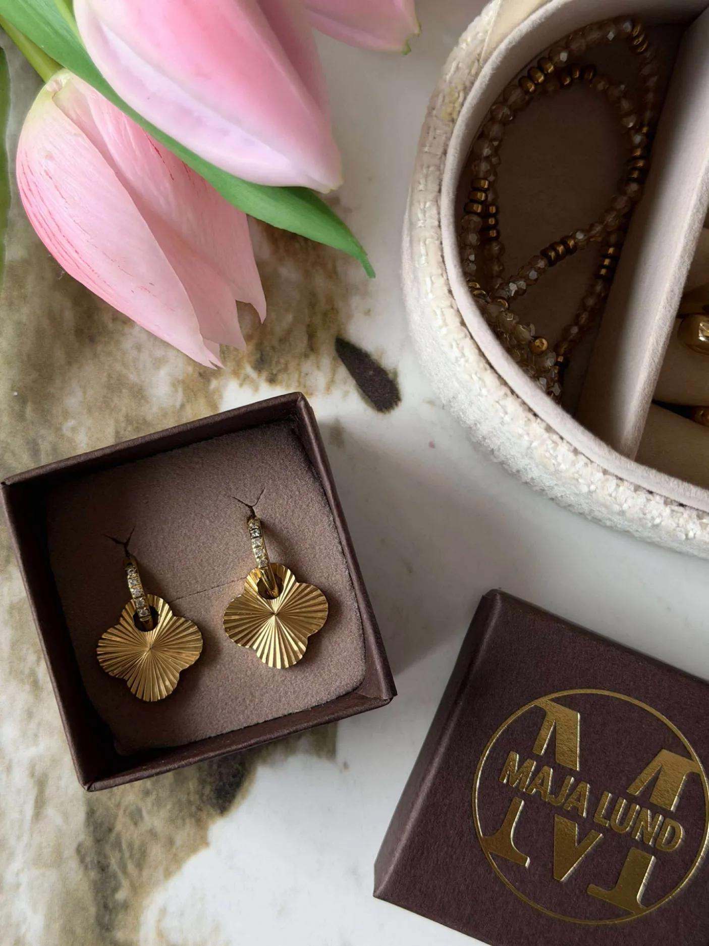 Øreringe SAGA – forgyldt er et par delikate øreringe med drop kløver-vedhæng. Fremstillet i rustfrit stål med forgyldt finish og længde 2.5 cm. Udtrykket er varmt og fint takket være den gyldne overflade, som løfter både afslappede og mere elegante looks. Designet er enkelt nok til hverdag og detaljeret nok til særlige lejligheder.