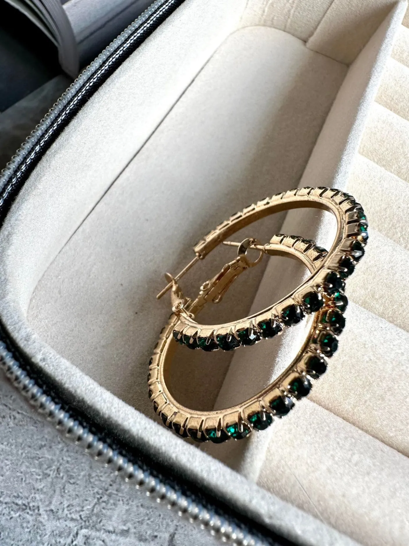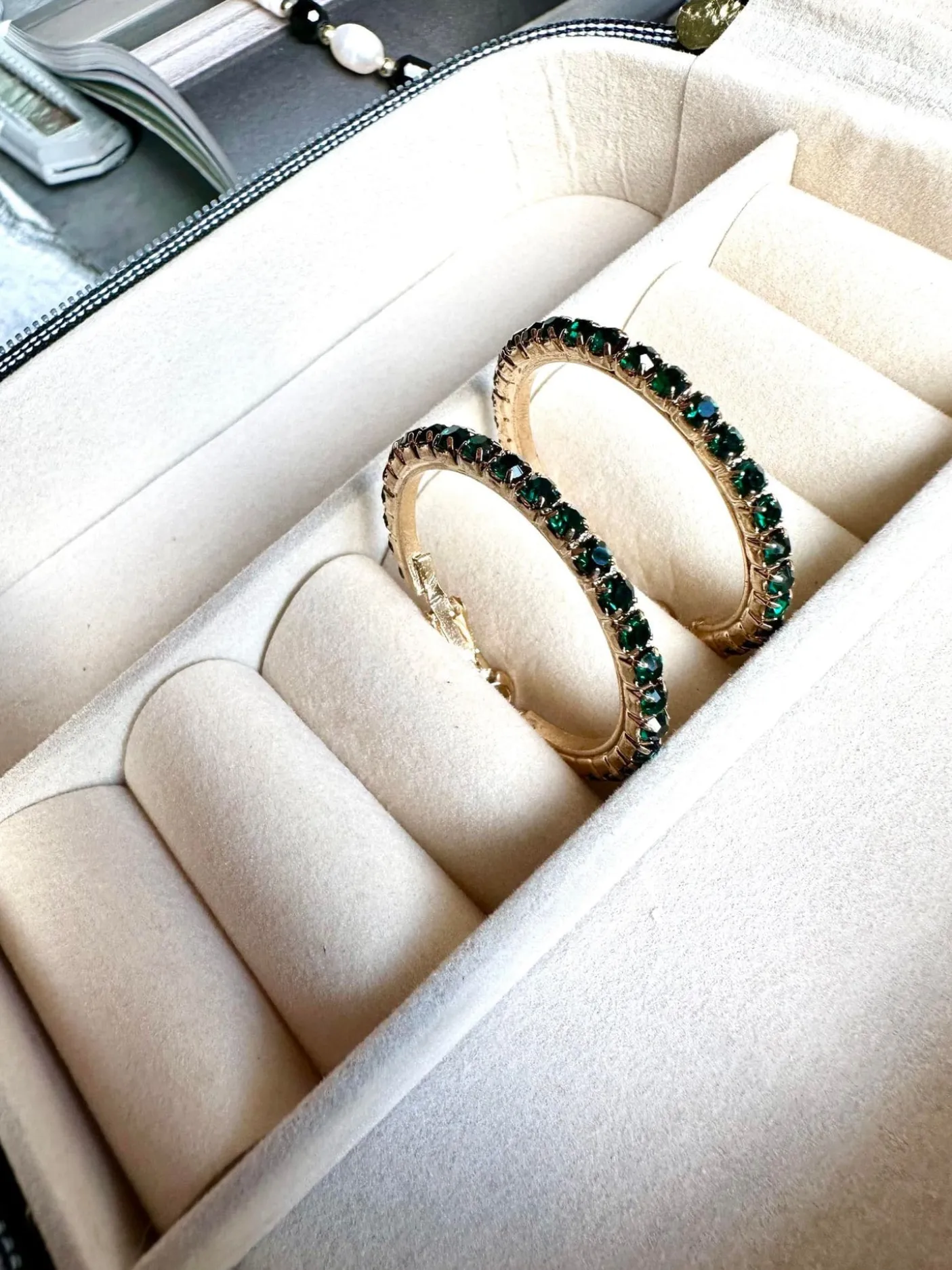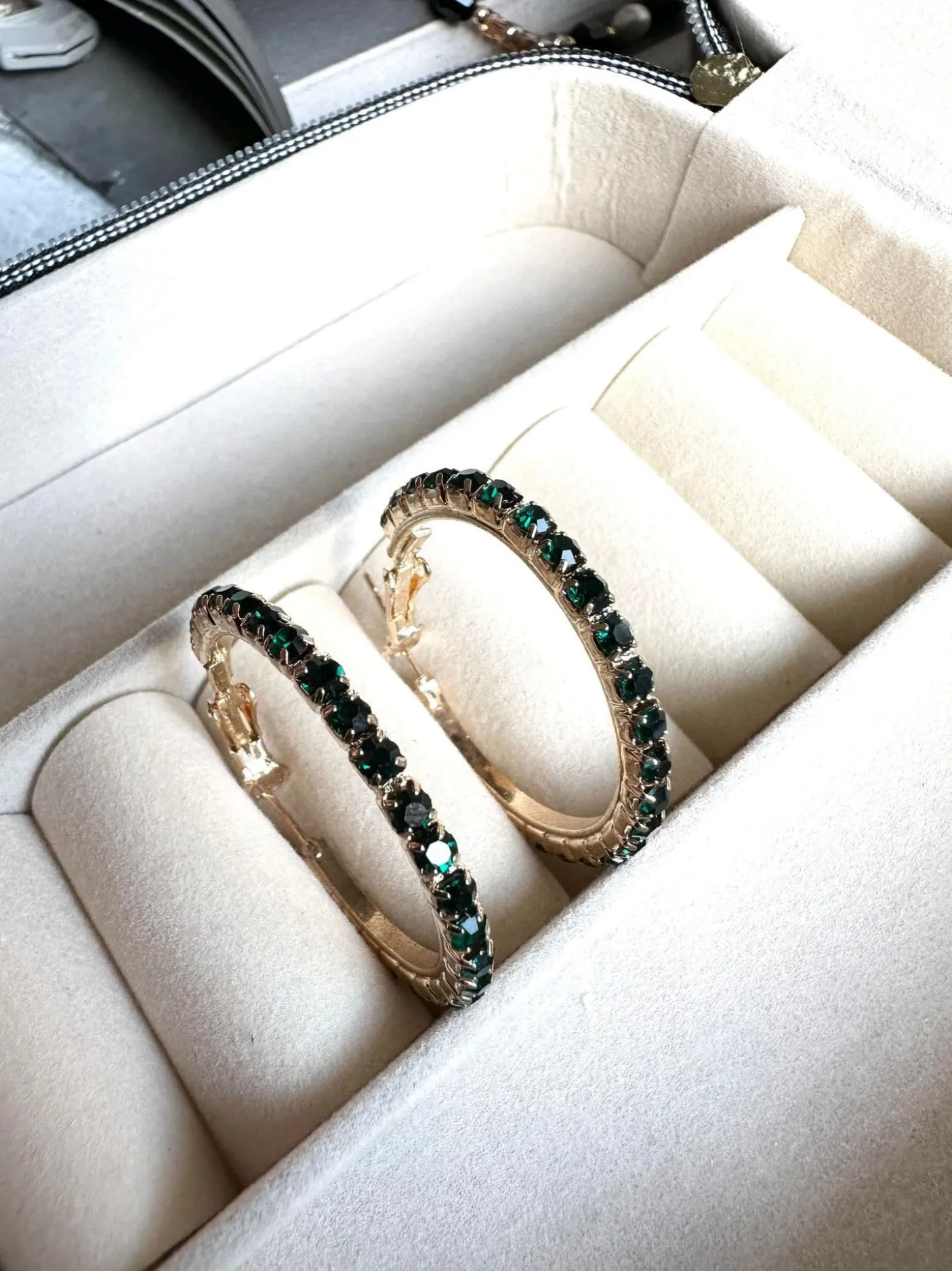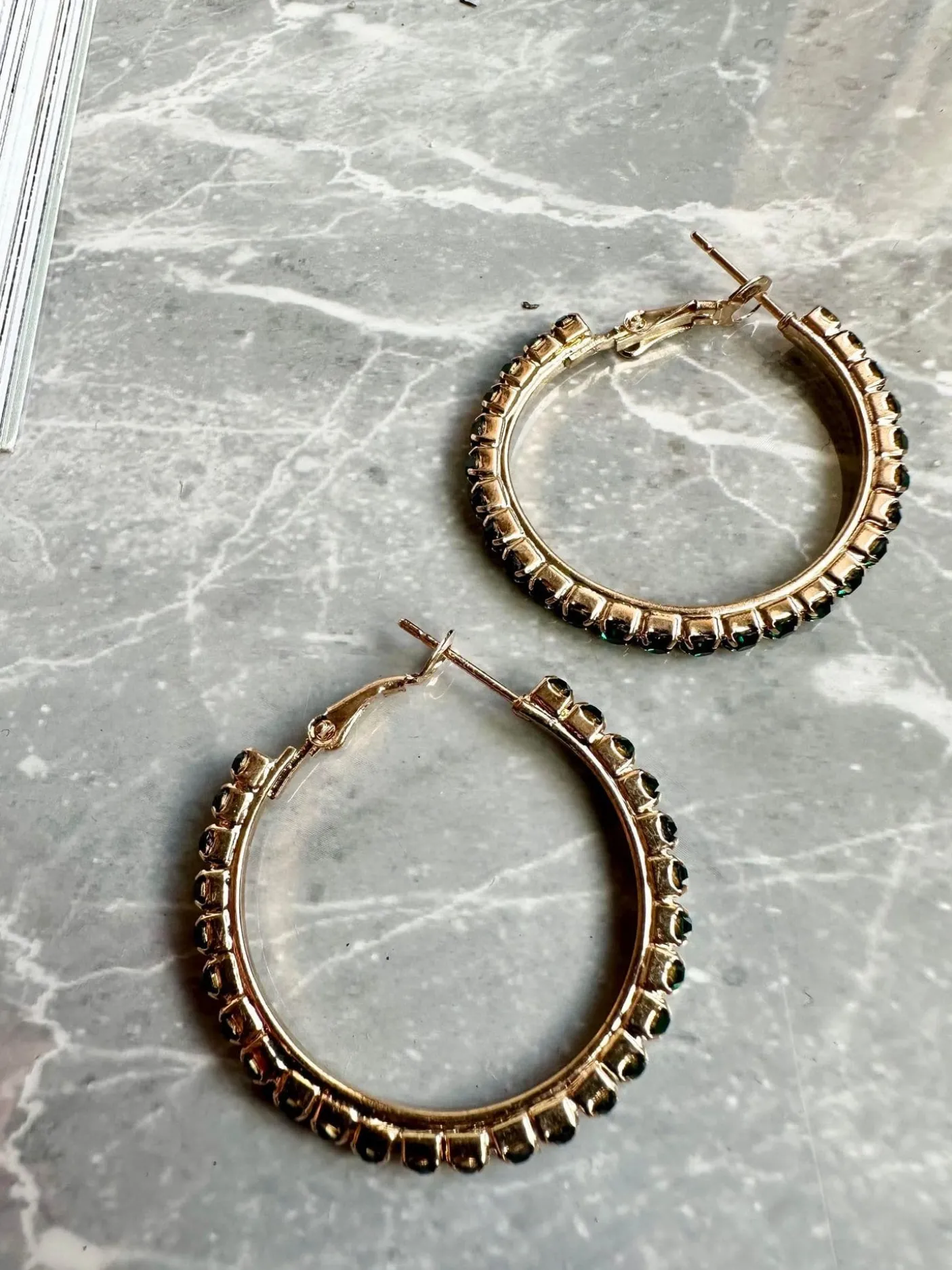 Hoops udført i messing forgyldt med 18k guld , isatte sten i mørkgrøn.