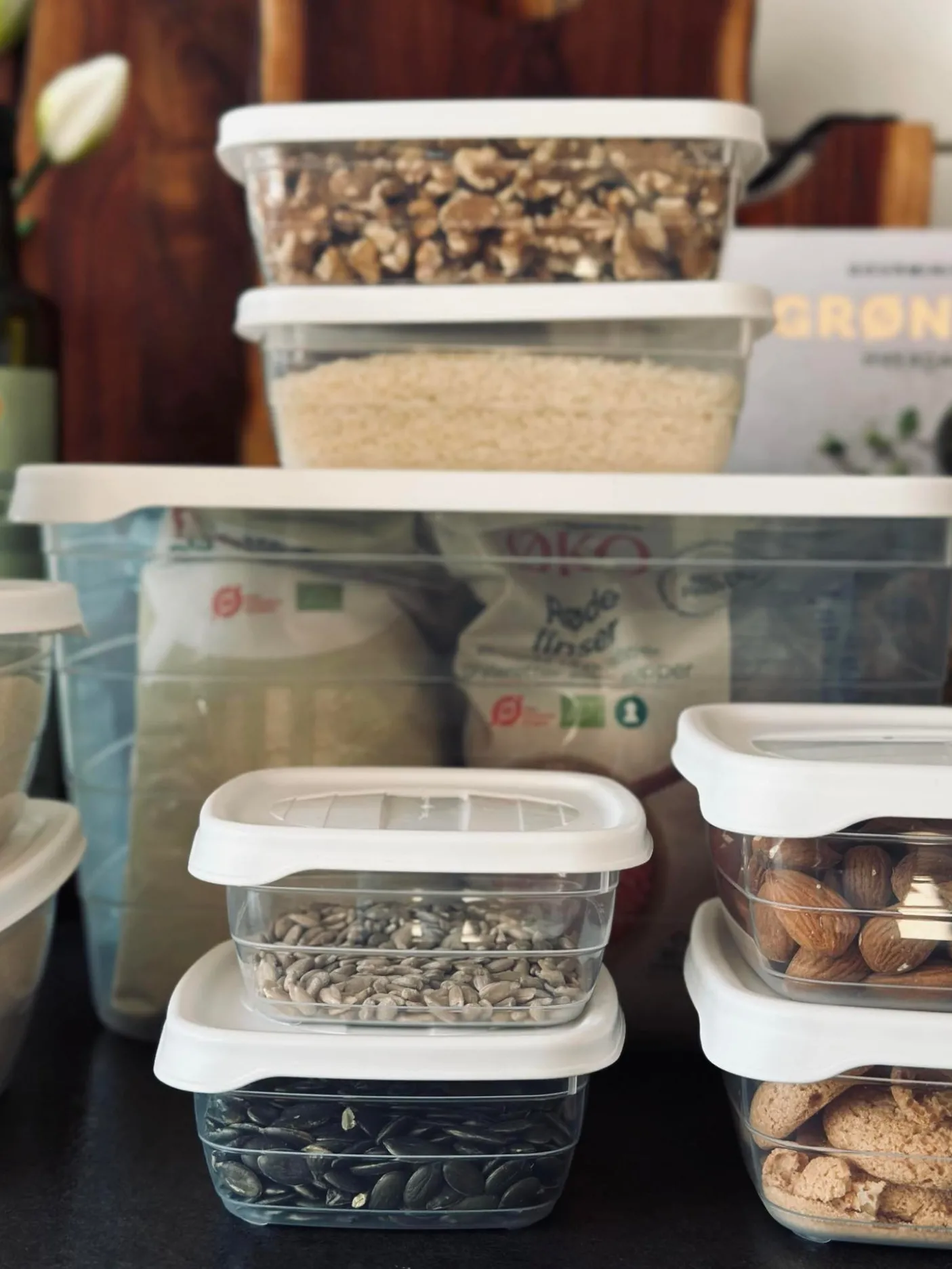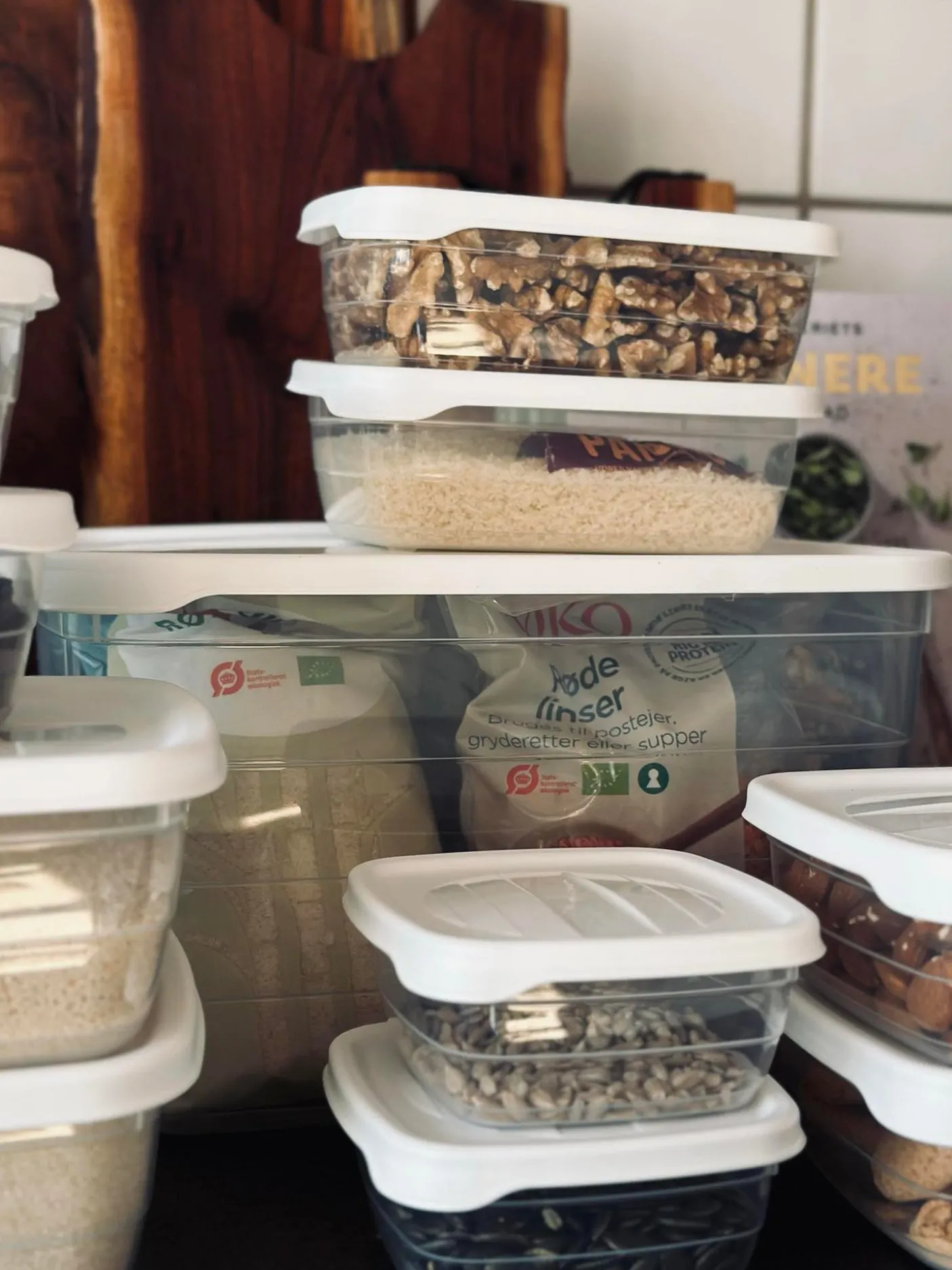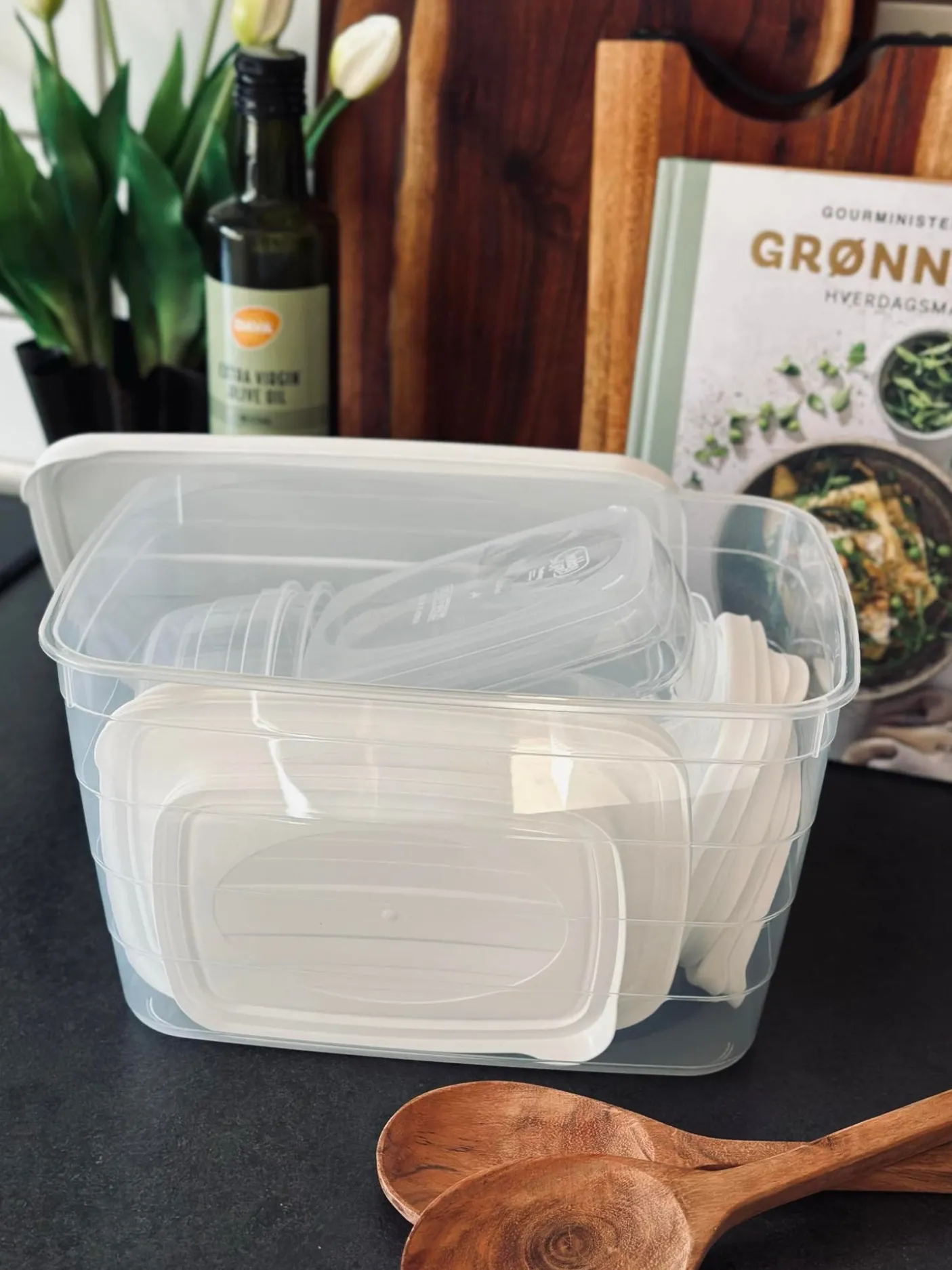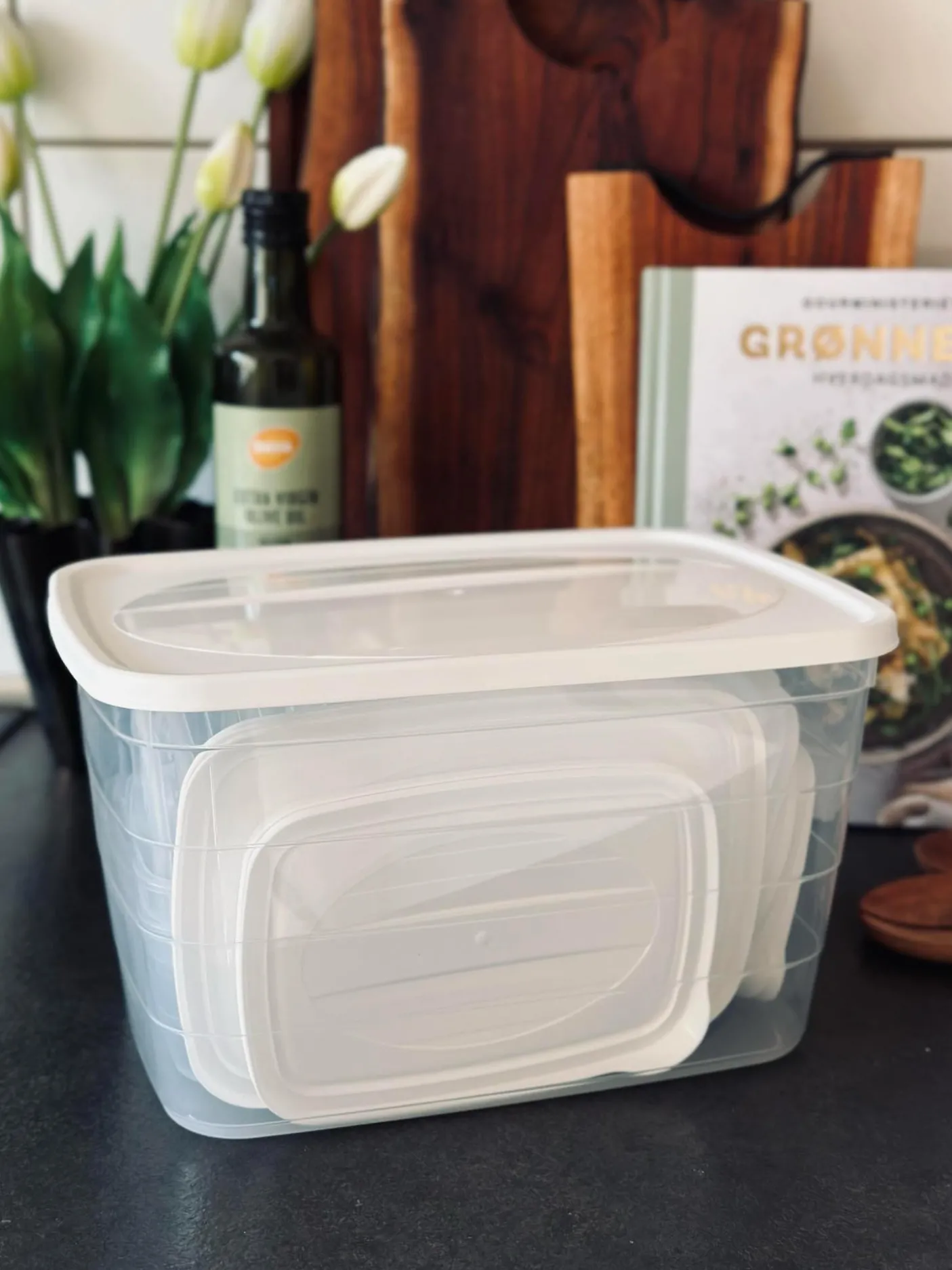 Opbevaringsbøtter med låg i gennemsigtigt plast med hvide låg.