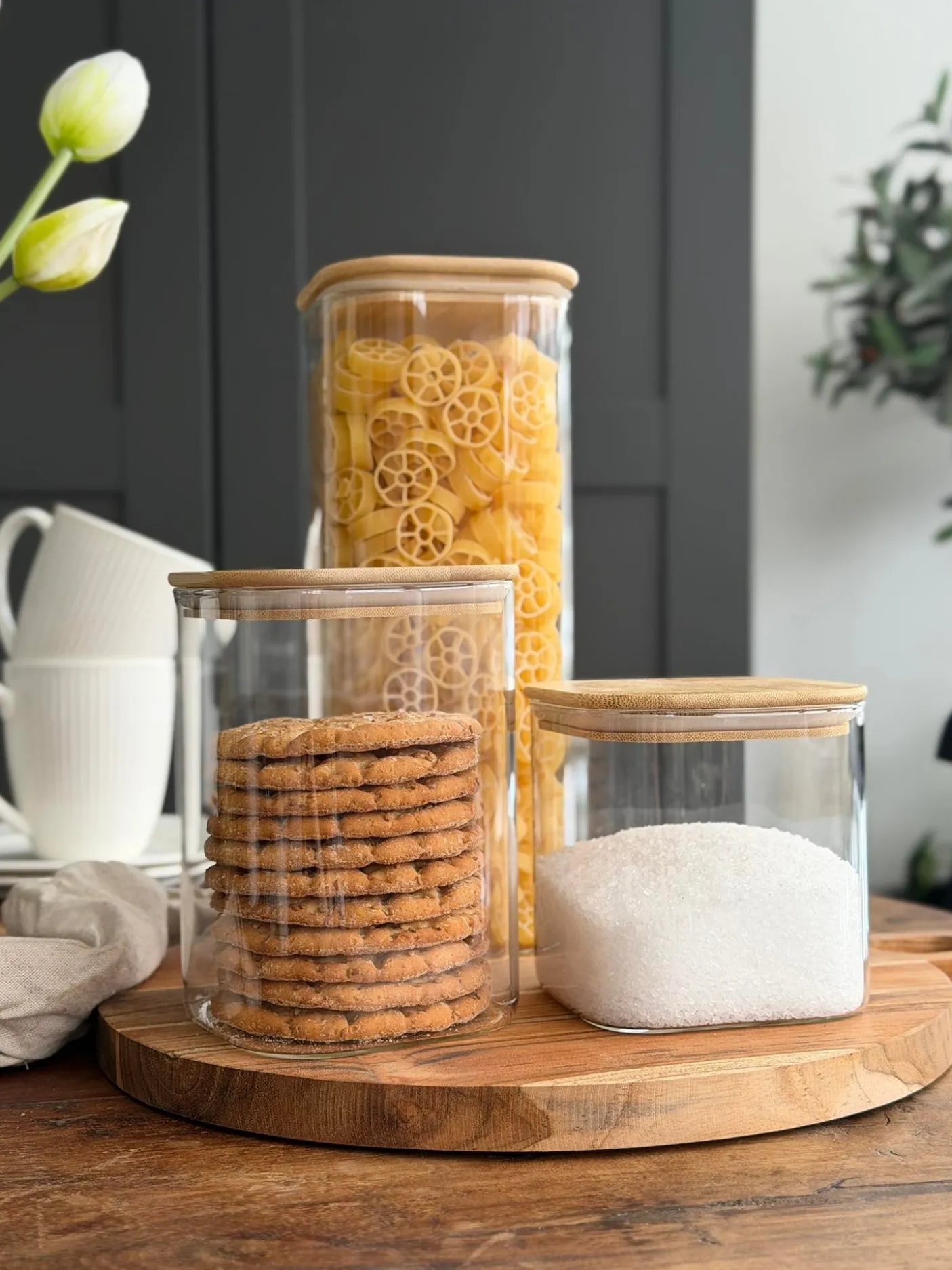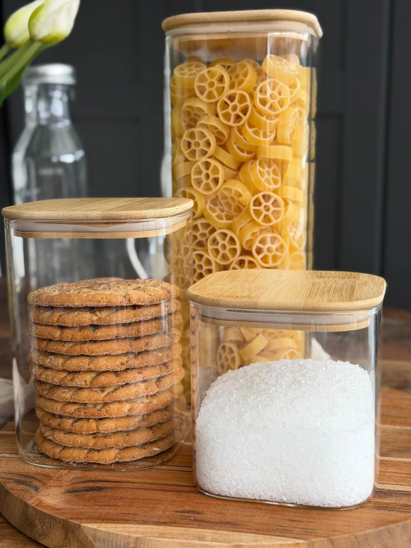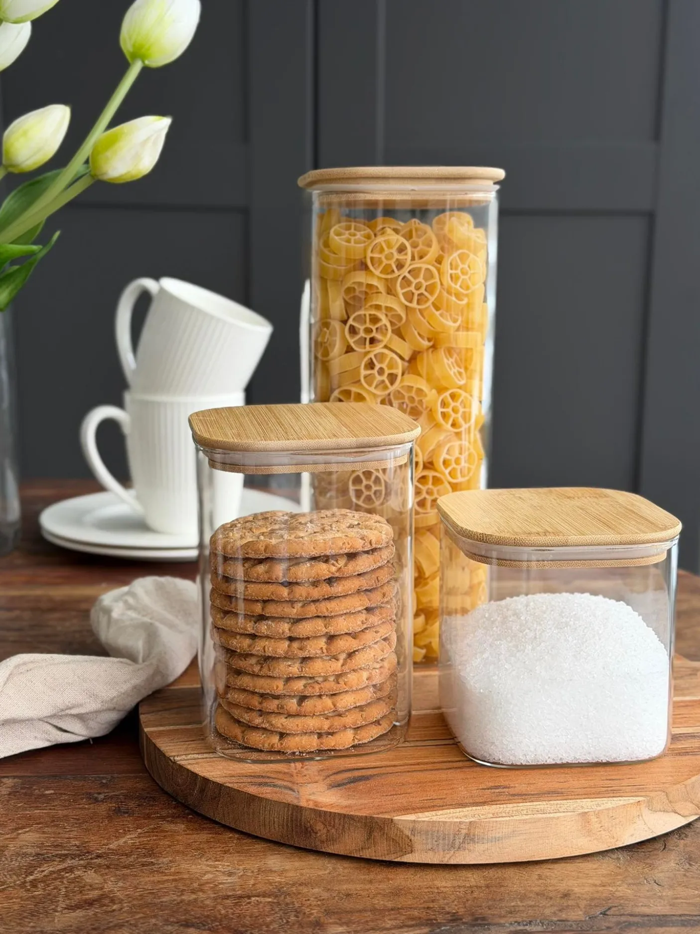 Opbevaringsglassene er i glas og har bambuslåg, som giver et enkelt og varmt look, der passer ind i mange køkkener og indretninger.