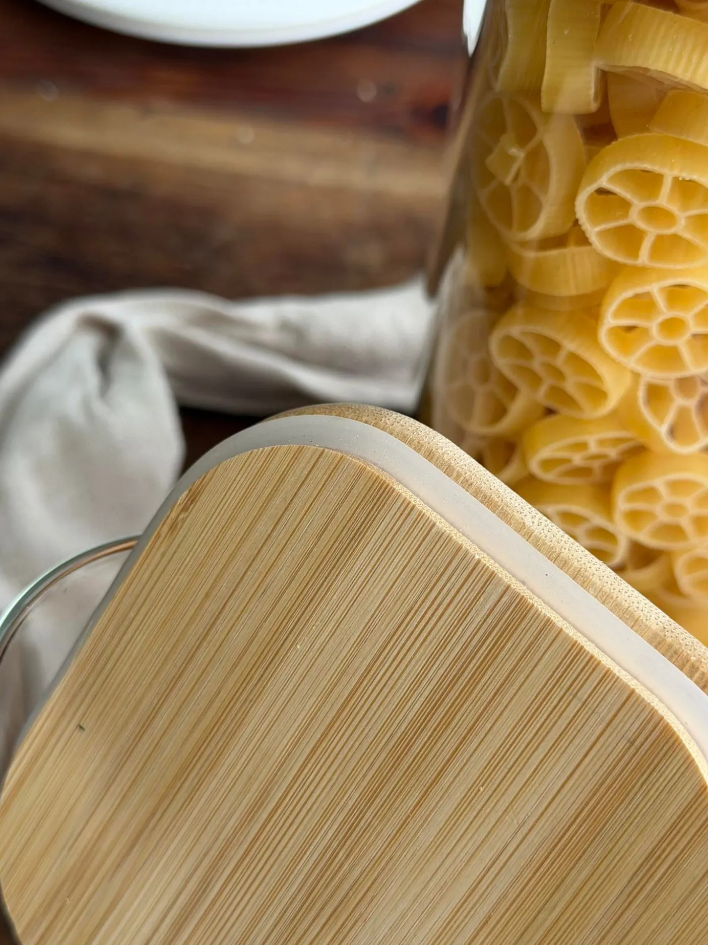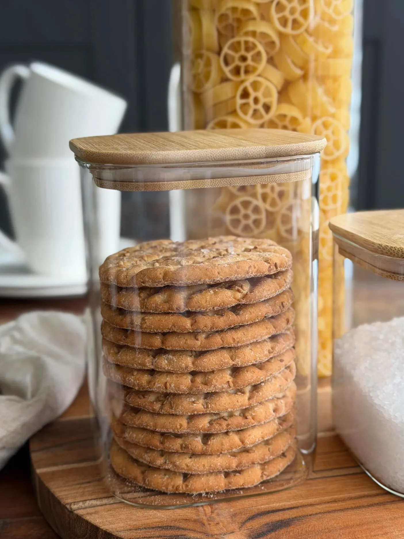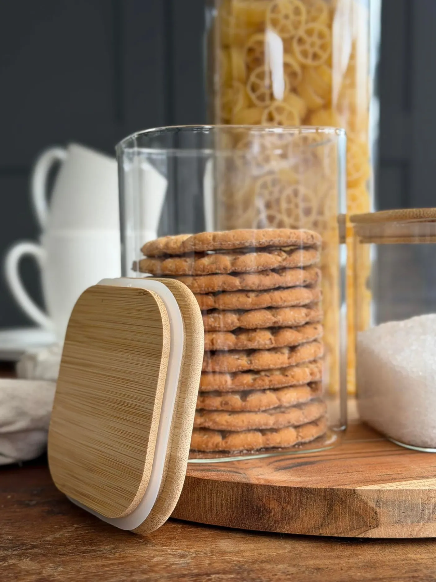 Opbevaringsglassene er i glas og har bambuslåg, som giver et enkelt og varmt look, der passer ind i mange køkkener og indretninger.