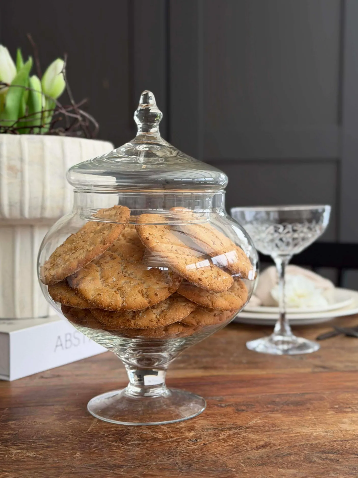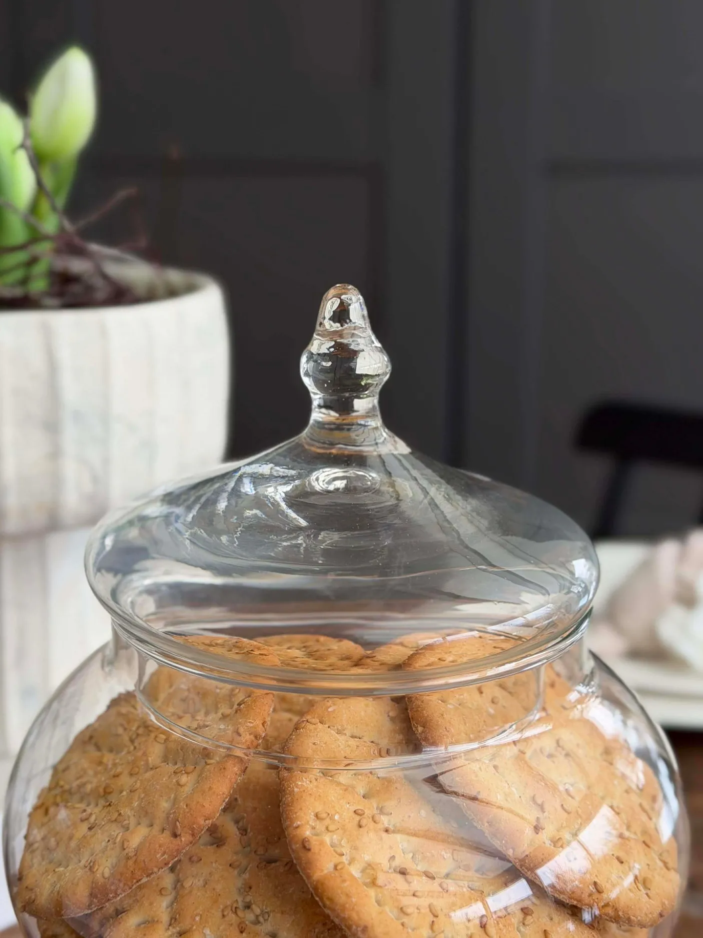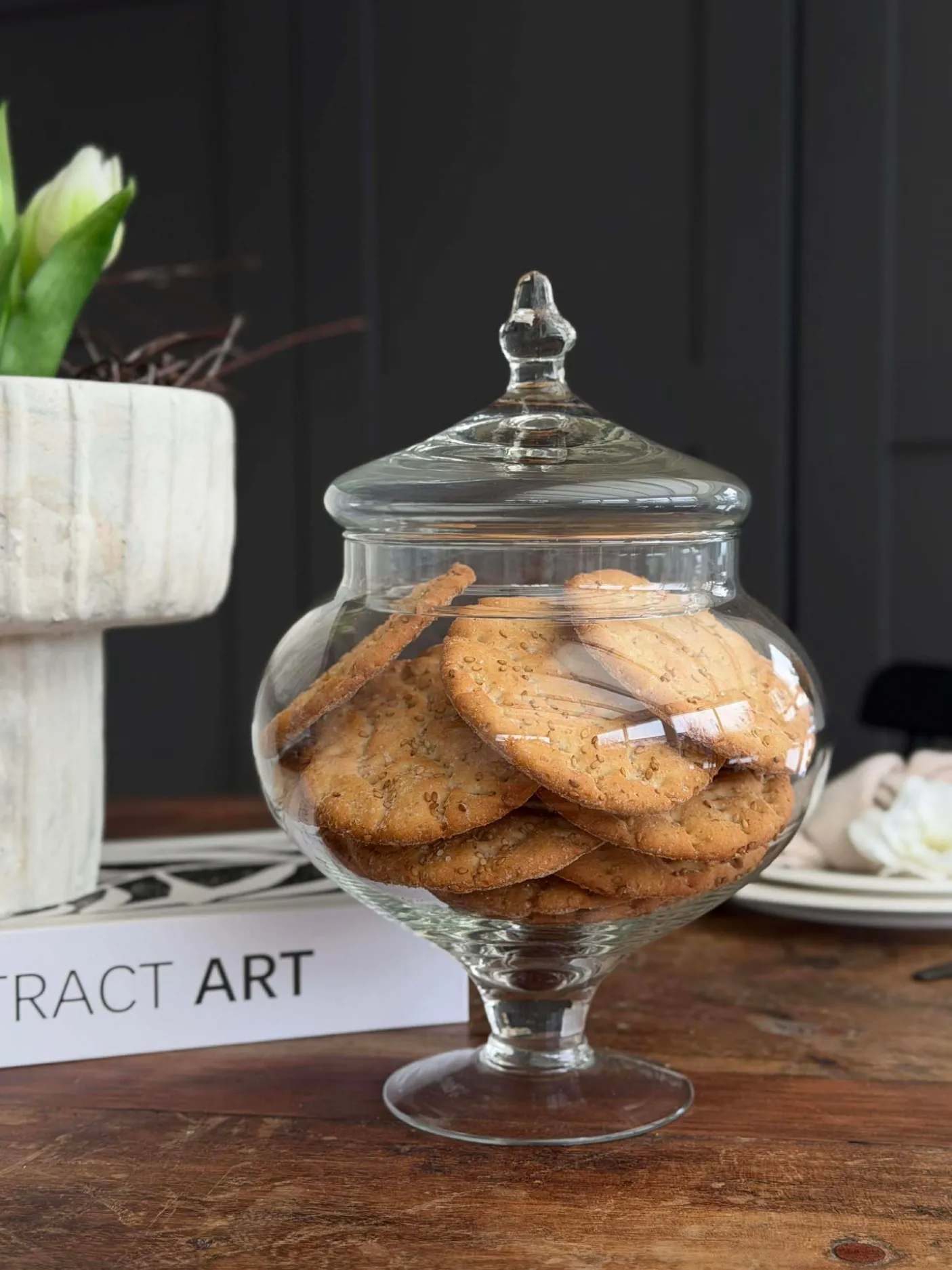 Glasset er udført i glas og har et let og klassisk look, hvor både fod og låg er med til at give det et dekorativt præg på køkkenhylden eller bordet.