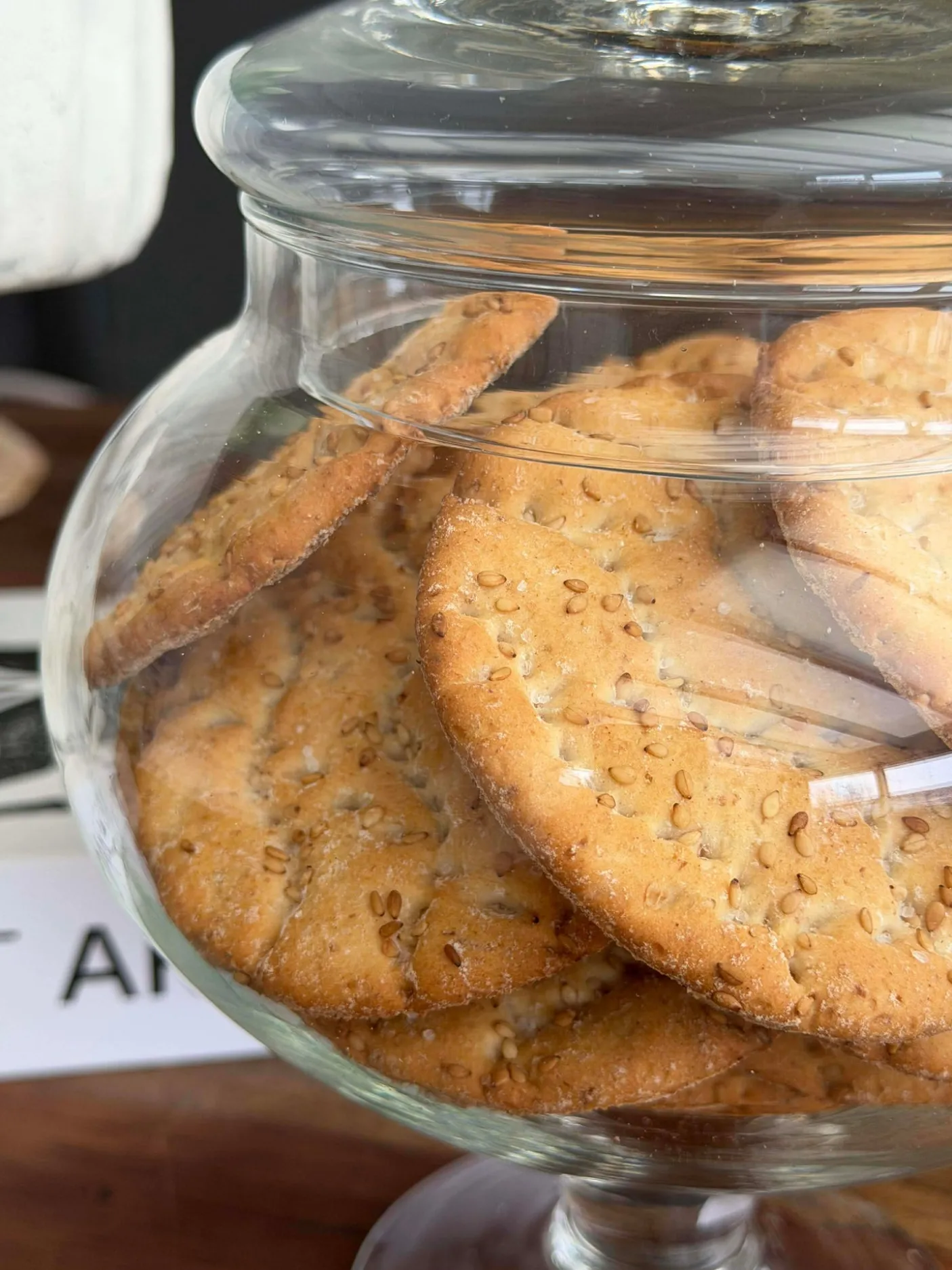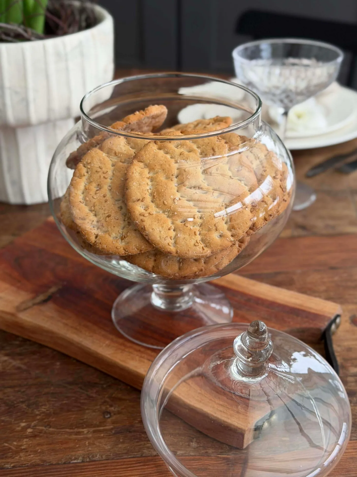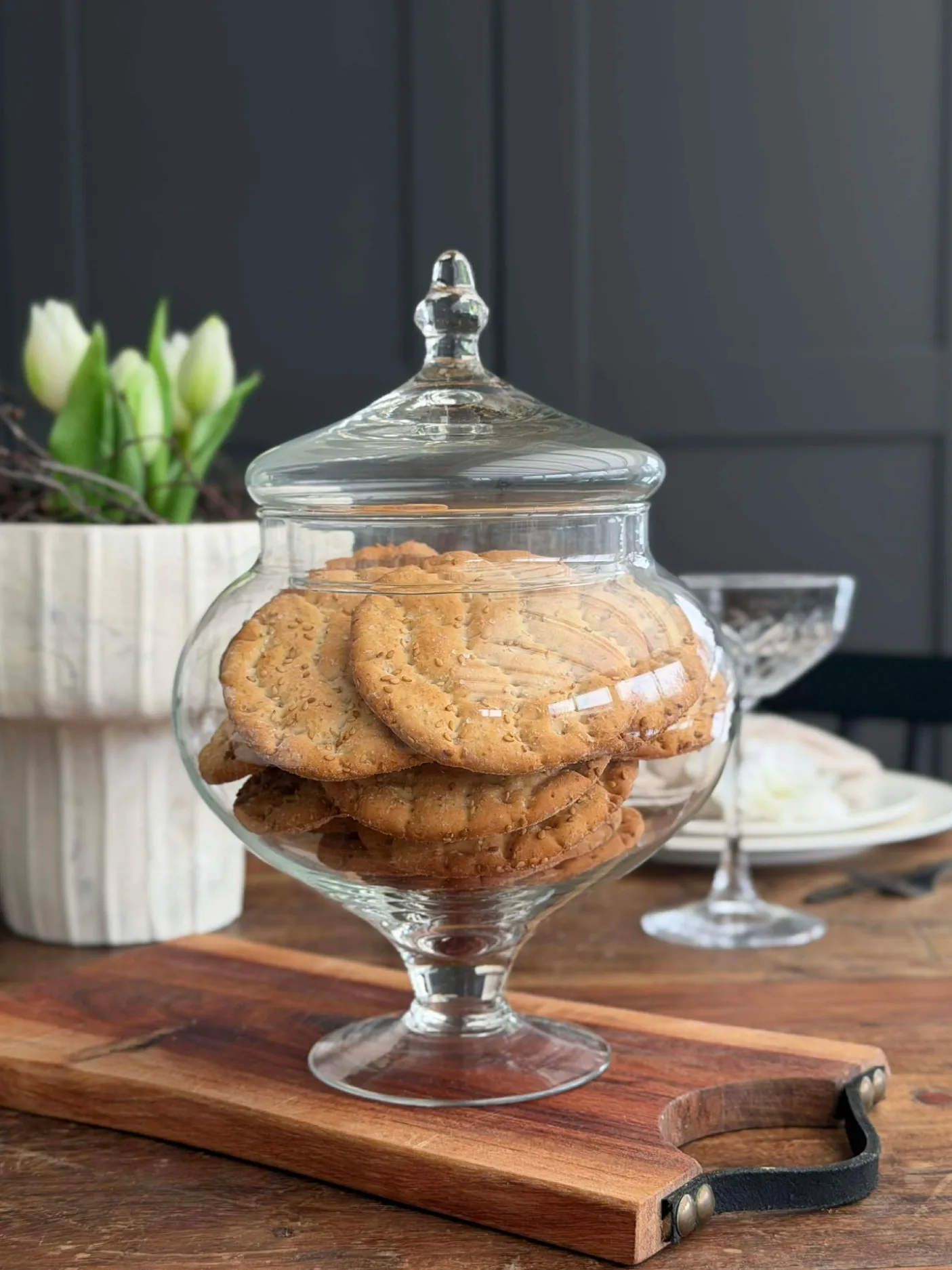Glasset er udført i glas og har et let og klassisk look, hvor både fod og låg er med til at give det et dekorativt præg på køkkenhylden eller bordet.